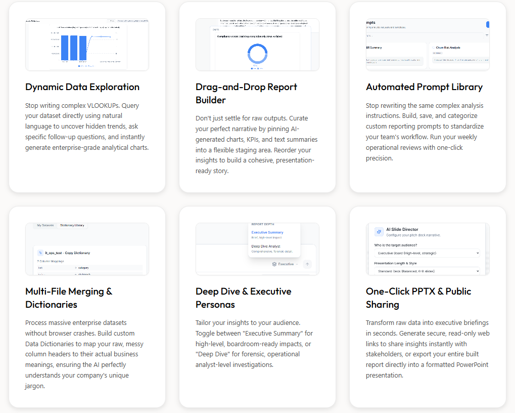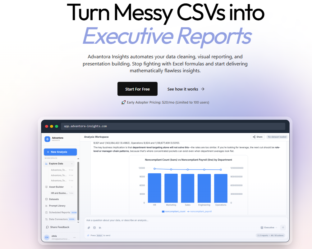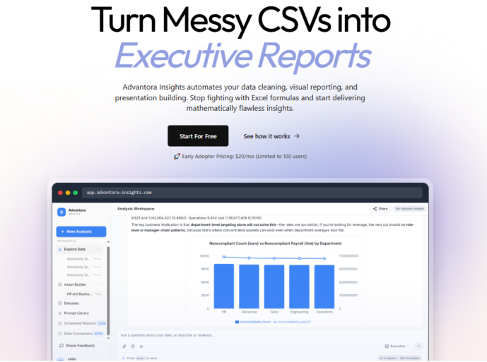 Advantora Insights provides a powerful solution for professionals who need to transform raw data into polished presentations. You can easily turn messy CSV files into professional, branded executive reports in just seconds. The platform leverages artificial intelligence to automate the most time-consuming parts of the data process, including data cleaning, merging multiple files, and professional PDF generation. This tool helps you save hours of manual work by handling the formatting and organization for you, allowing you to focus on the insights rather than the spreadsheet management.