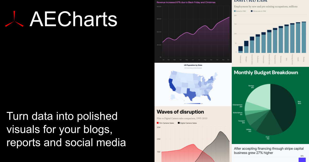 AECharts allows you to create professional animated charts for pitch decks, client reports, and business presentations. You can transform your data into engaging visuals and export your work as MP4, PNG, or JPEG files in seconds. This tool helps you enhance your storytelling in videos and meetings with high-quality data visualizations designed for business contexts.