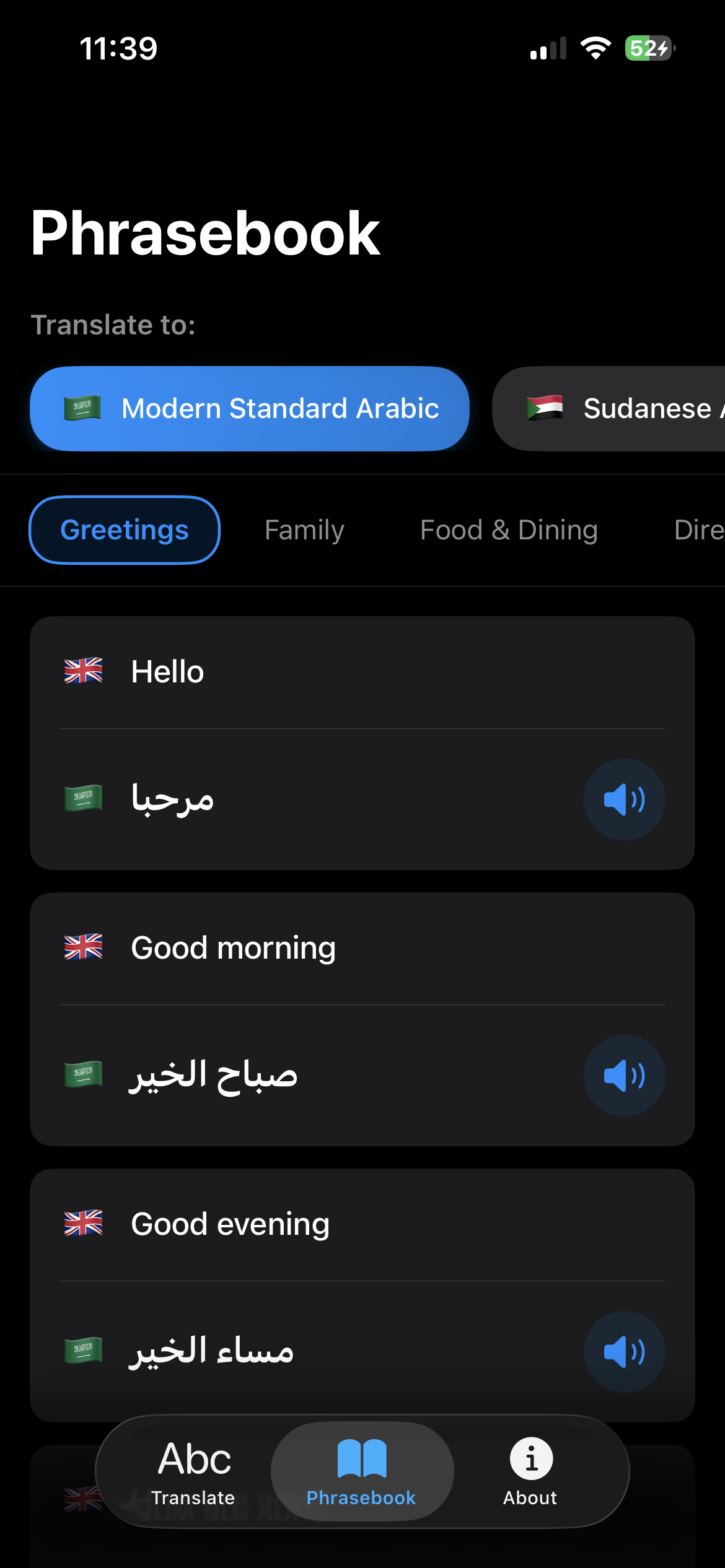 Translate between English and nine Arabic dialects with voice support and offline phrasebooks. Ideal for students and families. Start for free on mobile.