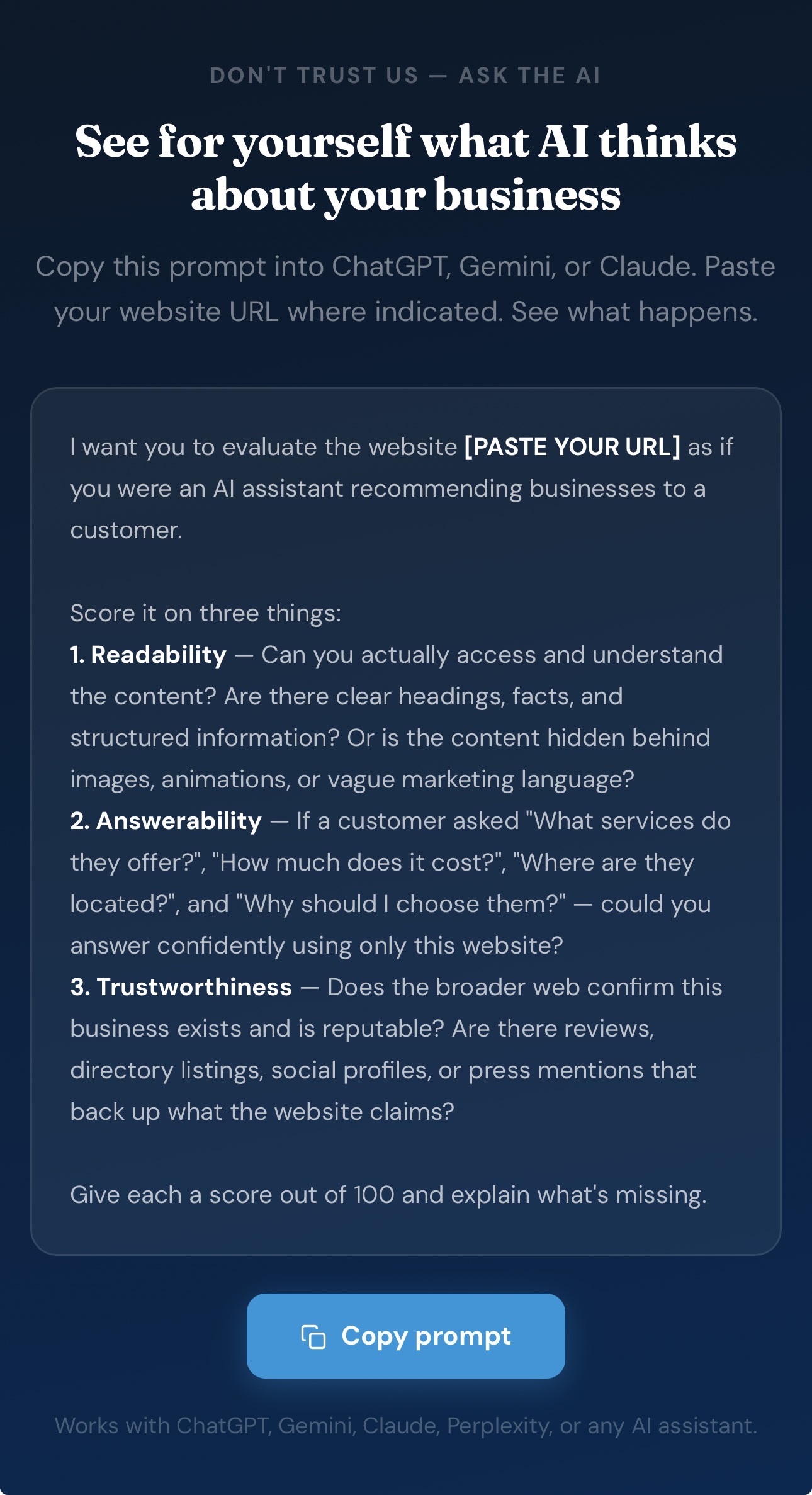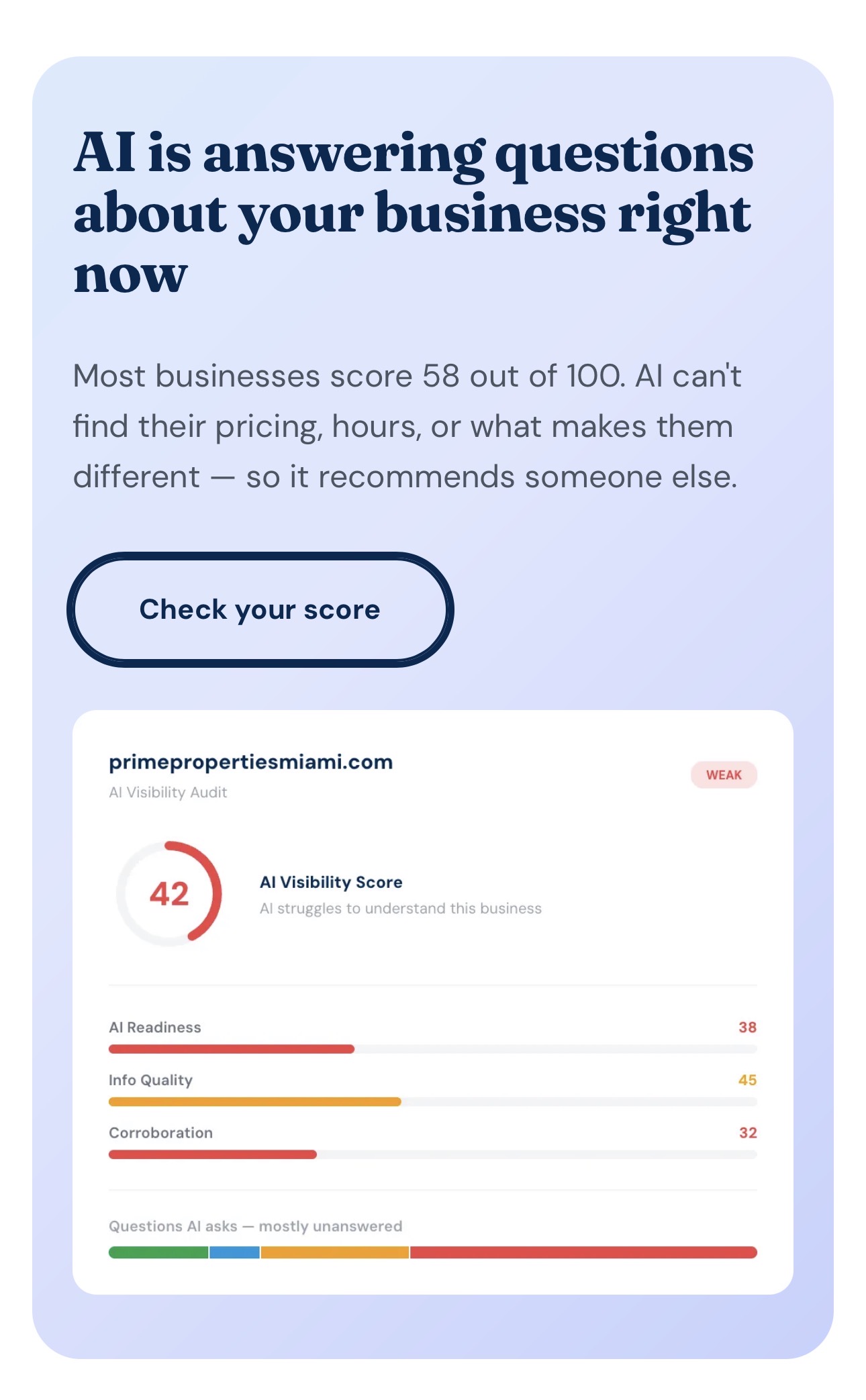 Optimize how AI sees your business with audits and ready-to-deploy fix kits. One-time pricing for Small Businesses and Marketers.