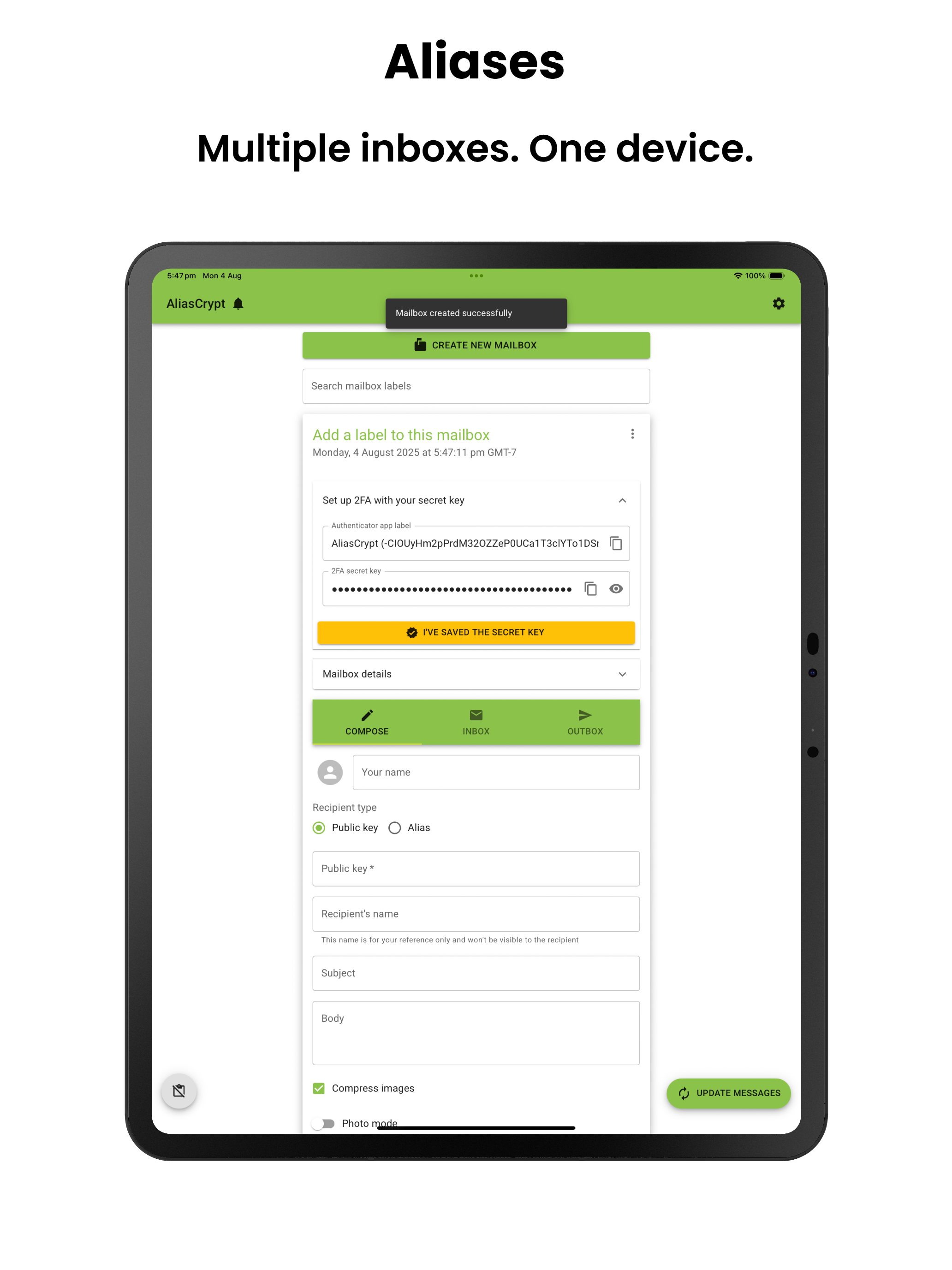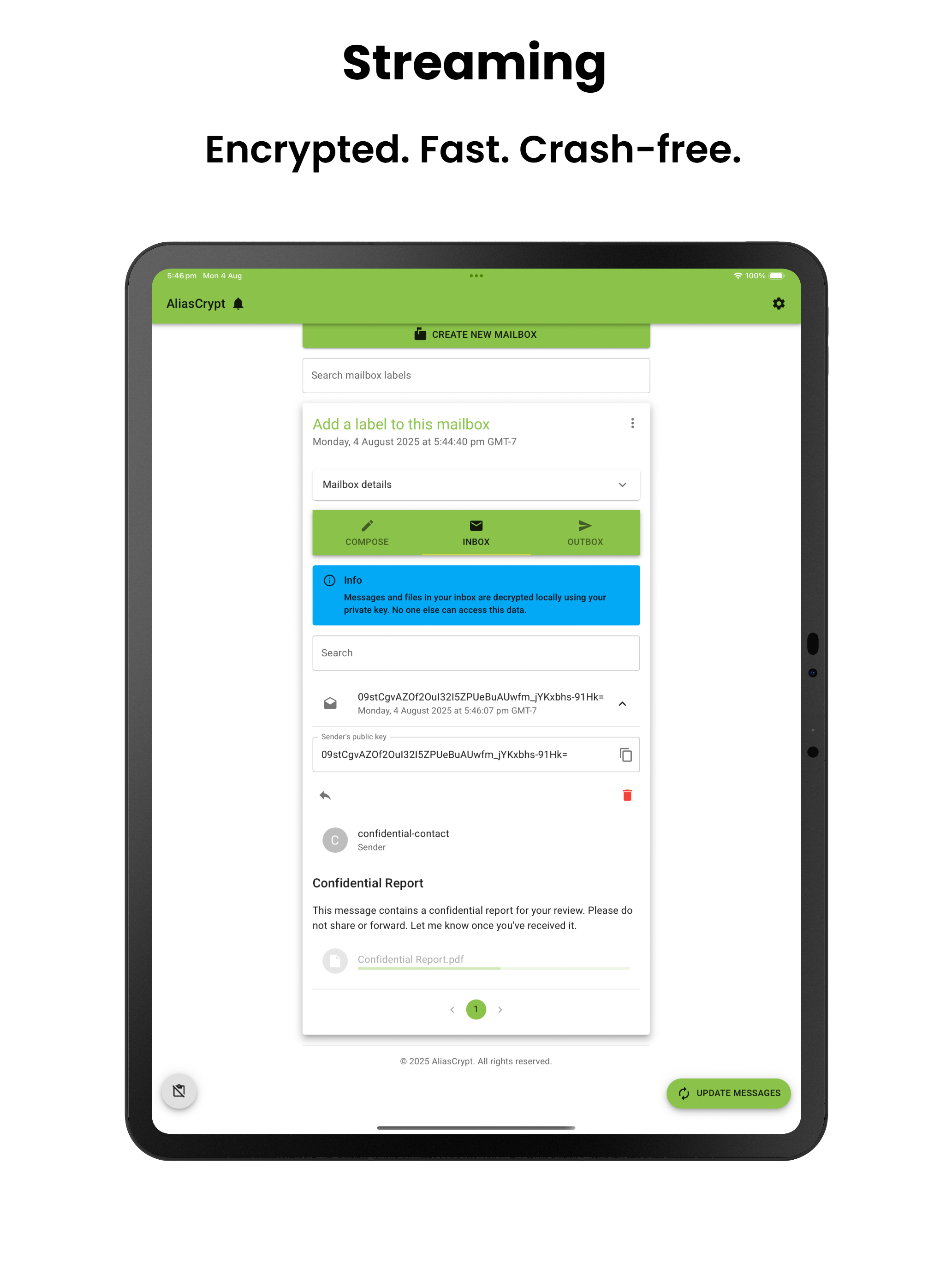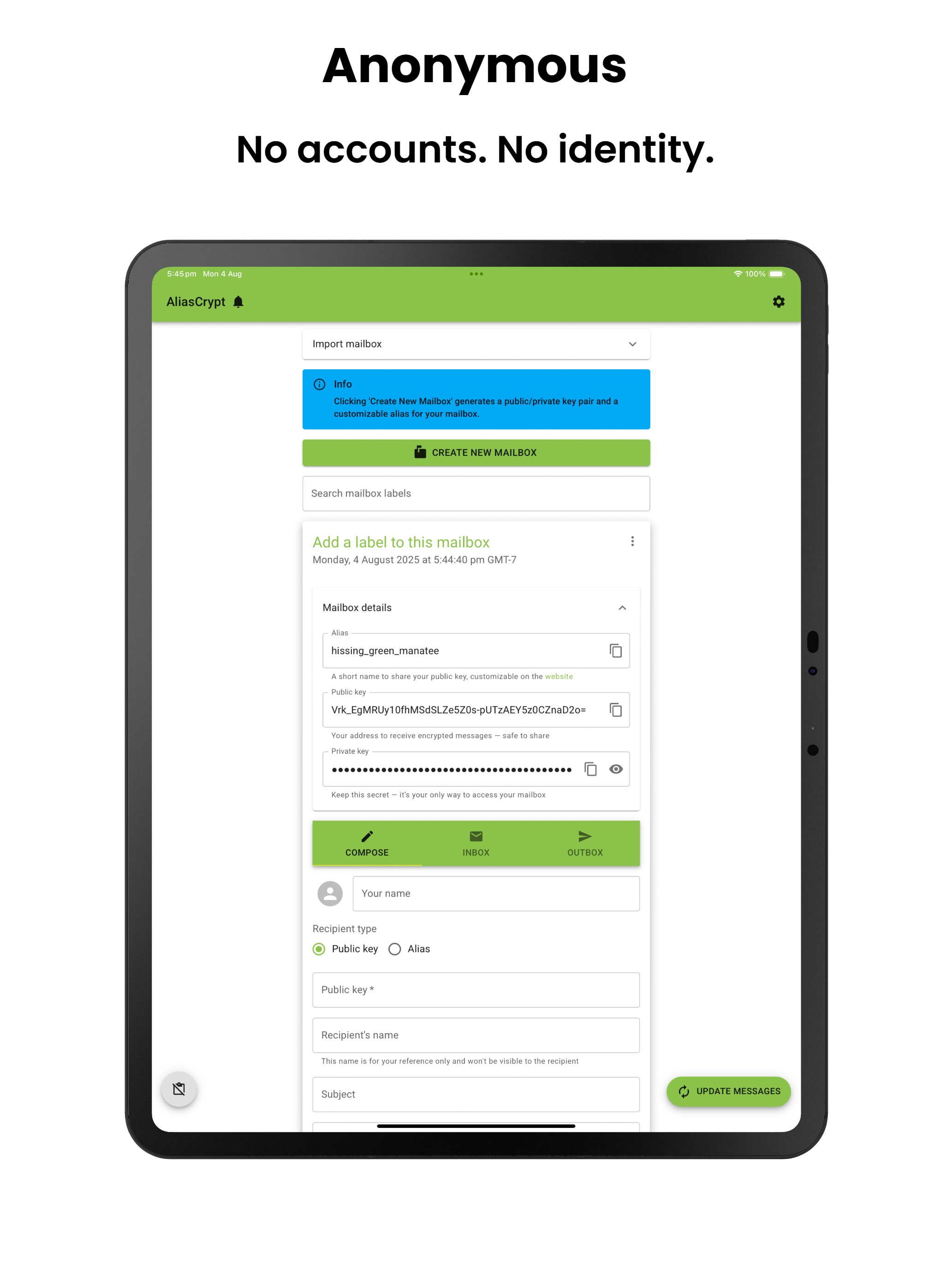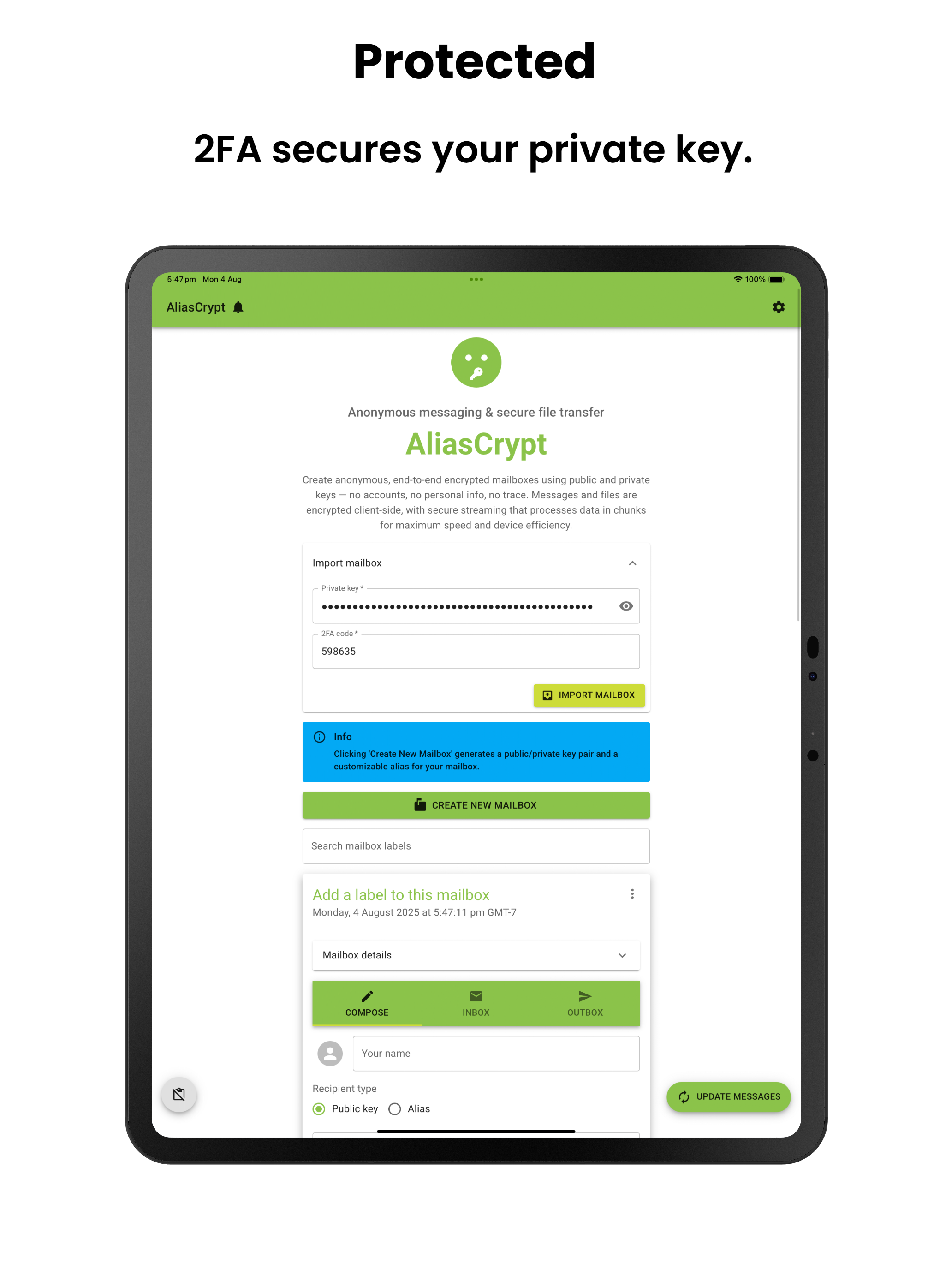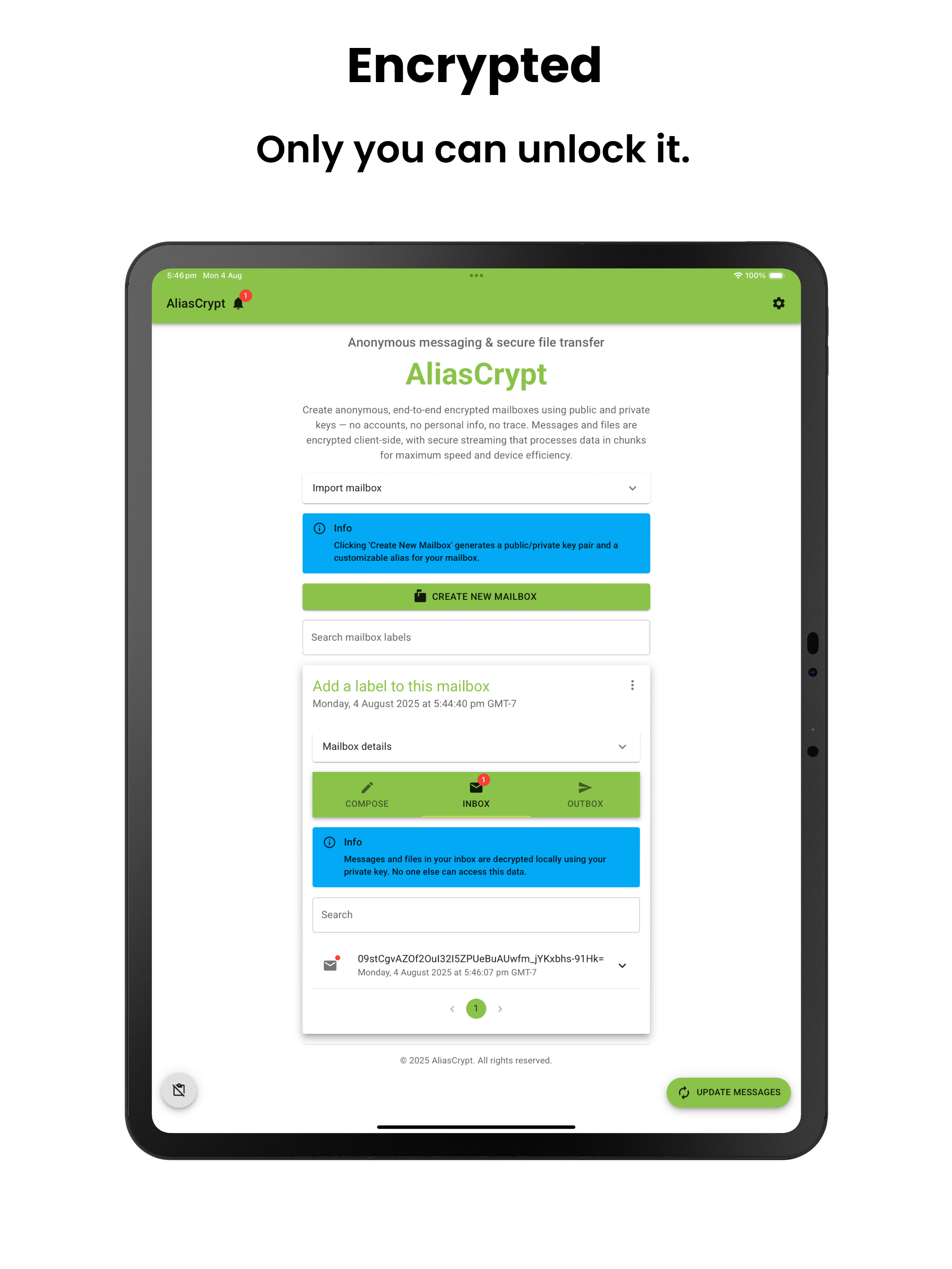 AliasCrypt is a privacy-focused tool for sending messages and files without accounts or personal details. You generate an encrypted mailbox with a public and private key — your public key is shared to receive, and your private key is the only way to open what’s sent. Messages self-destruct after delivery, and files up to 4GB are encrypted and streamed in chunks so they’re never stored on a server. AliasCrypt makes private communication simple for individuals, professionals, and businesses who need real security without complexity.