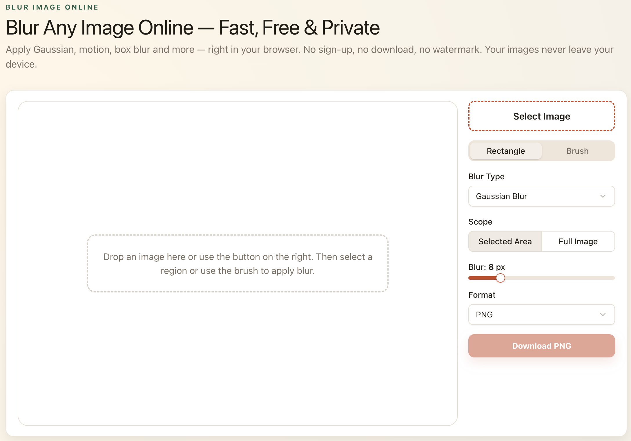 Free online tool to blur images instantly. Choose from Gaussian, motion, or box blur. No registration required. 100% private — all processing happens in your browser.