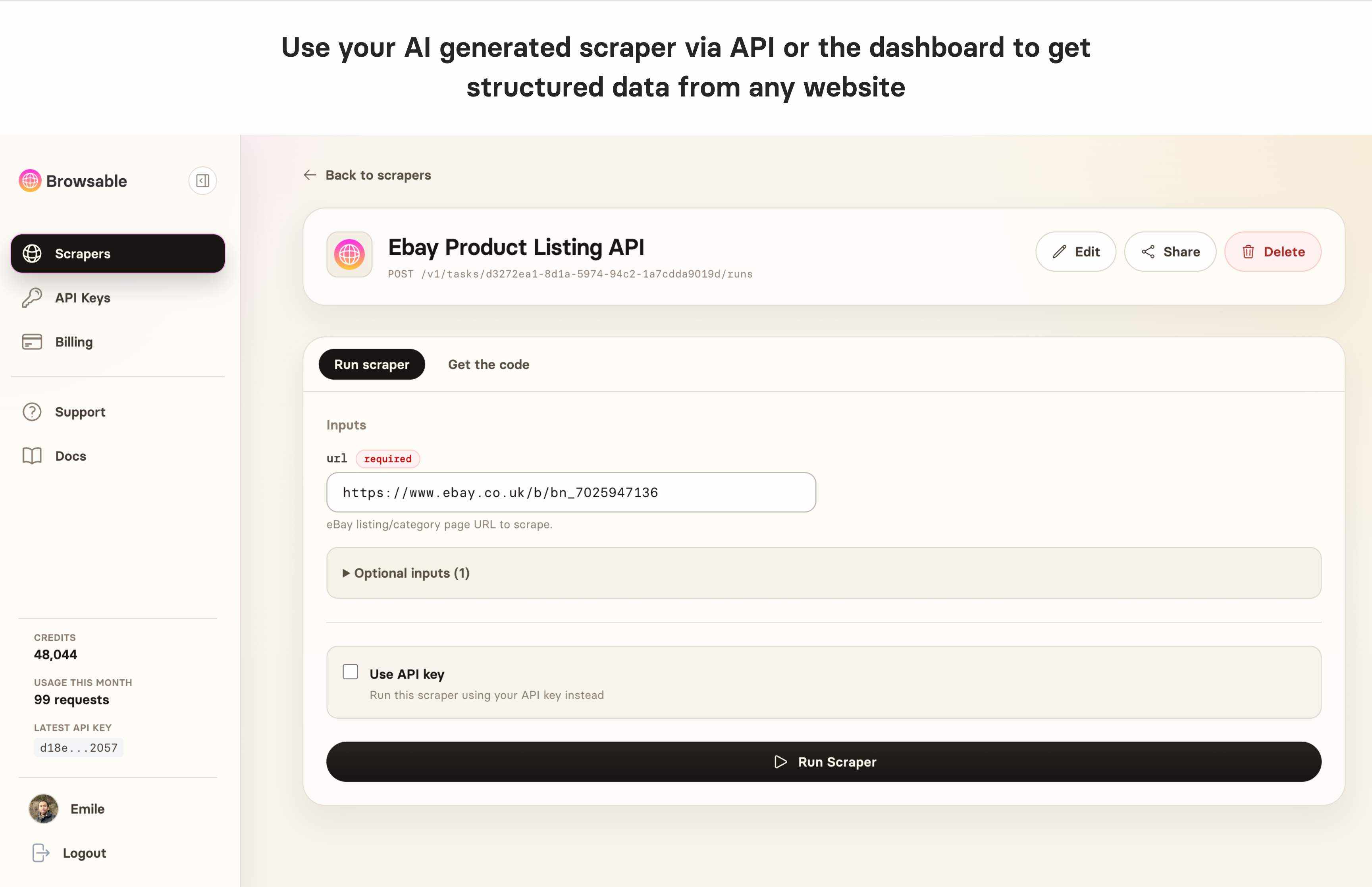 Browsable is an AI web scraper that turns any webpage into a reusable scraping API. Provide a URL and it will analyze the page, determine what data can be extracted, and reverse engineer the structure to generate an API. The generated API works not just for the page you provide, but for any page with the same structure. For example, if you create a scraper for https://youtube.com/@mrbeast, Browsable will generate an API that can scrape any YouTube channel by passing the channel name as a parameter. Many websites contain valuable data that businesses, individuals, and AI agents need, but most do not provide APIs to access it. Browsable solves this by automatically generating APIs for any website, allowing you to download the data you need or integrate it directly into your own applications.