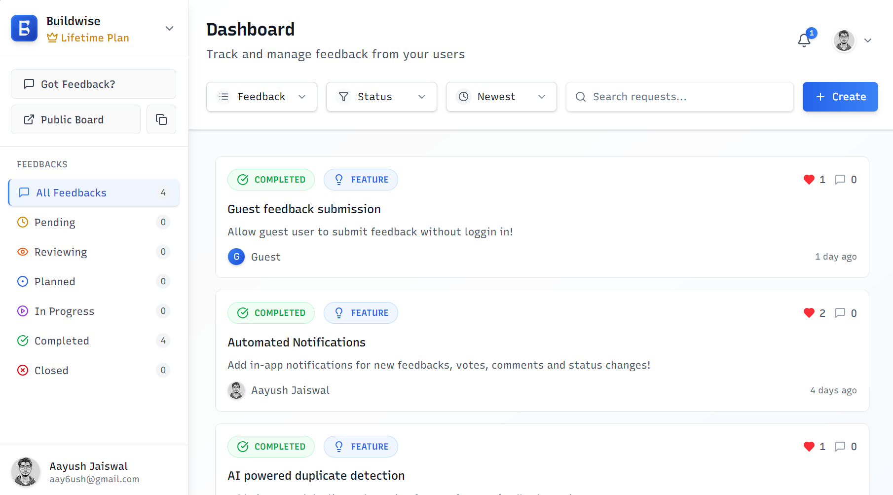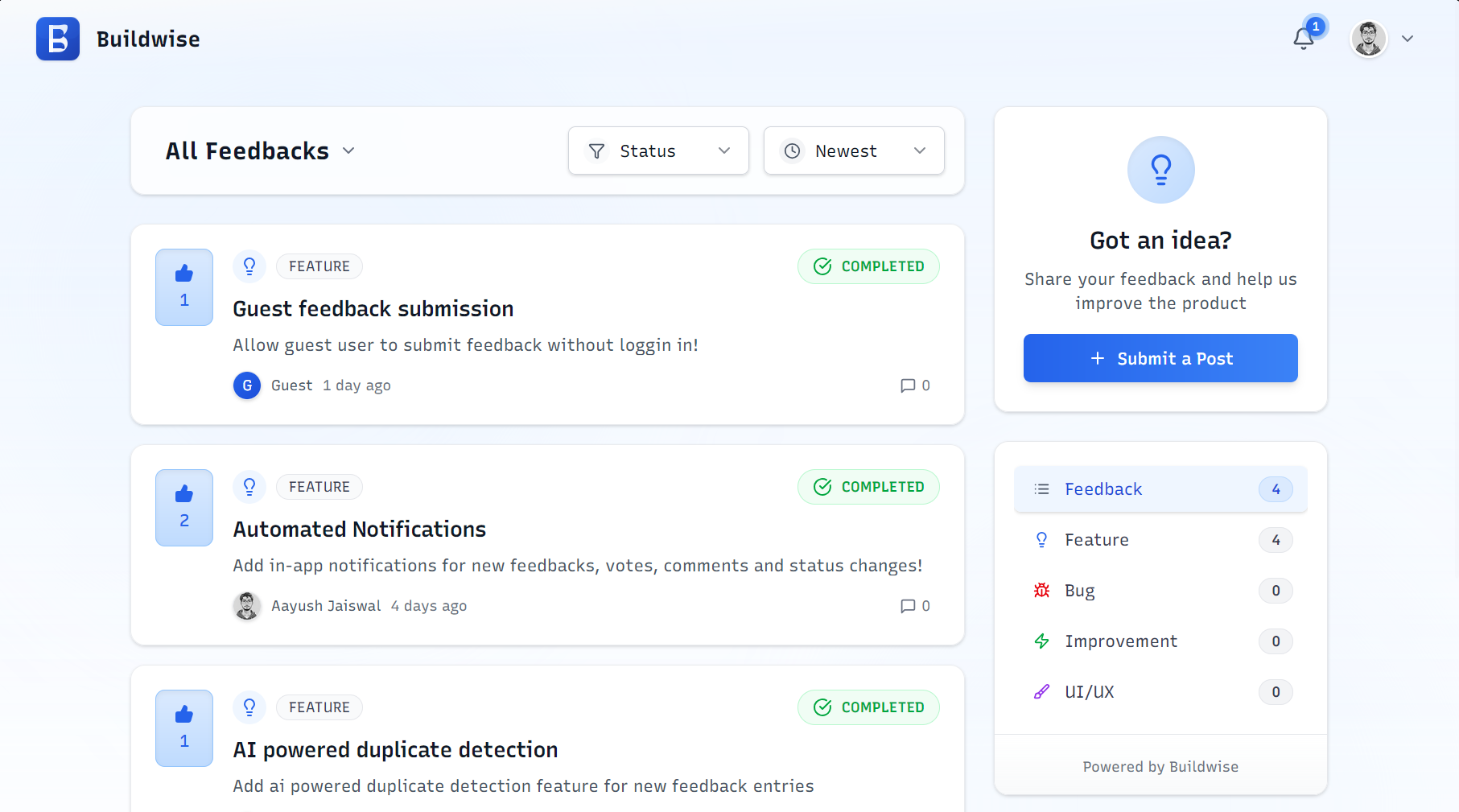 Buildwise is a SaaS that helps solo founders and small teams collect, organize, and prioritize user feedback. With Buildwise, you can set up a public board where anyone can submit their feedback, and users can vote on the ideas they care about most. This makes it easy to see what your community wants, so you can focus on building the features that matter.