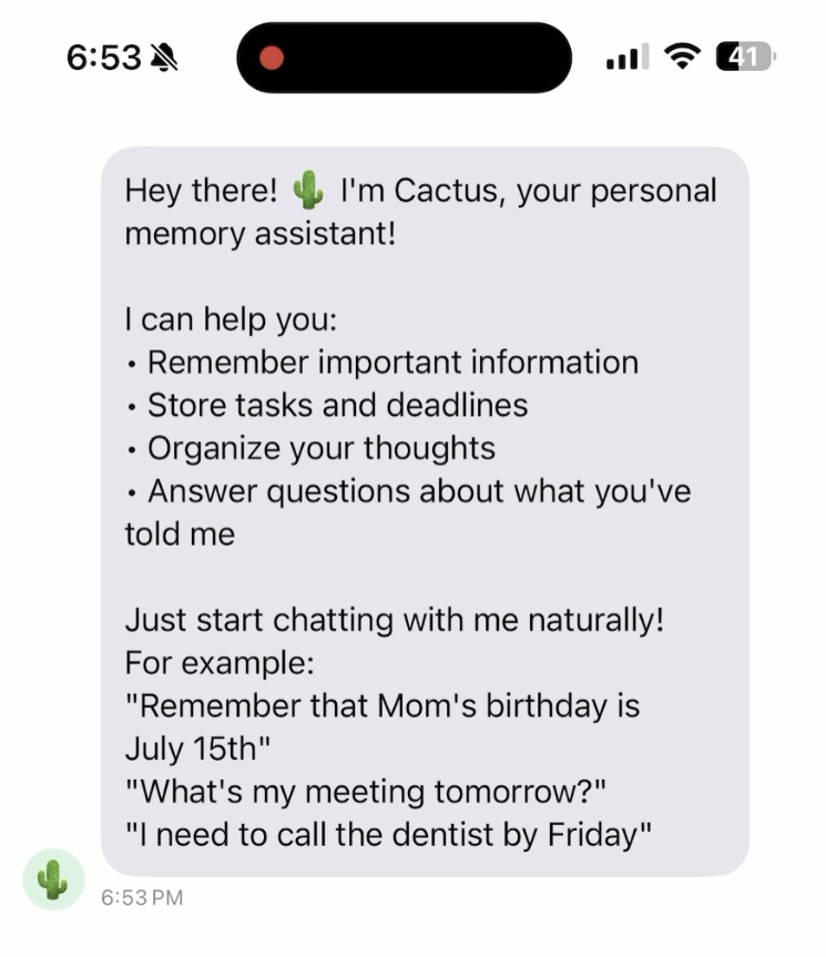 Cactus – a memory side-kick that never forgets (so you can). Talk, type, or brain-dump anything—Cactus captures it, auto-sorts it, and pings you before disasters happen. Birthday dates, taco orders, looming thesis deadlines, that random idea from the shower—all synced, categorized, and reminded at the perfect moment. It’s Notion’s messy desk + Calendar’s blank squares, stitched together by an AI that actually nags you (nicely). Stop juggling; let Cactus remember and remind, while you get back to the fun stuff. 🌵