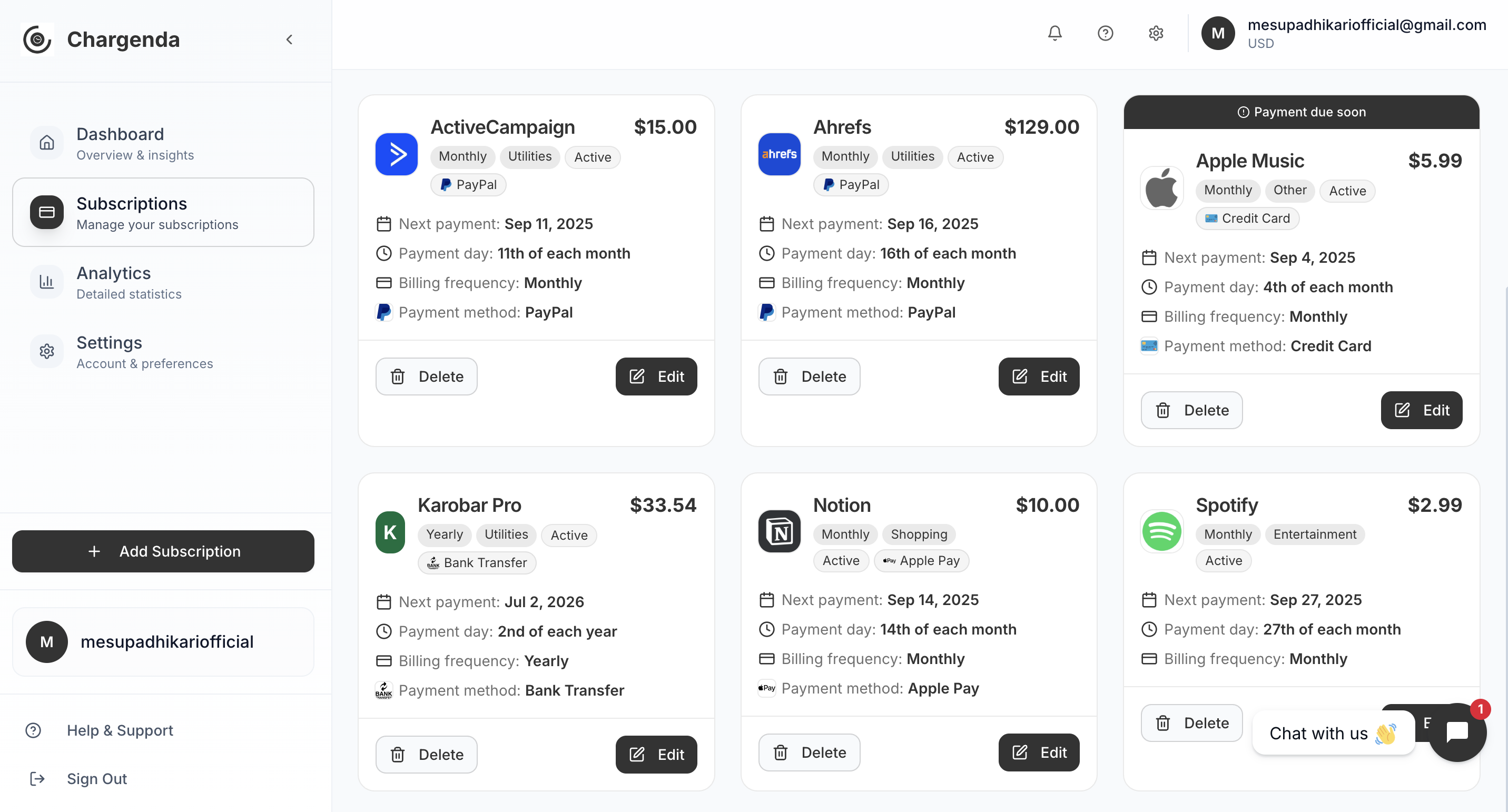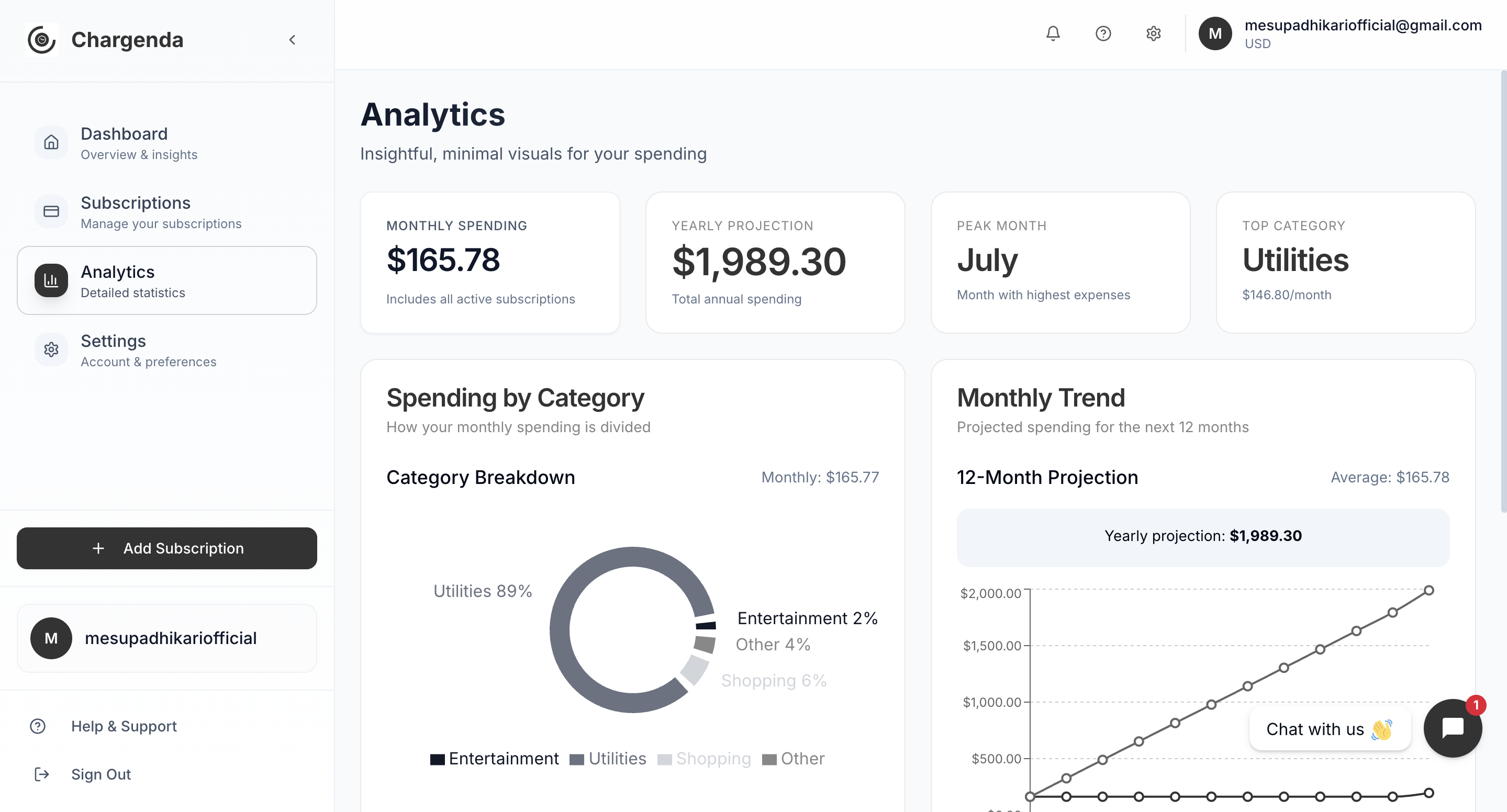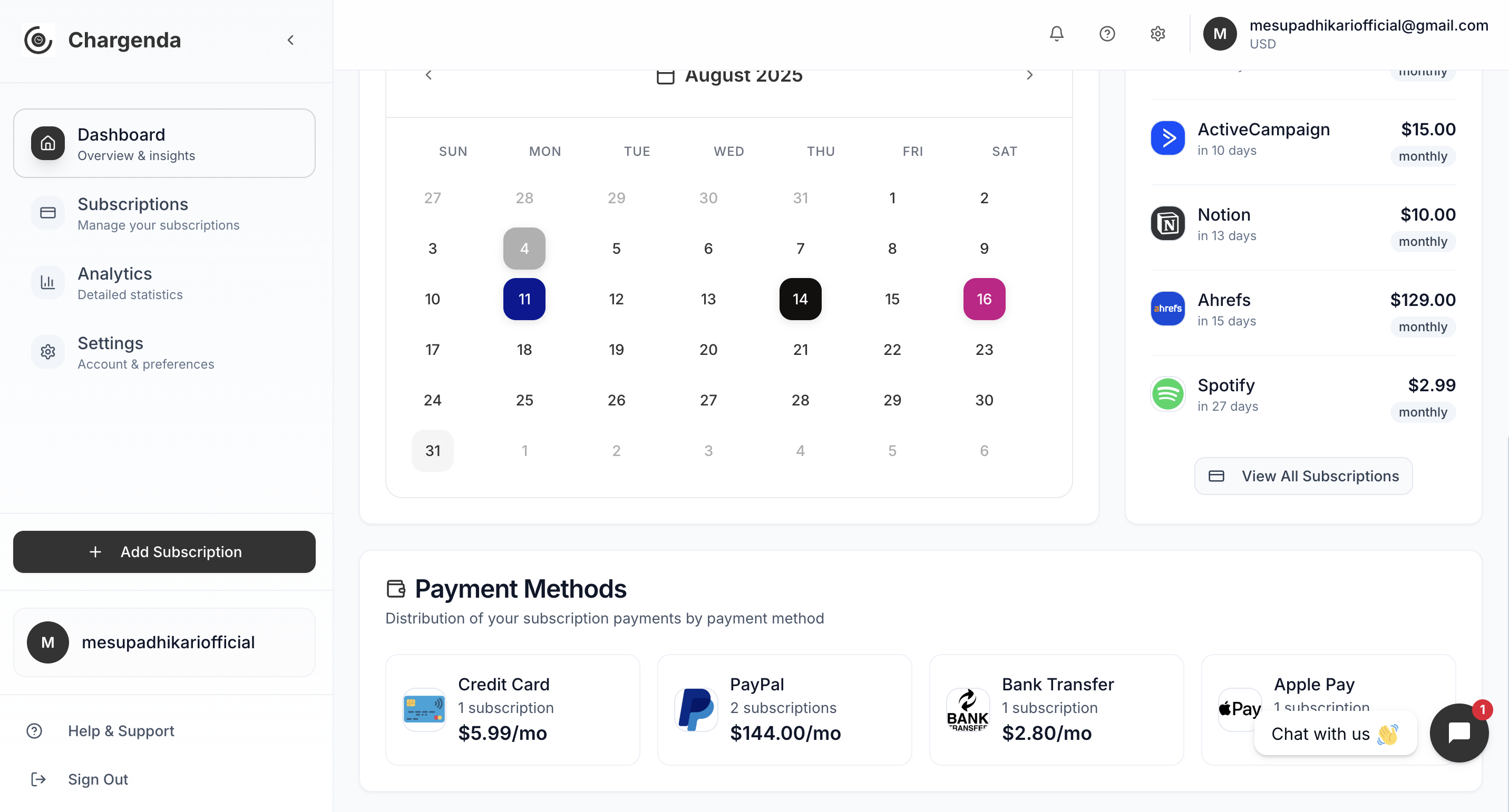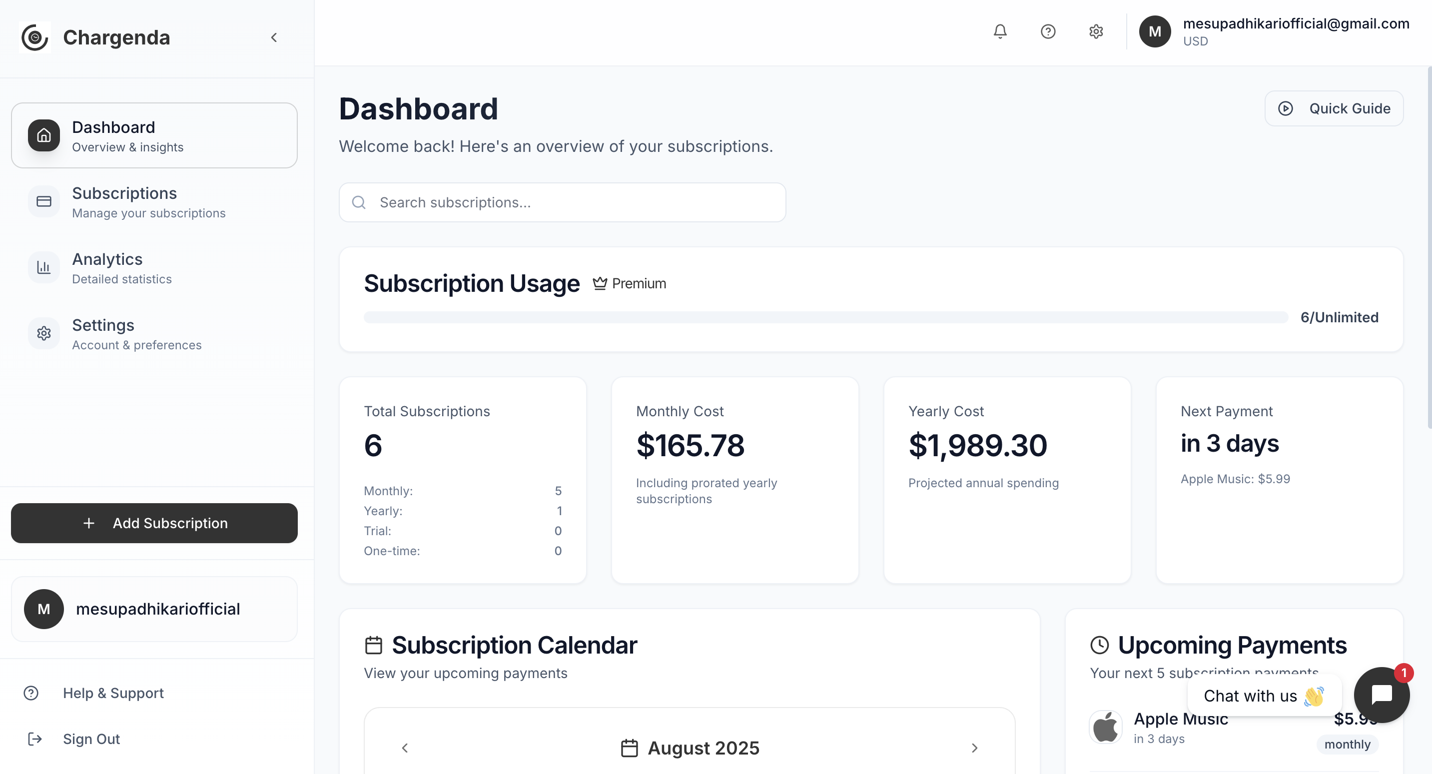 Chargenda helps you manage all your paid subscriptions in one smart calendar. Get reminders, see upcoming payments, and stay in control - effortlessly.