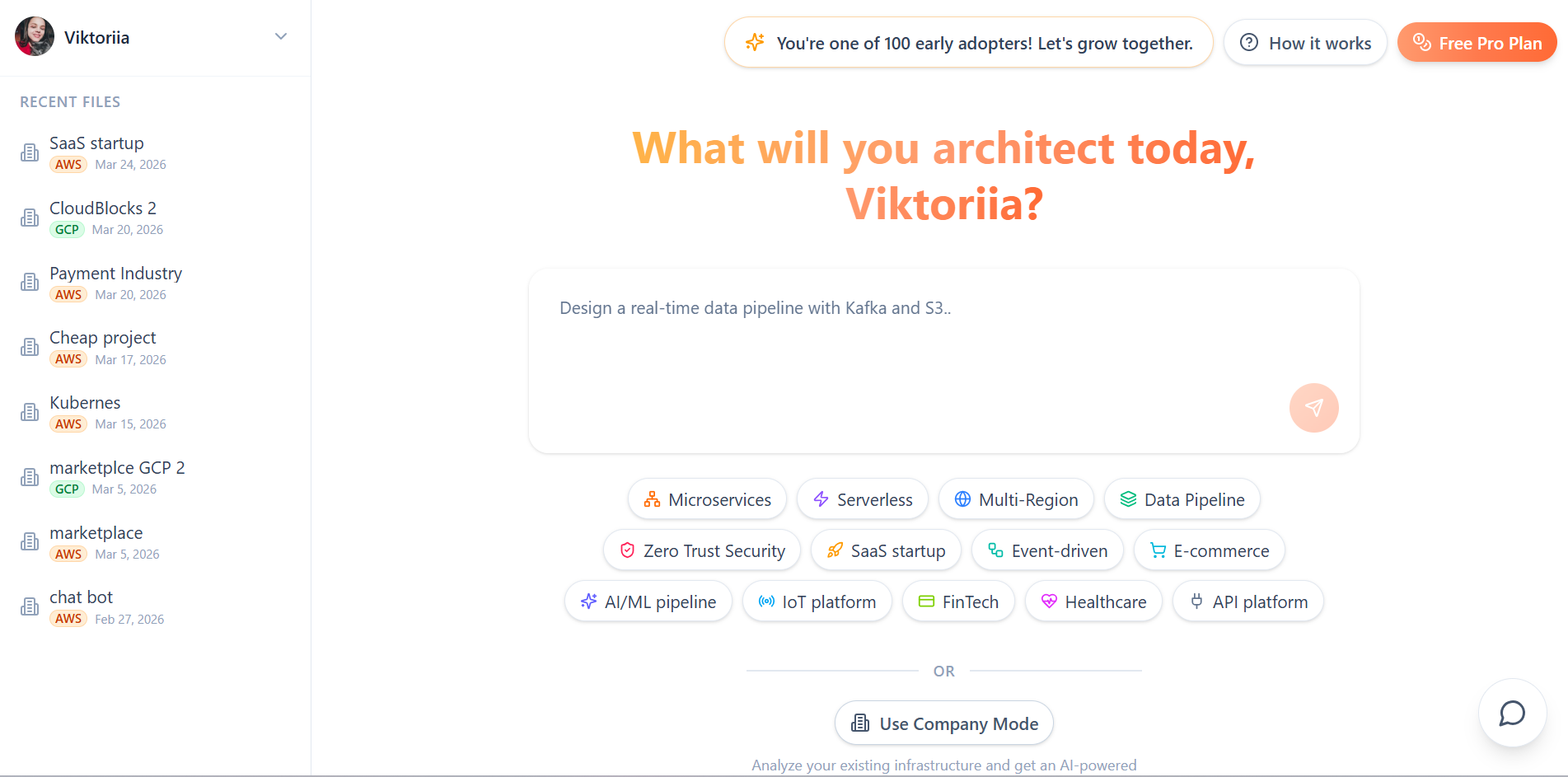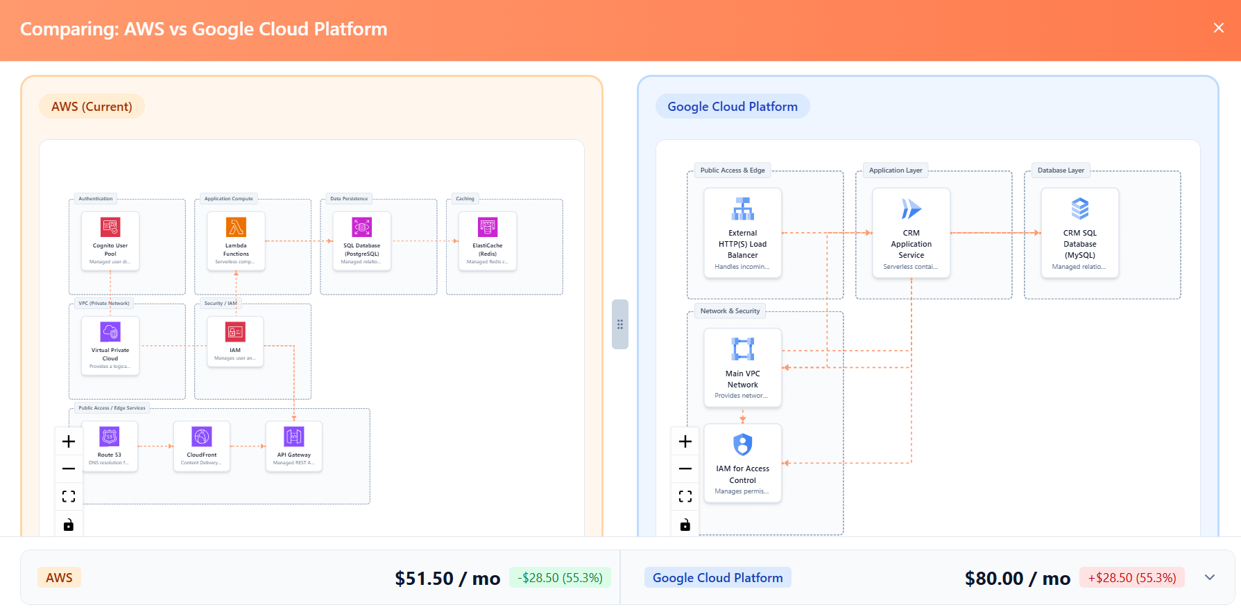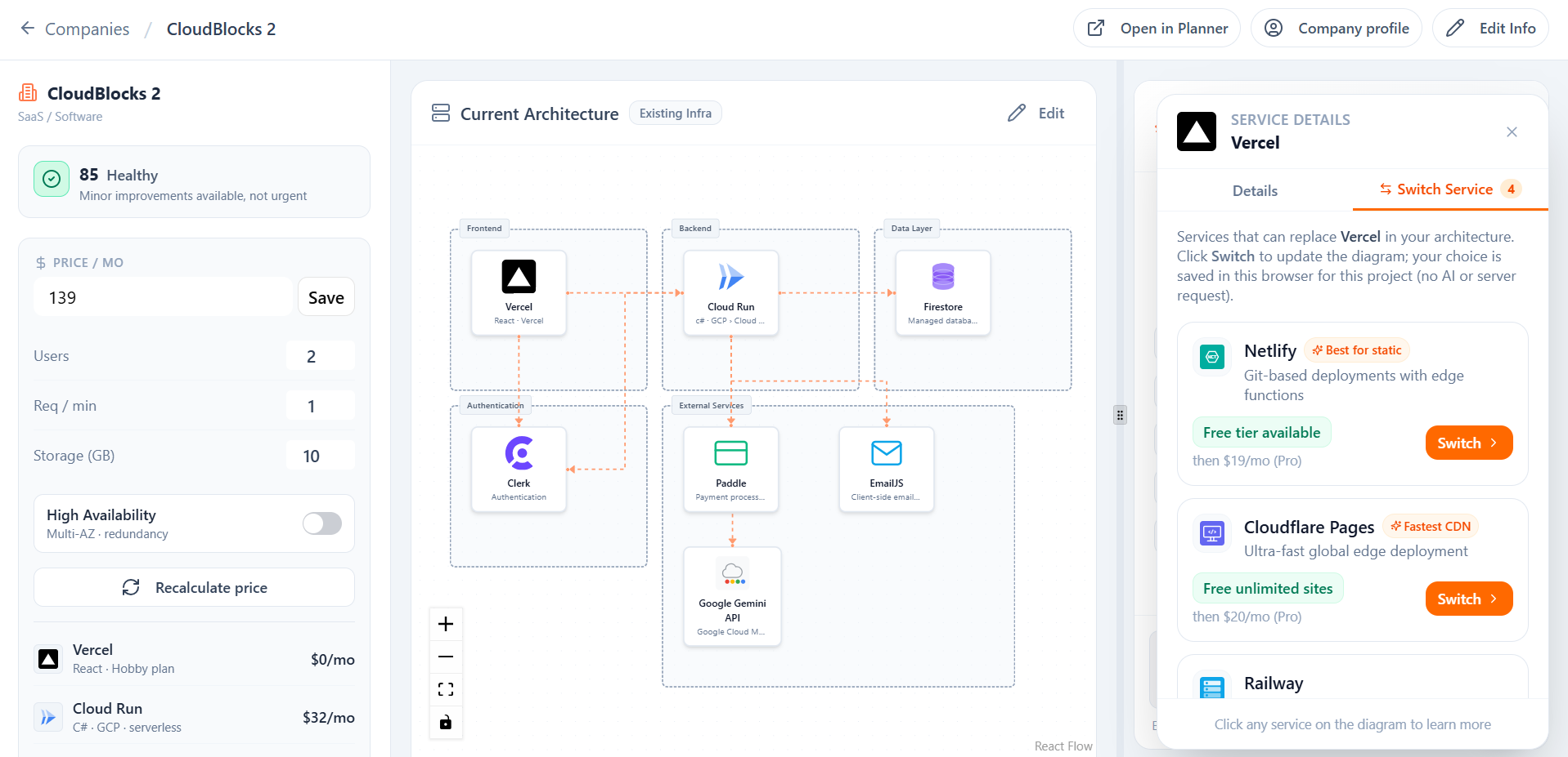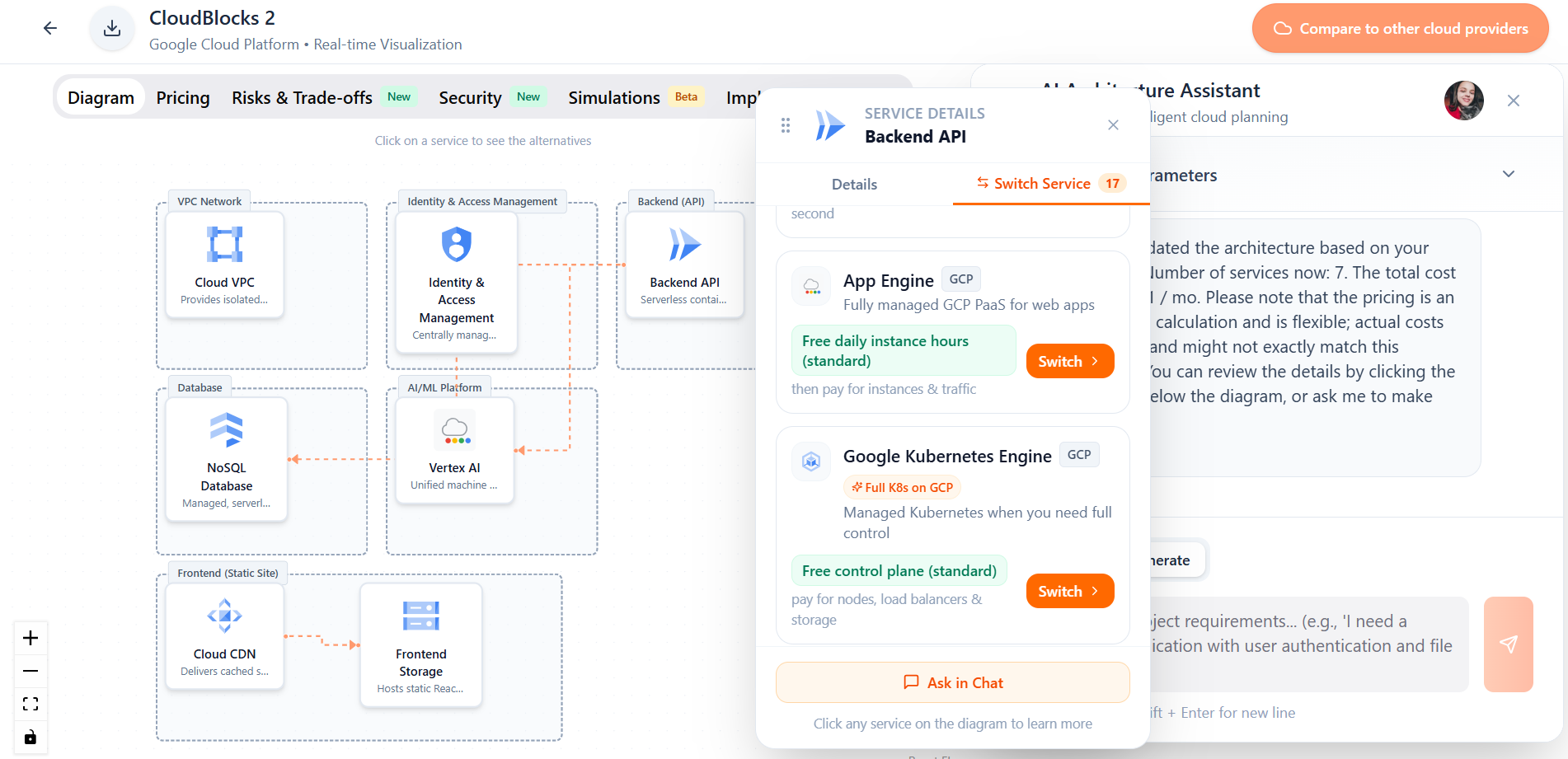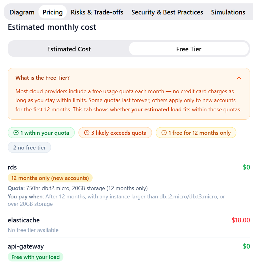 Design and validate cloud infrastructure using AI chat. Compare providers and plan costs. Free and premium tiers available for DevOps and Founders.