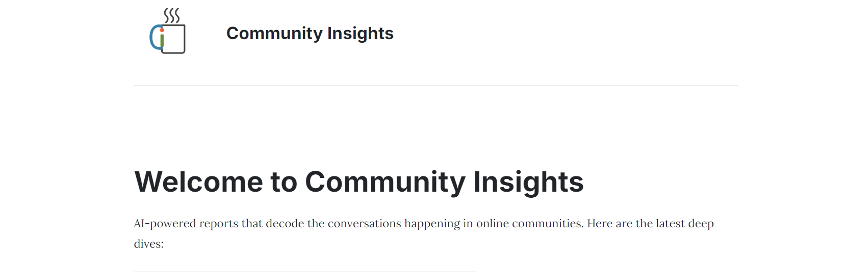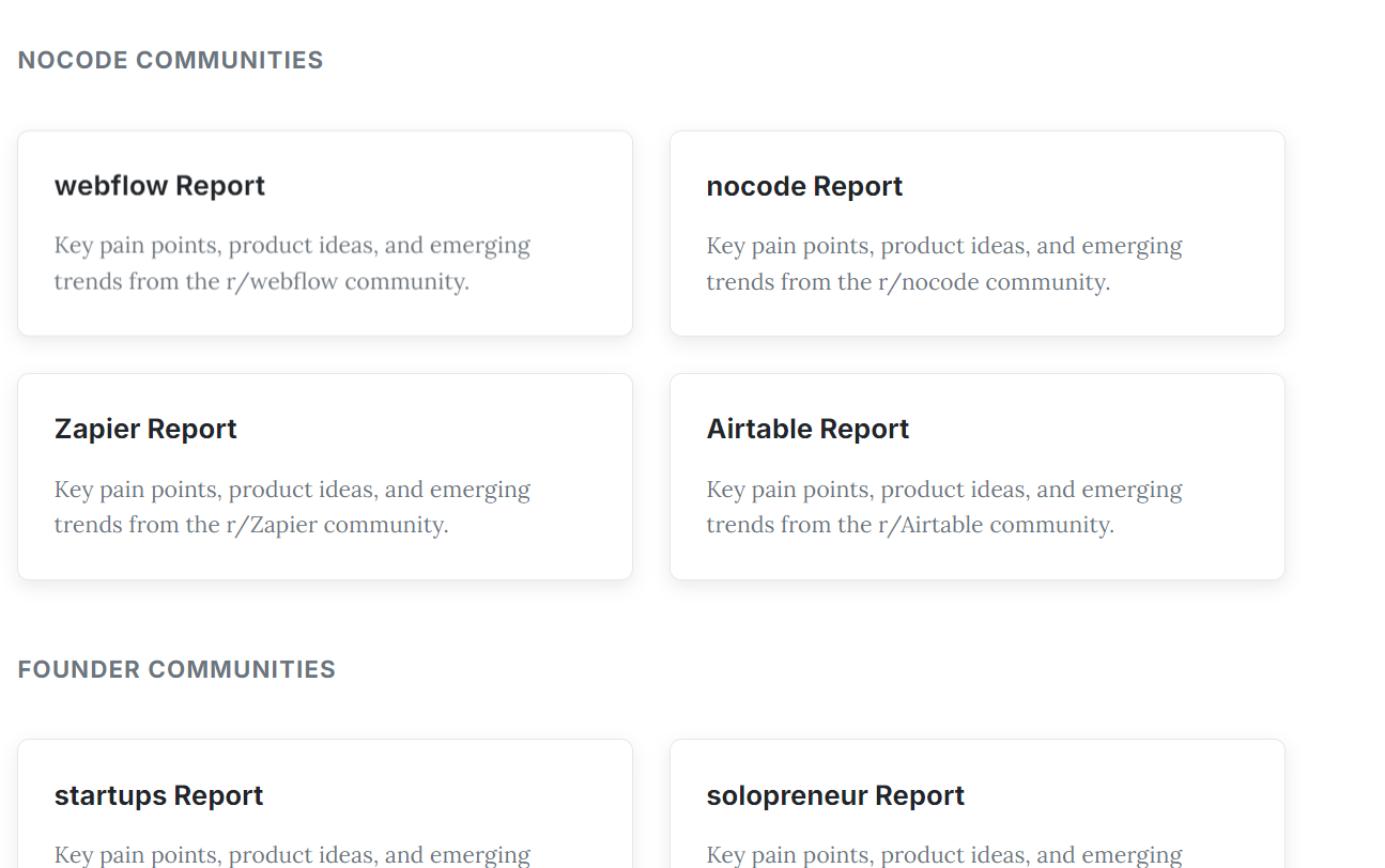 Community Insights is a collection of Deep dive market research reports which gathers pain points from various online communities, that help to find which products or solutions people are willing to pay for.