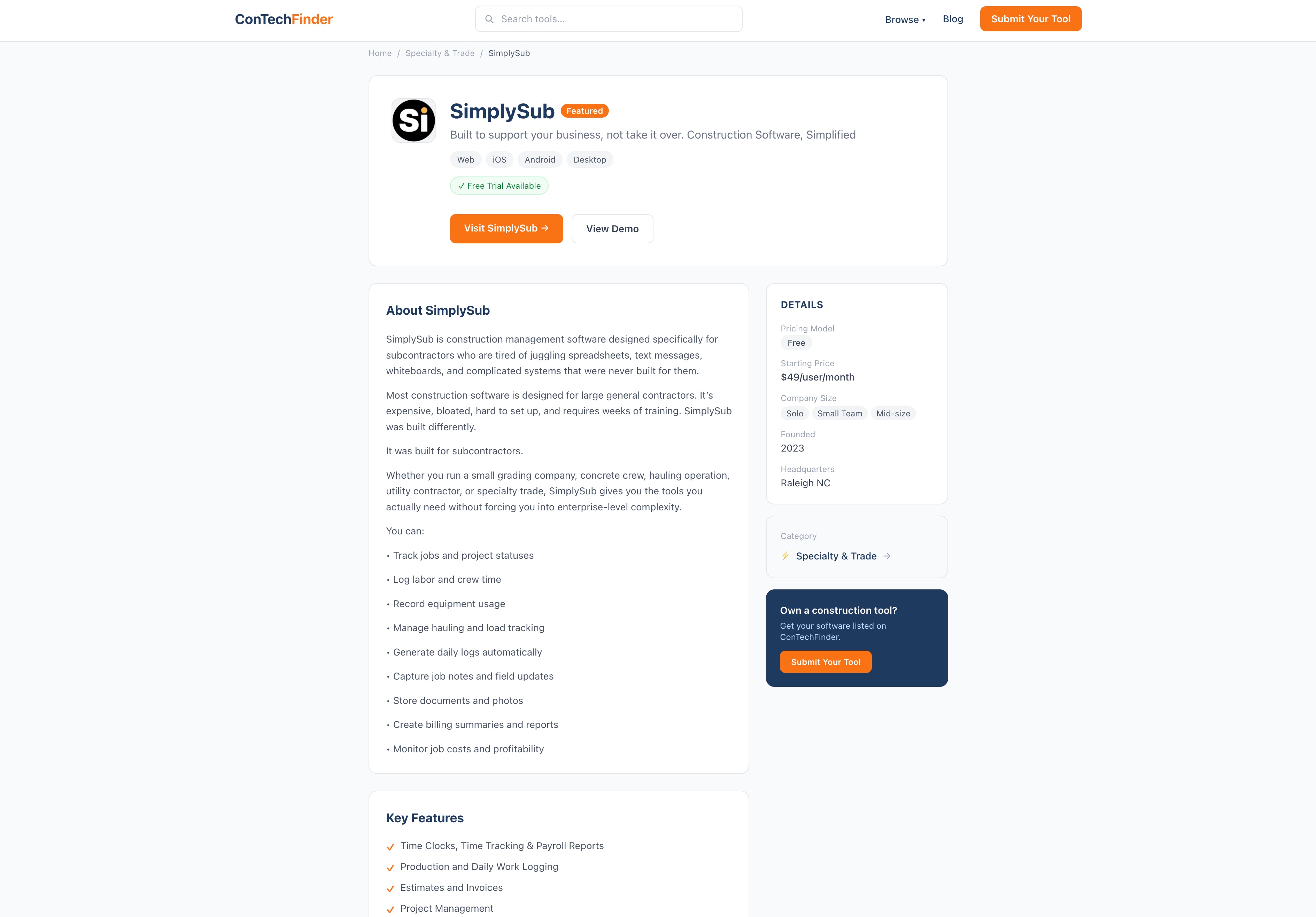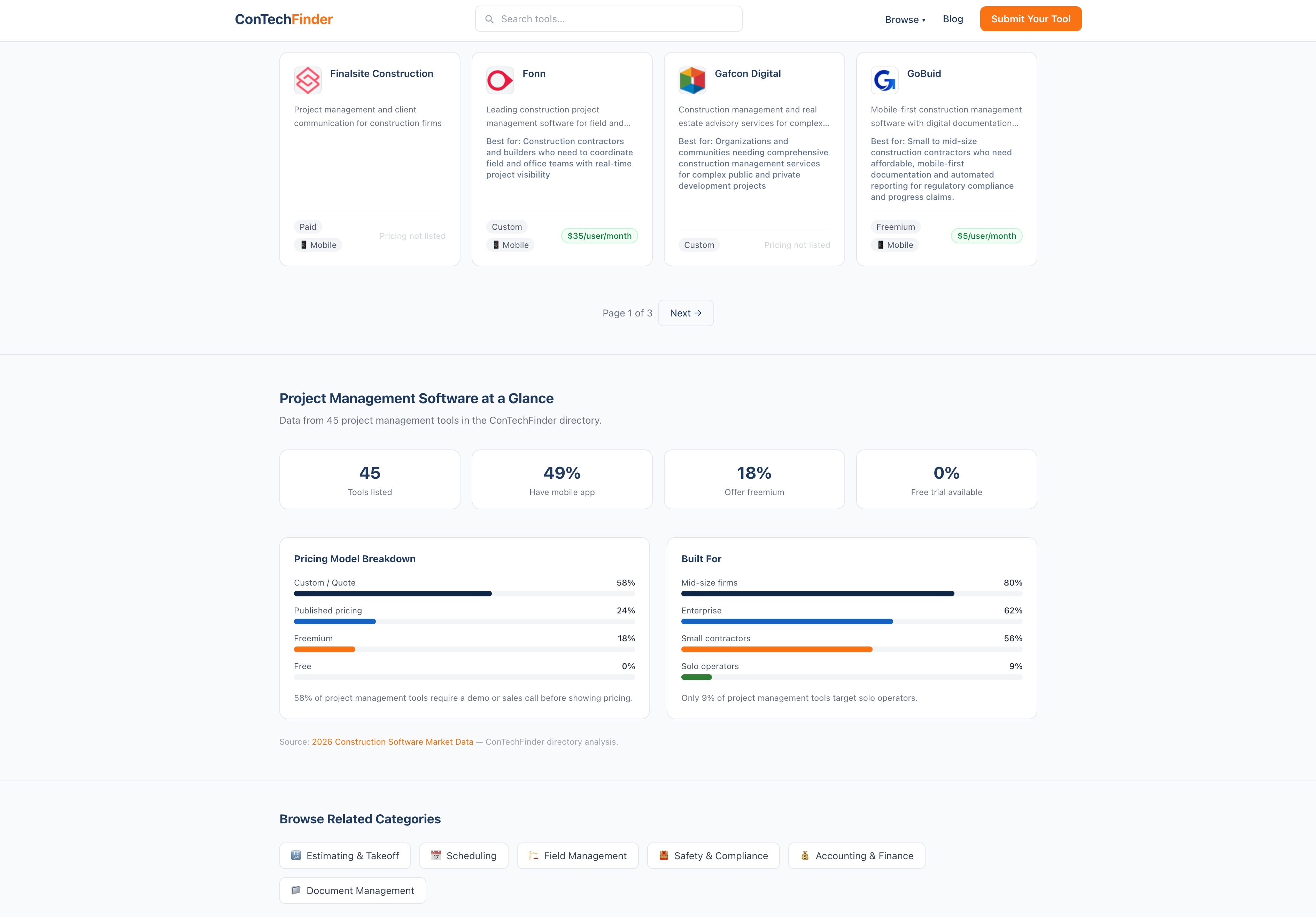 ConTechFinder is a curated directory of 570+ construction software tools organized across 15 categories: project management, estimating, scheduling, field management, safety, BIM, drone survey, and more. Built specifically for the construction industry — not a generic B2B marketplace. Every tool is hand-reviewed and categorized for construction use cases, with filters for pricing model, company size, platform, and trial availability. Key features: - 570+ construction software tools, all verified and categorized - Side-by-side tool comparison pages - Alternatives pages for every major tool - 51 buyer guides and category roundups - Free market data report analyzing pricing, mobile coverage, and company size targeting across the industry For contractors: find the right software without wading through Capterra and G2. For vendors: get a free dofollow backlink from a niche construction directory indexed by Google.