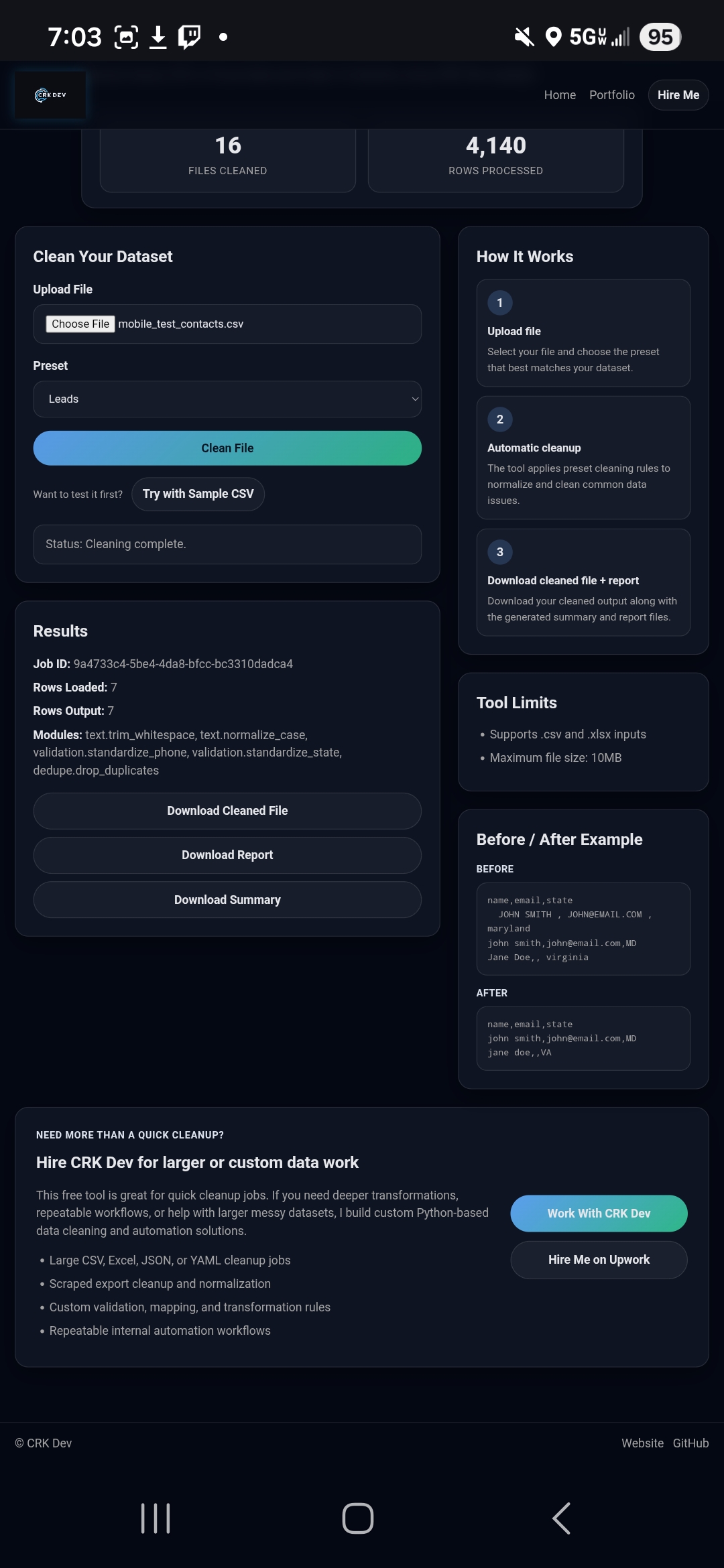 CSV Cleaner by CRK Dev is a developer-focused tool for cleaning, normalizing, and validating messy real-world datasets. Built from real scraping and data pipeline use cases, it handles: - Deduplication - Field normalization - Data validation - Export-ready structured outputs The tool is currently undergoing a full rebuild focused on: - Performance at scale (large datasets) - More accurate cleaning logic - Better pipeline integration If you work with scraped data, lead lists, or inconsistent CSVs, this tool is being designed for you. Follow along for updates and early access to the new version.