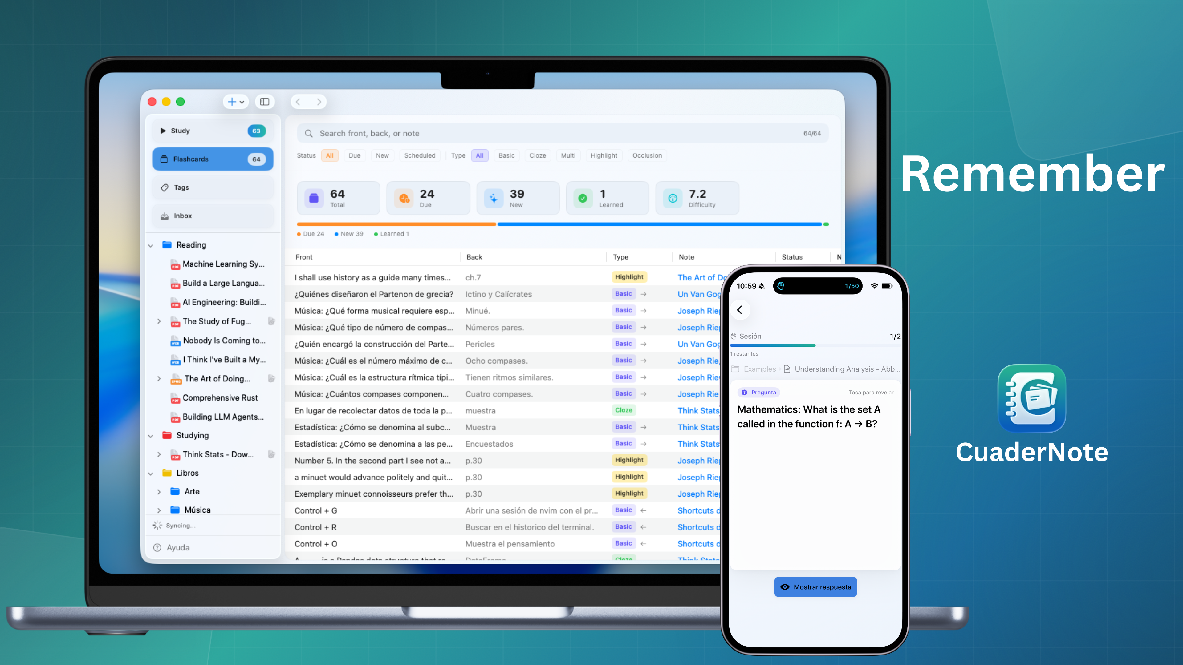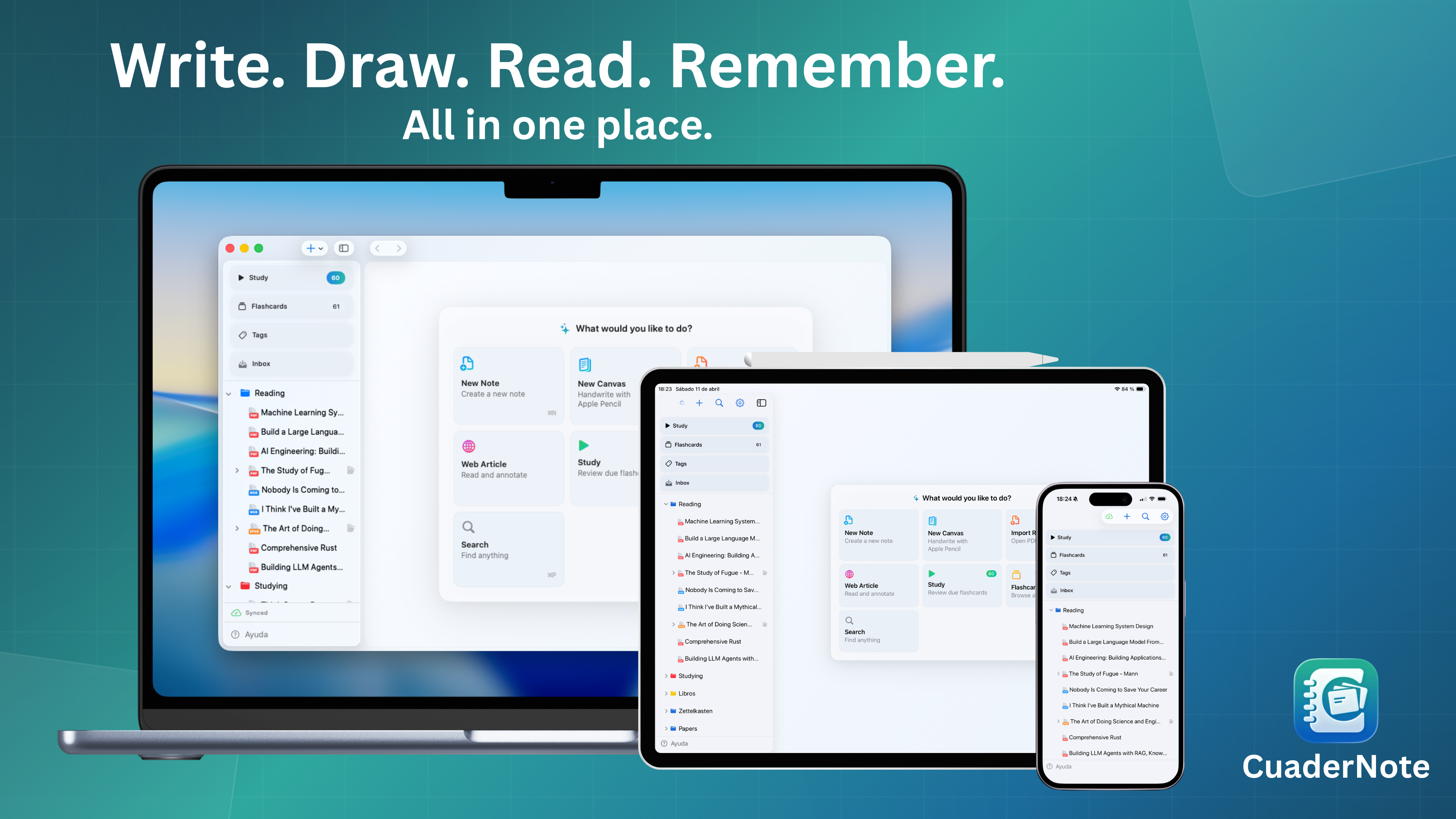 Cuadernote is a native macOS and iOS application designed to help you capture and retain information more effectively. It provides a comprehensive workspace that combines a Notion-style editor for structured notes, a reader for PDFs, EPUBs, and web content, and a freeform notebook canvas for visual thinking. To ensure you don't forget what you have studied, the app integrates spaced repetition flashcards directly into your workflow. You can use this all-in-one tool to streamline your learning process and keep your essential knowledge organized in a single place.