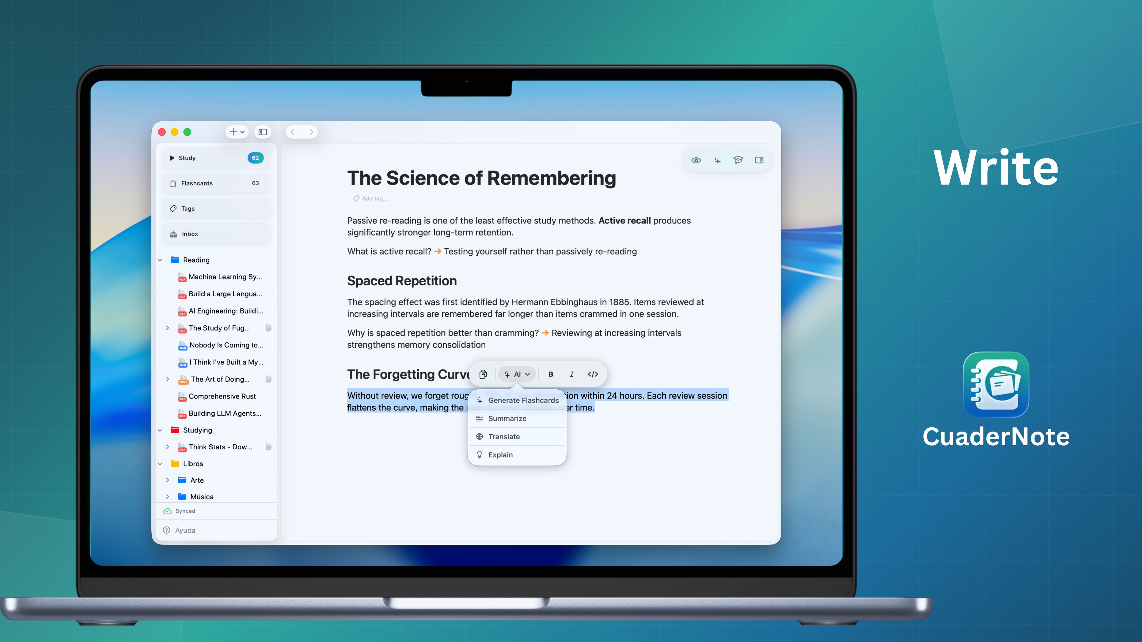 Organize notes, read documents, and master topics with spaced repetition. This native workspace is built for students, educators, and solopreneurs.