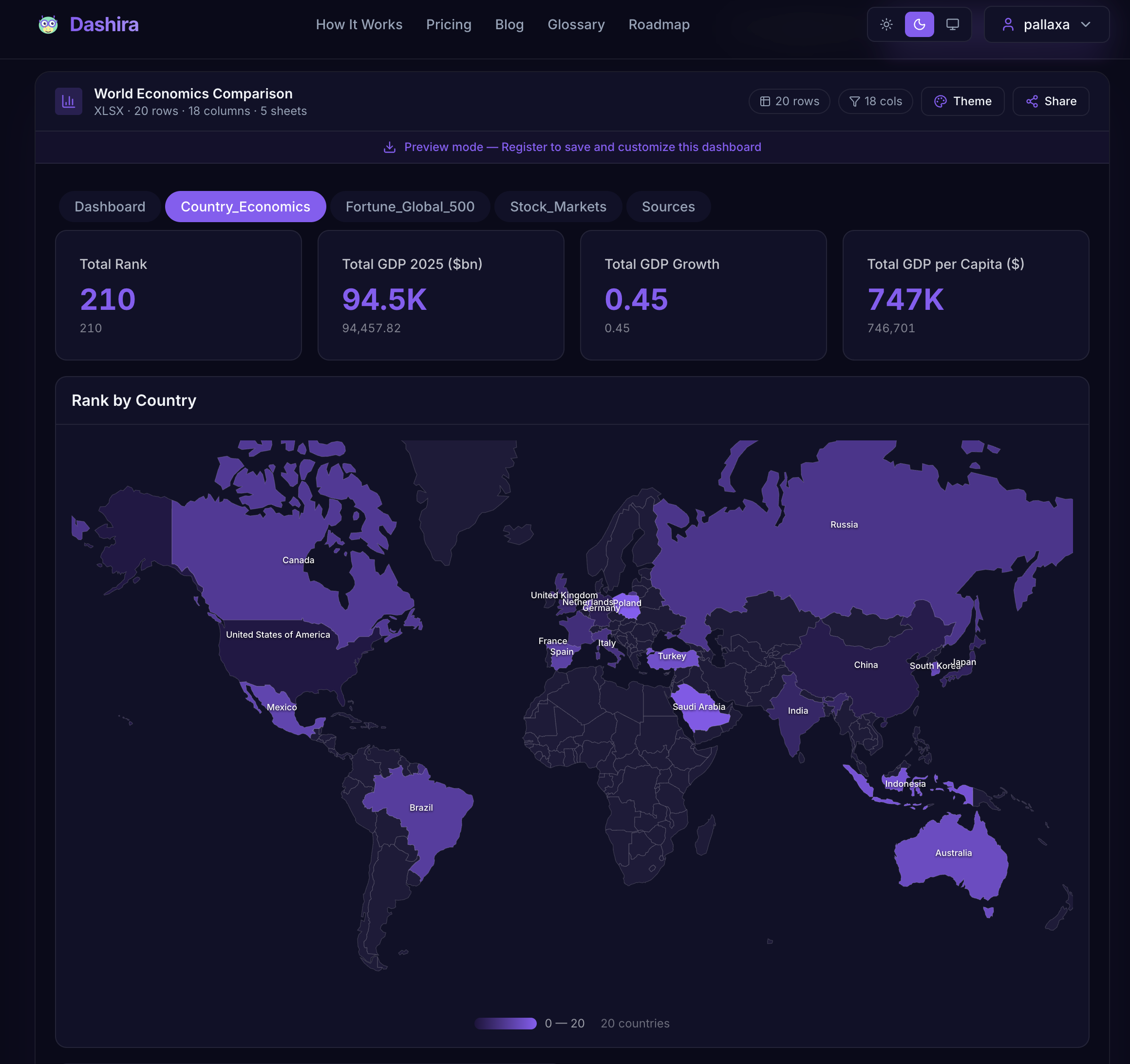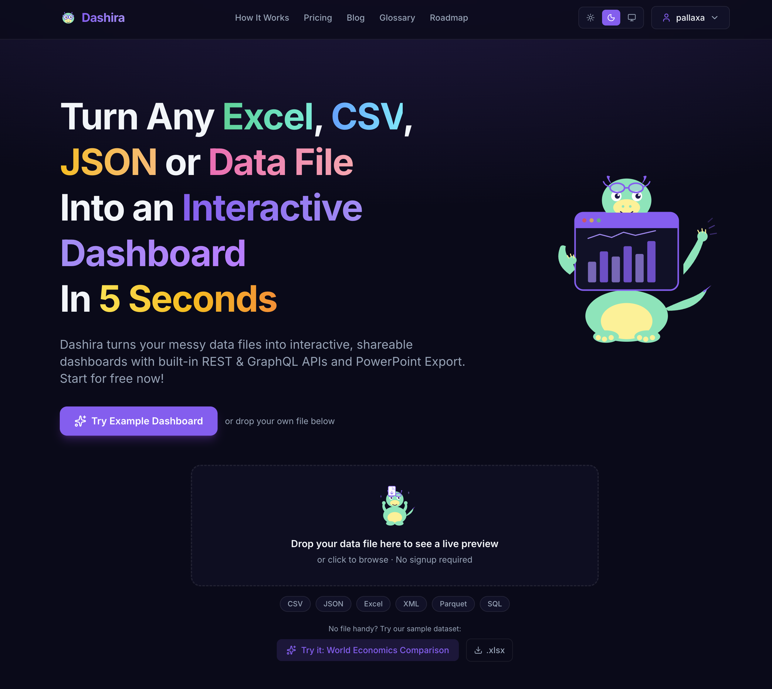Dashira allows you to transform raw data into professional, visually appealing dashboards with ease. You can upload your data and immediately generate shareable insights that come with built-in APIs for seamless integration. It is designed to help you communicate data effectively while providing a quick setup process that is free to start. Whether you need to visualize metrics for your team or create accessible data endpoints, this tool streamlines the entire process from file upload to final presentation. Dashira turns any Excel, CSV, JSON or Data File into an interactive and shareable dashboards with built-in REST & GraphQL APIs and PowerPoint Export in 5 Seconds.