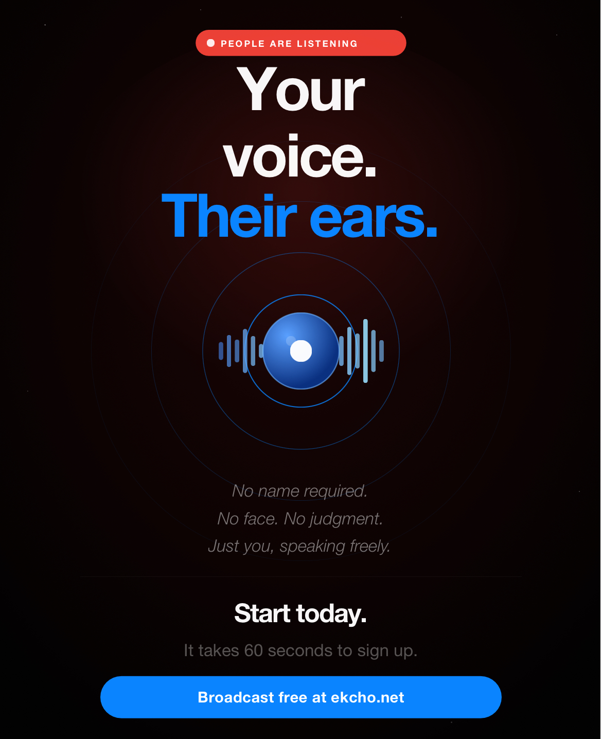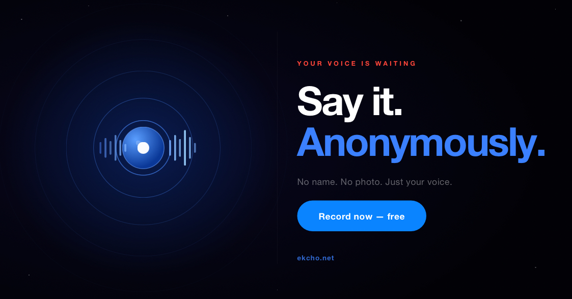 Ekcho is a platform centered around authenticity and privacy, captured by the phrase "Real voices. No real names." It provides a space where you can share and listen to genuine audio content while maintaining anonymity. The service focuses on the power of the human voice for expression without the social pressures associated with personal identity.