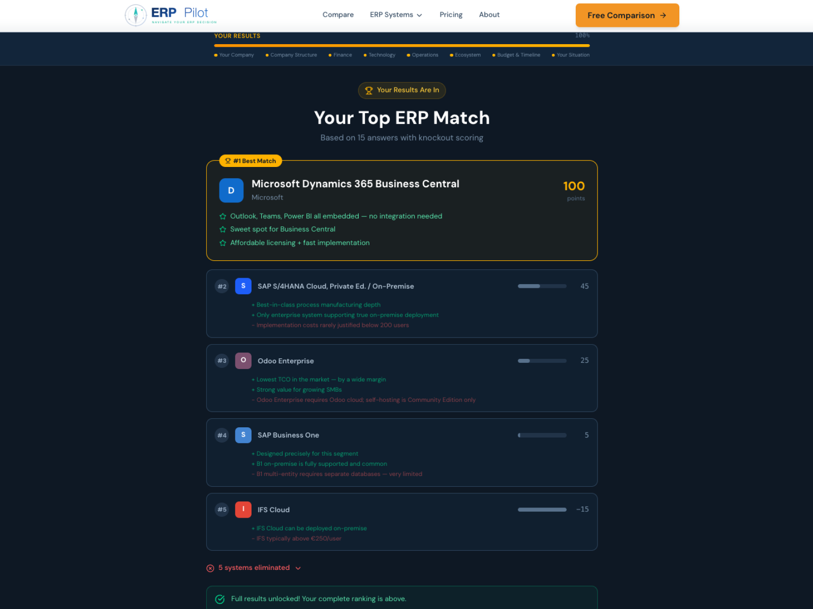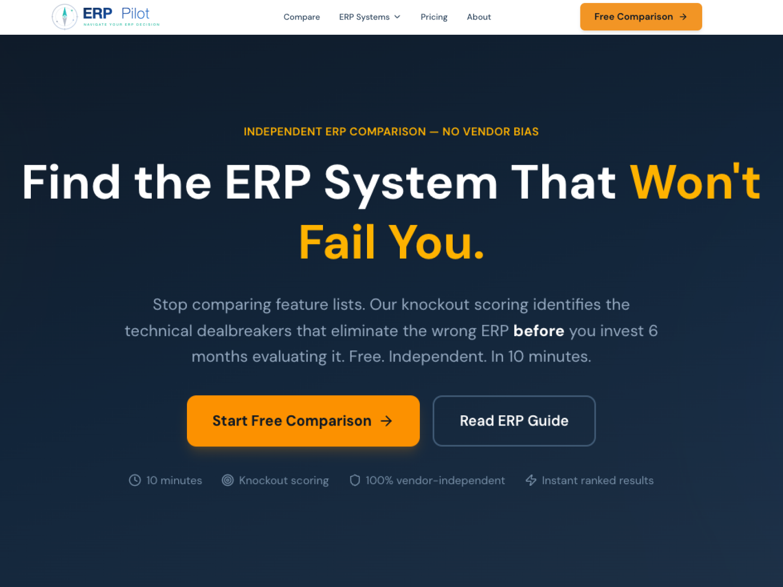 Eliminate biased ERP demos with independent knockout scoring. Get instant TCO estimates and ranked shortlists for mid-market enterprises. Freemium access.