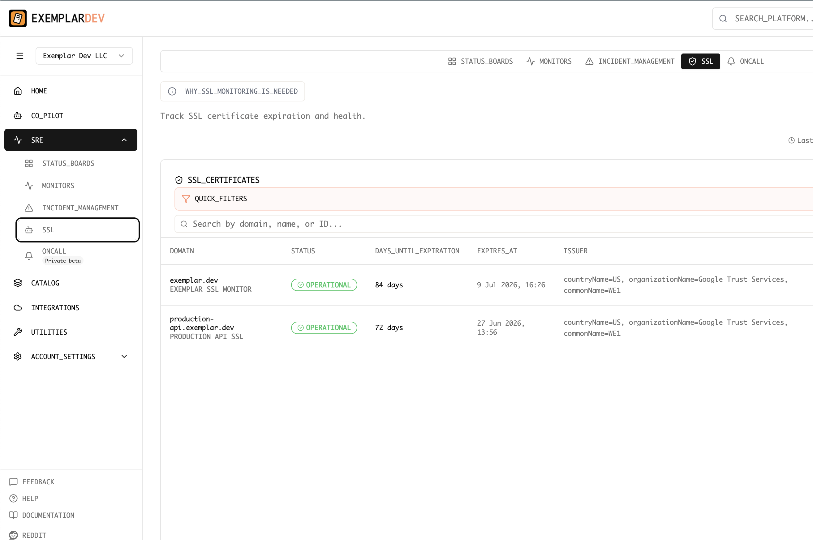 Exemplar is a unified AI-enabled developer platform designed to keep everything your developers need in one place. It integrates key functionalities including SRE capabilities like uptime monitoring, status pages, incident management, vendor tools status aggregator, SSL tracking with service catalog, self-service actions across AWS, Github, Linear, JIRA, Grafana etc. to streamline Day 2 Ops development workflows. You can leverage these tools to enhance productivity, effieciency across engineering workflows & maintain a centralized hub for all your engineering needs.