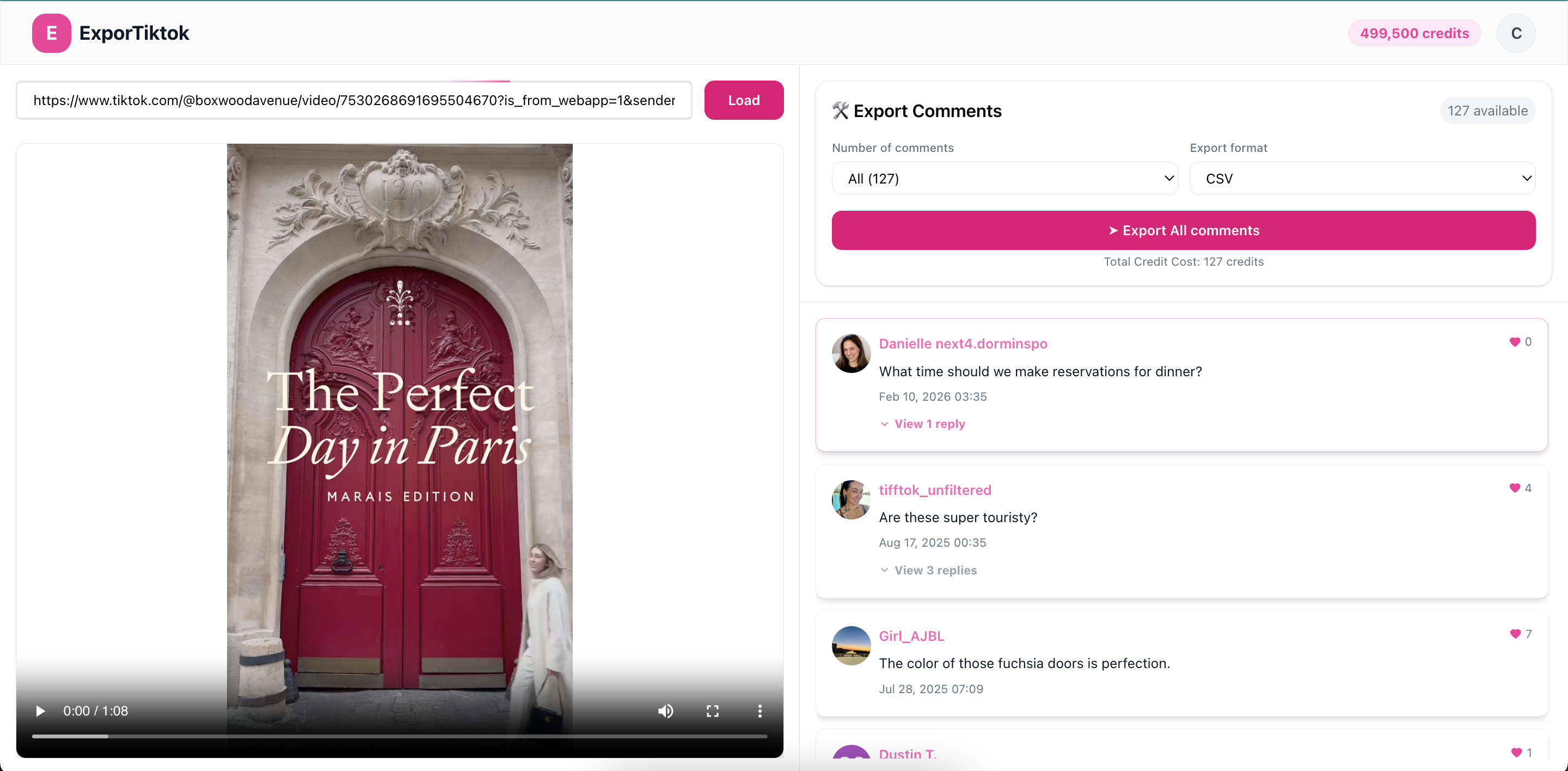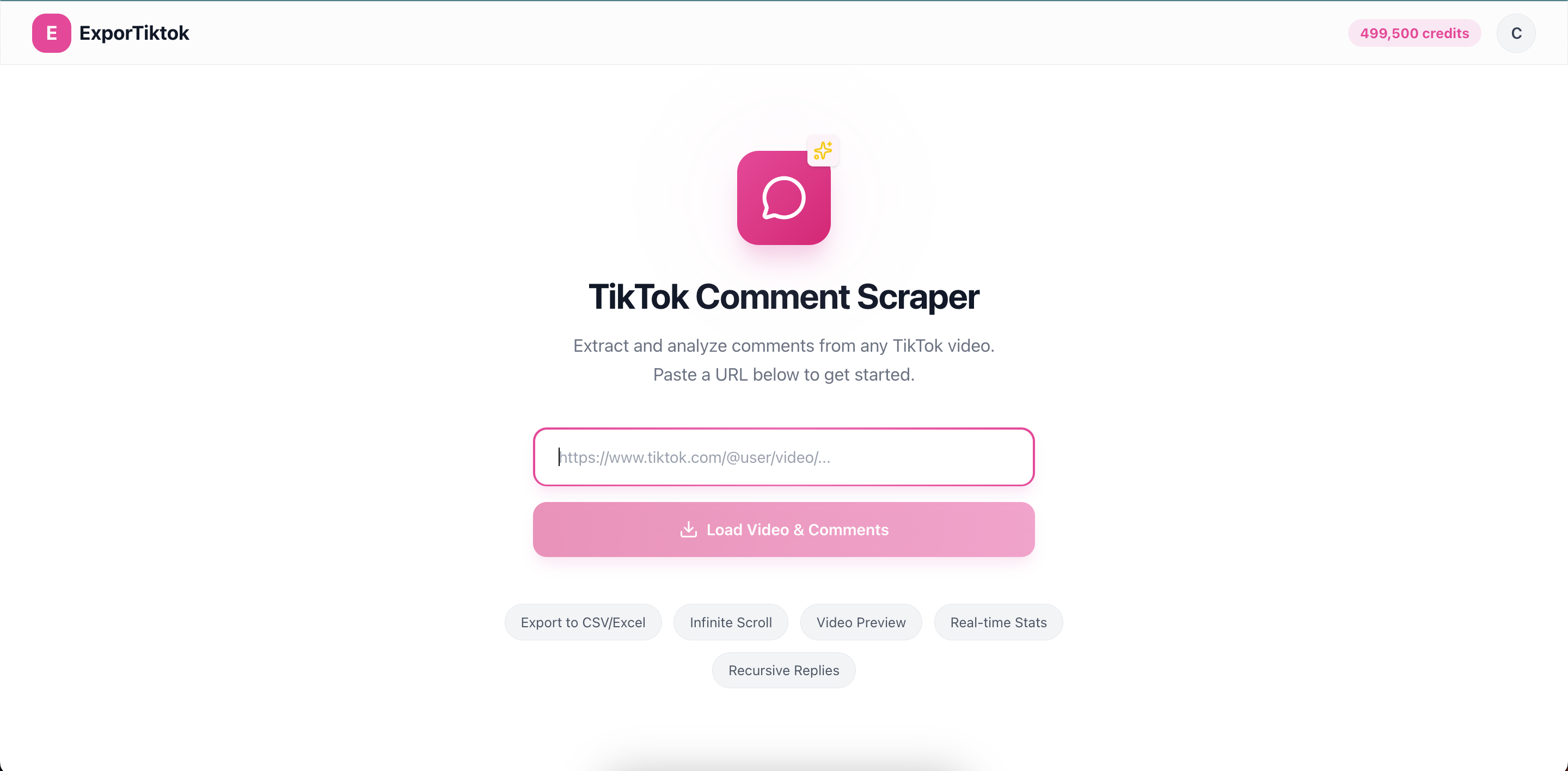 ExporTiktok allows you to extract and download TikTok video comments in seconds. You can easily manage and analyze engagement by converting social media interactions into structured CSV or Excel formats. This tool helps you organize comment data efficiently, providing 500 free credits to help you get started with your data export needs.
