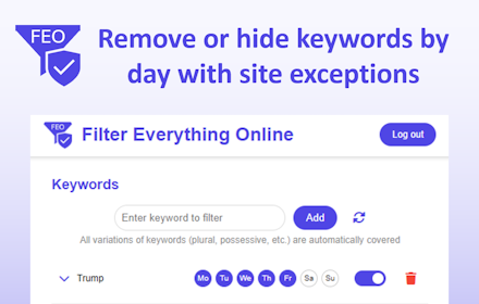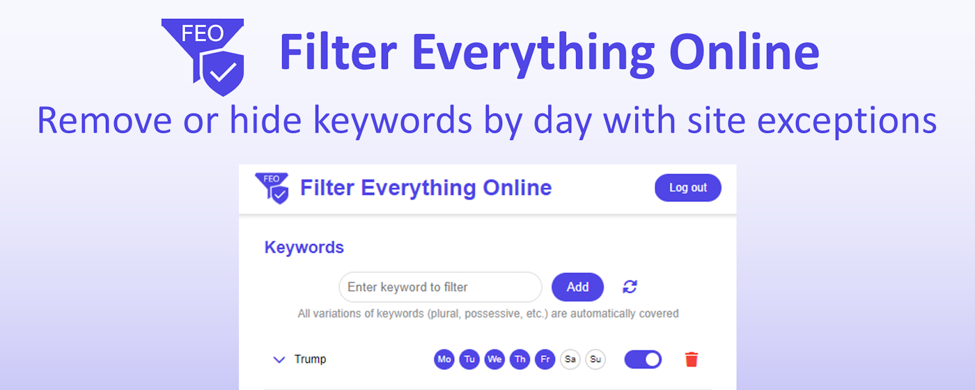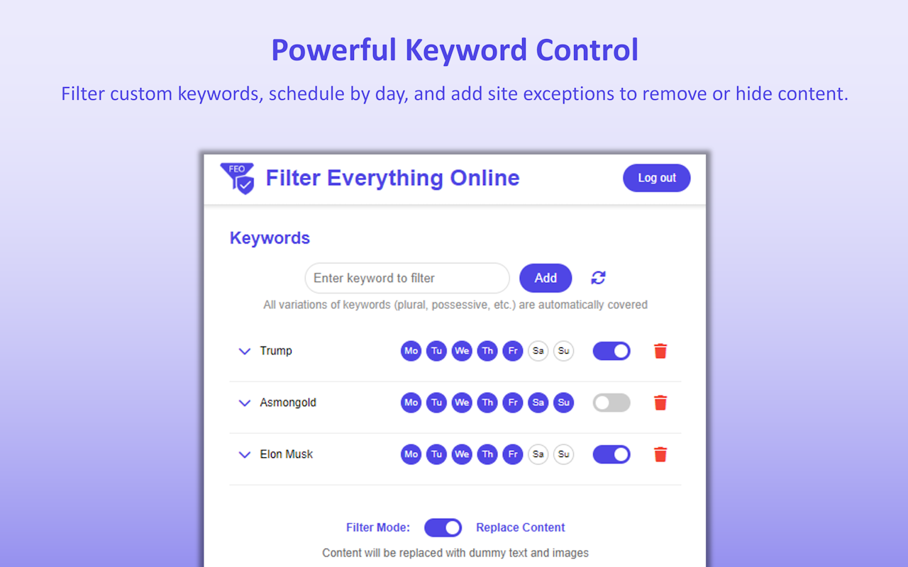 Filter anything everywhere with our browser extension. You can block keywords, profanity, and other unwanted content across all websites you visit. This extension is available for Chrome, Firefox, and Edge, providing comprehensive content filtering for your browsing experience.