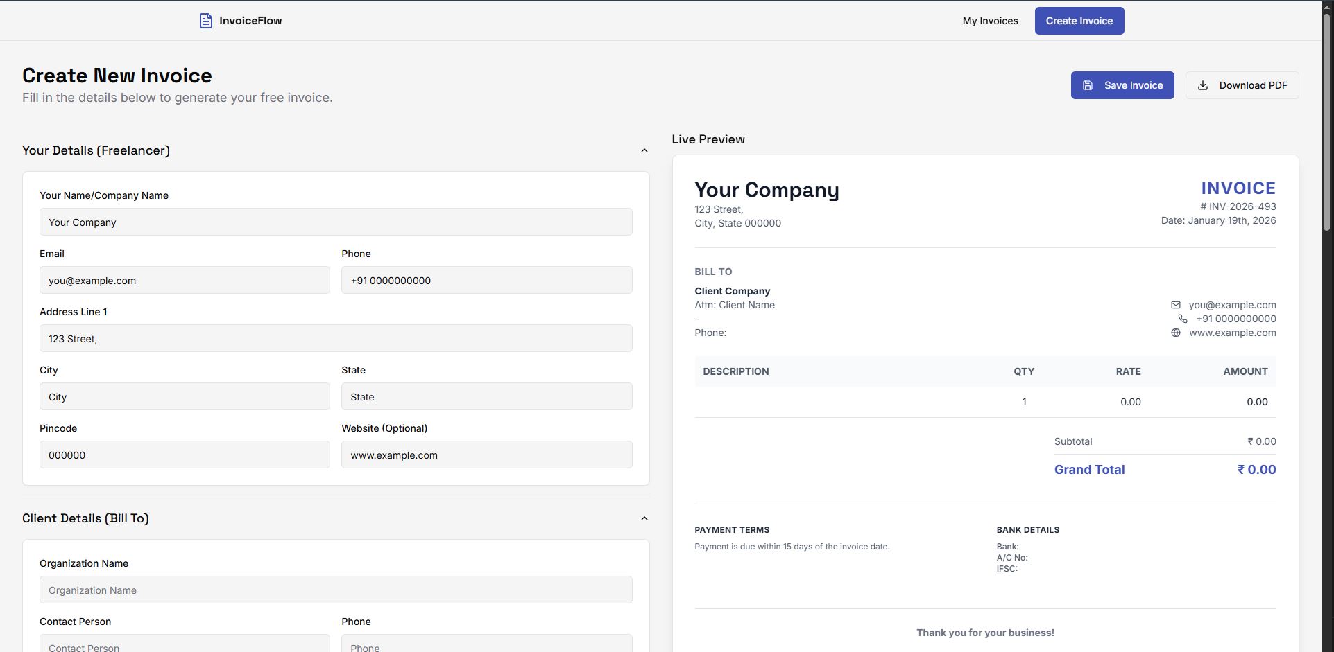 Create and download professional invoices instantly without account registration or watermarks. Free web tool for freelancers and small businesses.