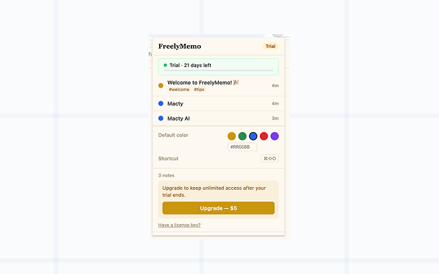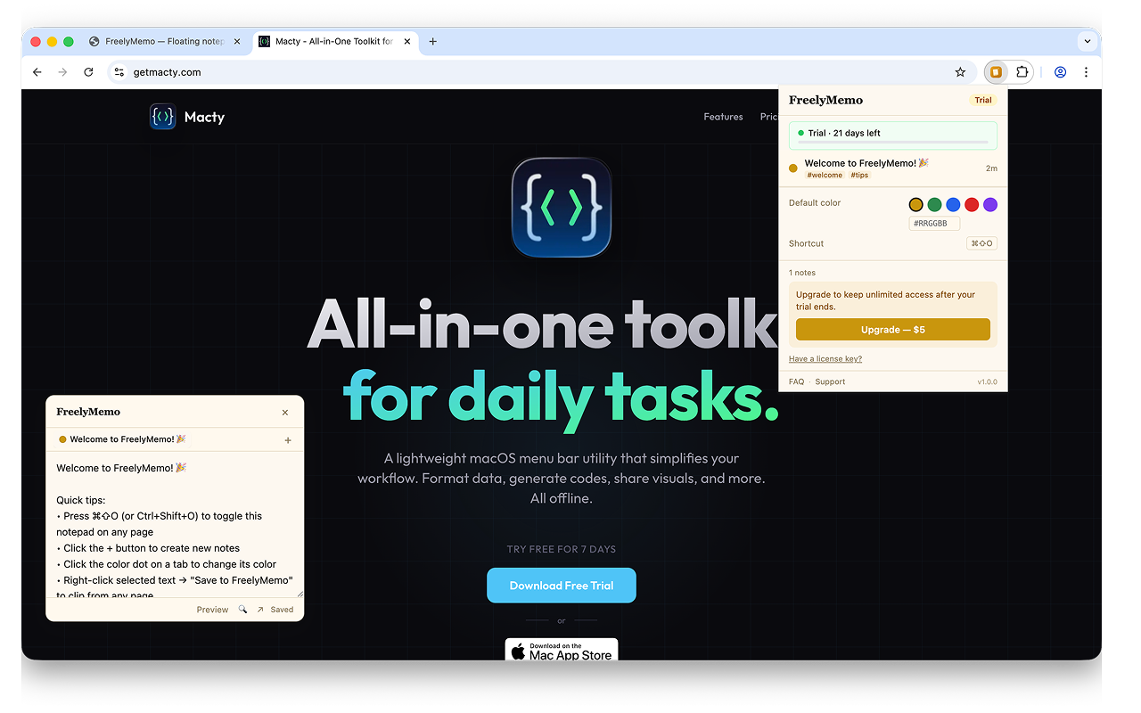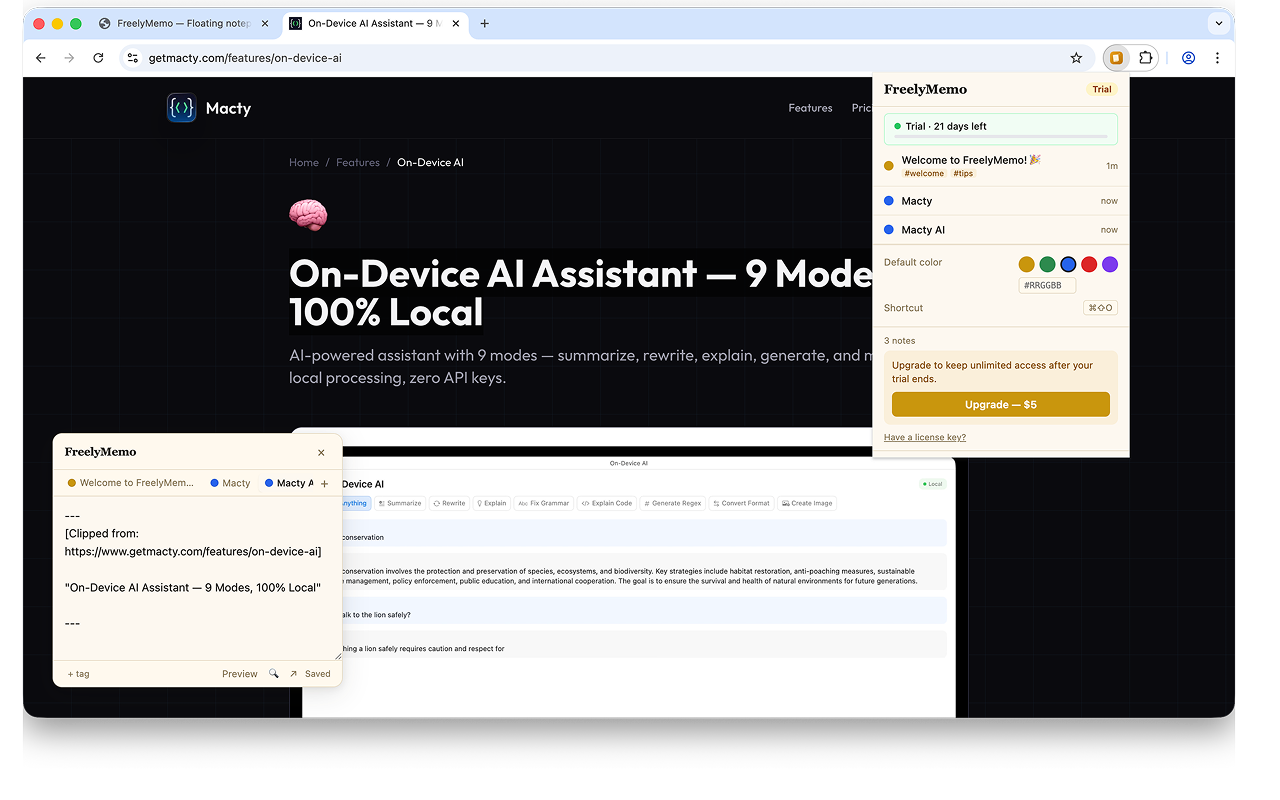 FreelyMemo is a floating notepad that opens right on the page — press ⌘⇧O (Ctrl+Shift+O on Windows), jot your thought, keep browsing. • Multiple color-coded notes with tags • Clip any text from any page (right-click → Save to FreelyMemo) • Auto-save, works offline, 100% private — all data stays in your browser • No account needed Available on Chrome & Firefox. 21-day free trial. Pro is $5 one-time — one license covers both browsers.