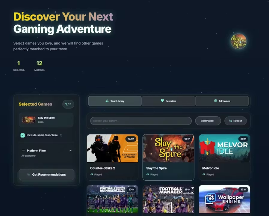 GameSearch.GG is a game recommendation engine that finds your next favorite game based on mechanics, pacing and feel — not just genre tags. Pick the games that hooked you, connect your Steam account, and get personalized picks from 6,000+ titles including hidden indie gems. Free to start, no credit card needed. You know the feeling — it's Friday night, you open Steam, scroll through hundreds of games, and end up playing the same old game you have for years. Steam's recommendations feel generic. "Because you played X, try Y" — where Y is always the most hyped game of the month. GameSearch.GG goes deeper than that.