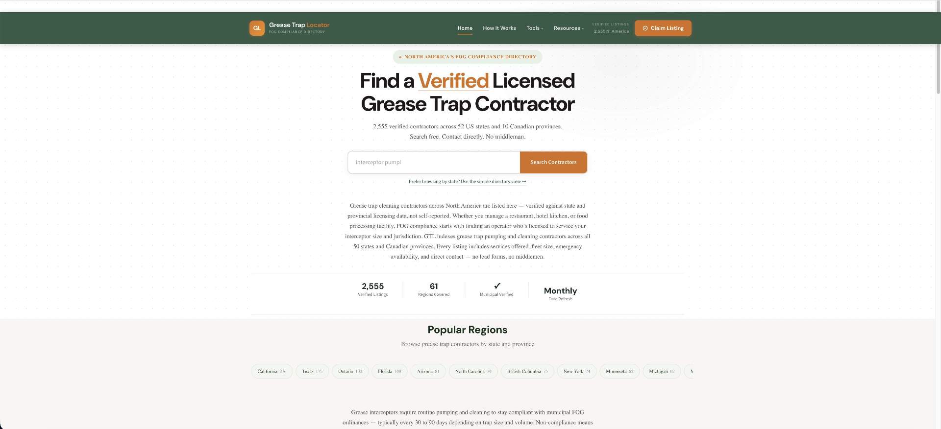 Grease Trap Locator is a free North American directory built for the restaurant and food service industry. Finding a reliable grease trap pumping or FOG compliance contractor has historically meant cold calls and guesswork — Grease Trap Locator replaces that with a searchable, verified database of service operators across all 50 US states and Canadian provinces. The platform serves two sides: restaurant owners, property managers, and facility operators who need compliant grease trap service fast; and grease trap operators who want inbound leads without paying per-click. Listings include service categories, coverage areas, hours, ratings, and direct contact options. Operators can claim and manage their profiles for free. Built for the fragmented, compliance-driven FOG services market where no central resource previously existed. Currently live with 1,386 verified operator listings and growing.
