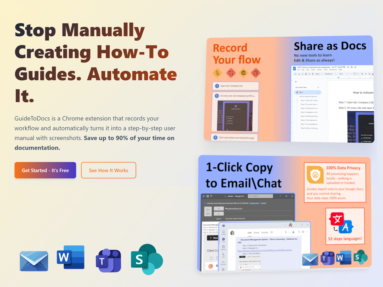 Generate professional user guides and workflow documentation automatically. Capture browser actions for Technical Writers and HR Managers. Try it on web.