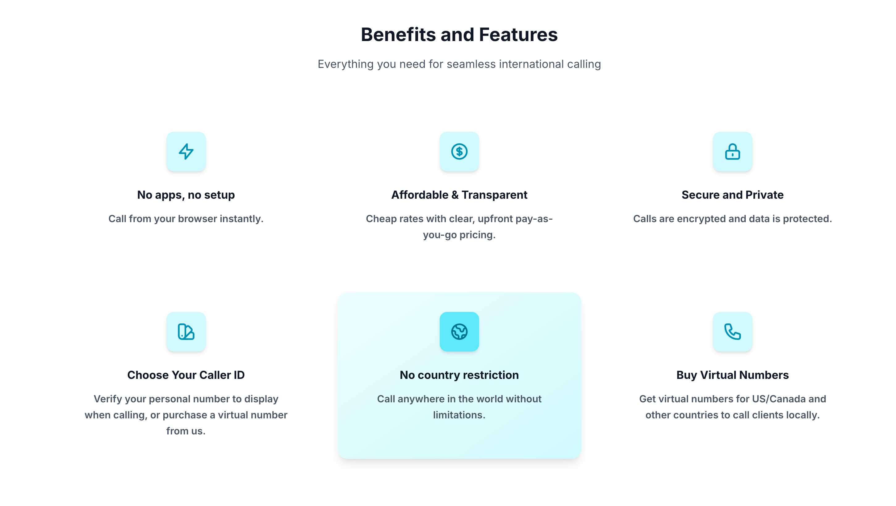 Make international calls and manage virtual US numbers directly from your browser. Ideal for sales teams and freelancers seeking transparent communication.