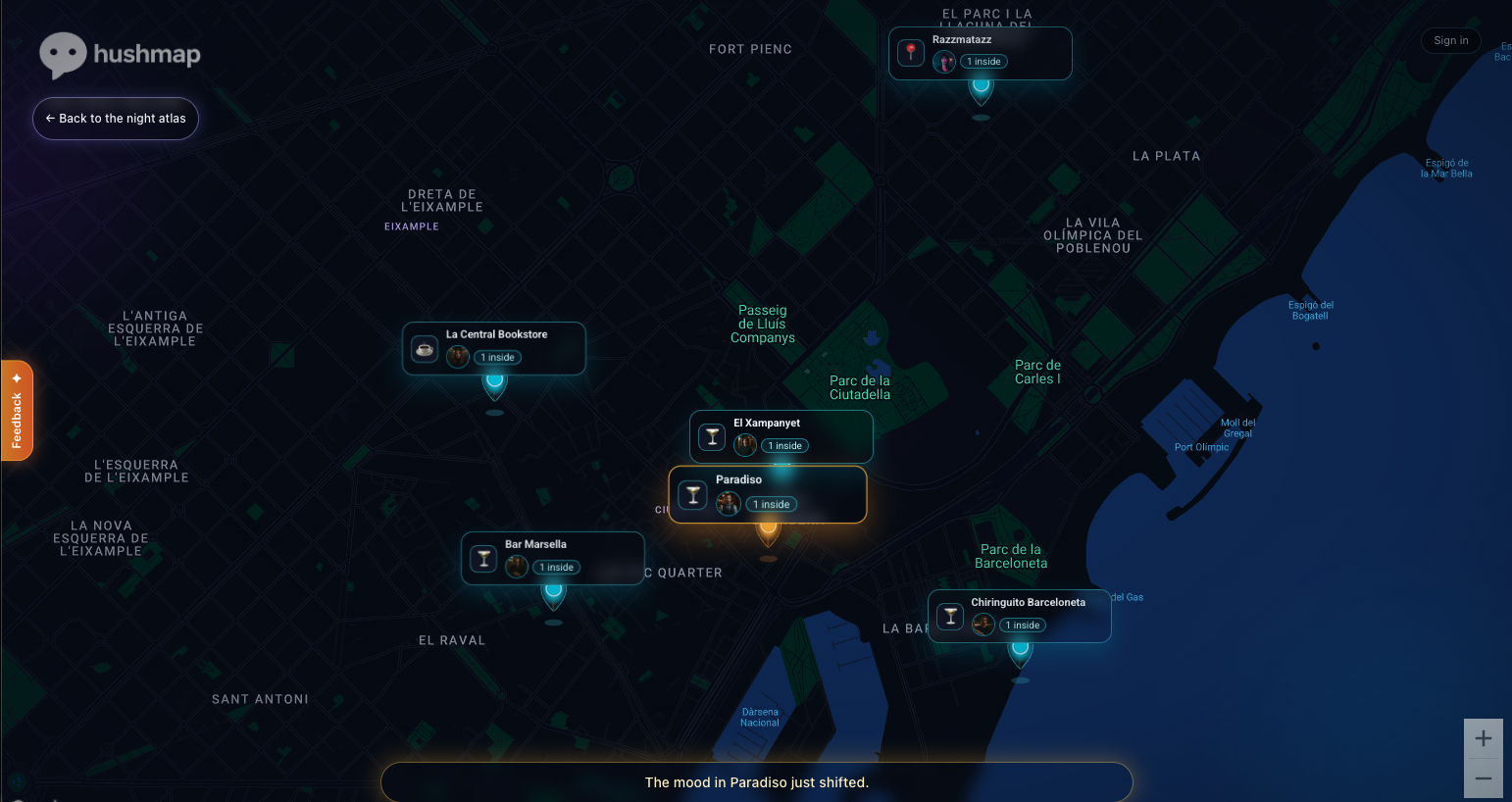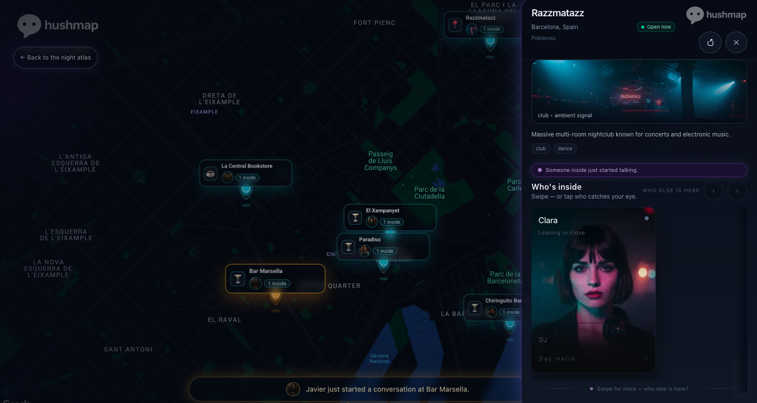 Hushmap is a map-based AI experience where you open a city, step into cafés, bars, and other locations, and meet AI characters who “exist” there. Instead of picking characters from a list, you encounter them in context — a late-night bartender, a failed actor, a trader with stories, someone with something to say. The setting shapes the conversation, making each interaction feel different depending on where you are. Some conversations are casual. Some are strange. Some unexpectedly pull you in. It’s less like chatting with AI, and more like running into people somewhere.