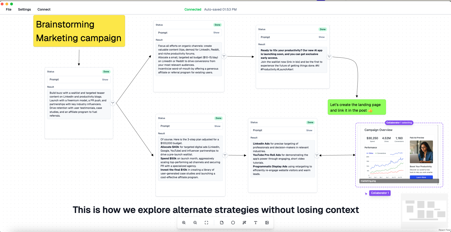 Kavim is a desktop canvas for people who hate losing ideas in linear AI threads. It gives you a shared visual canvas where you can place notes, files, and AI chat nodes, link them, and split any conversation into clear parallel paths. Instead of losing context in a linear thread, you can see the whole reasoning map at once and keep exploring without overwriting earlier ideas. Everything stays local on your computer. You plug in your own OpenAI, Anthropic, or other model keys, so there’s no extra subscription and your data goes only where you send it. No accounts, no central cloud, no forced sync. Just a fast, private workspace for deep research, structured thinking, and visually branching AI conversations.
