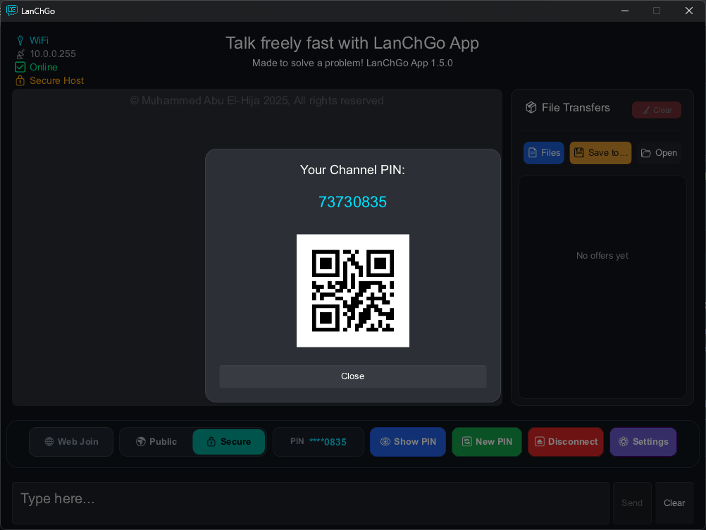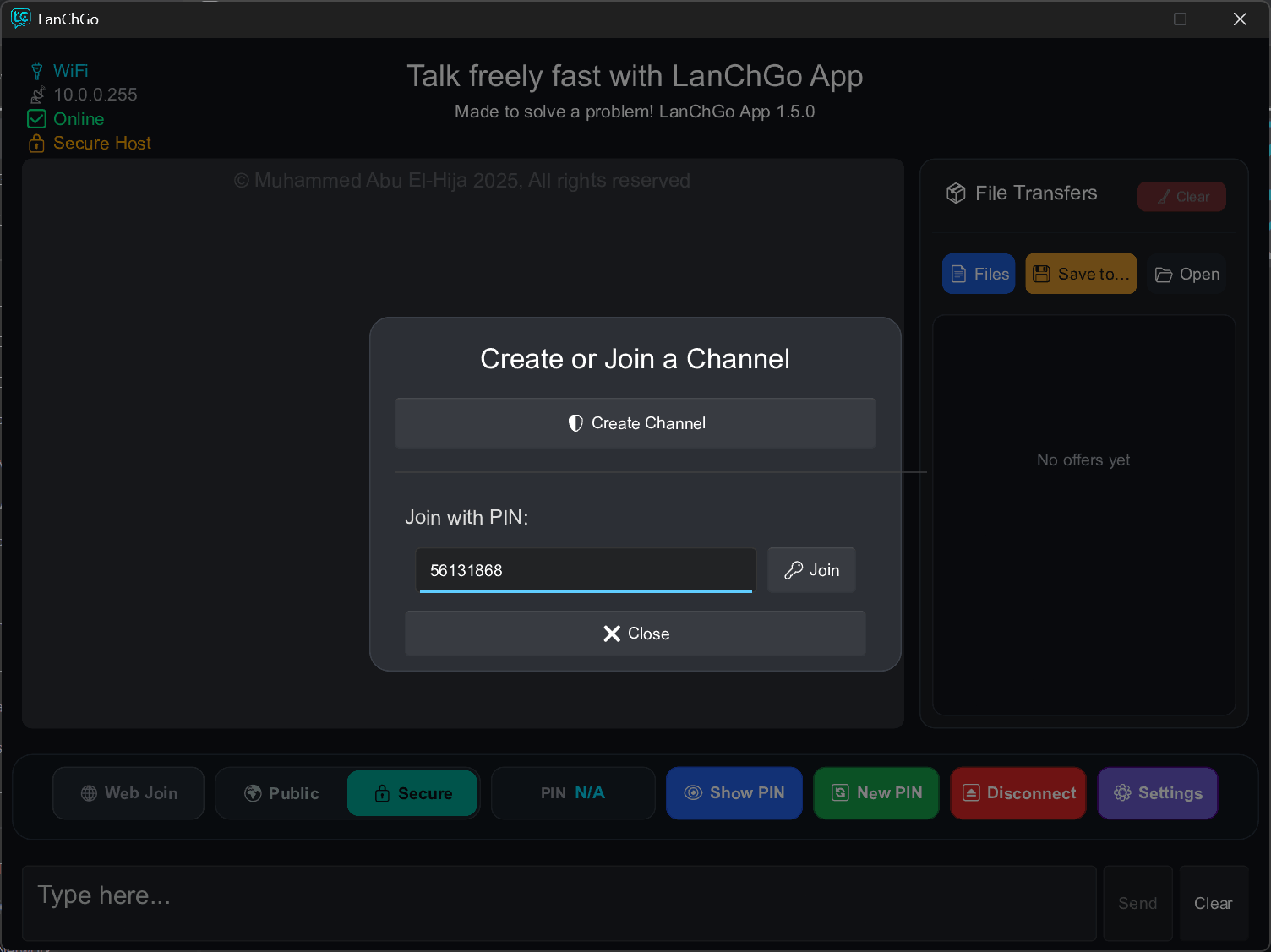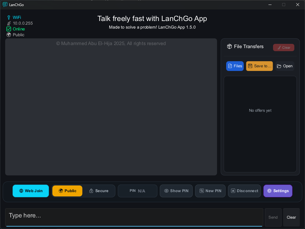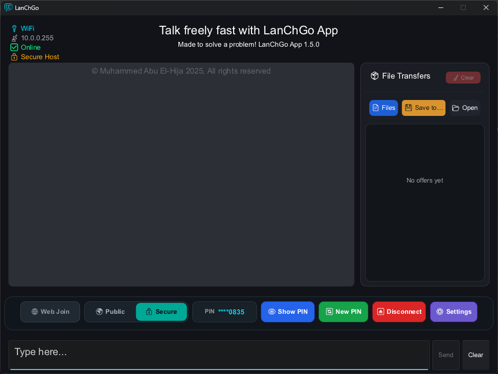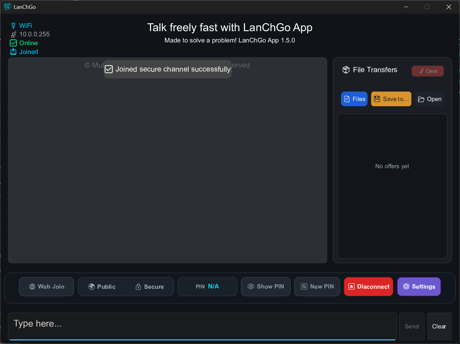 LanChGo is a fast, secure local area network (LAN) chat application designed for Windows, Android and Browser-Based. It enables you to communicate instantly over your local network without the need for an internet connection, external servers, or account registrations. You can maintain your privacy while chatting and sharing information with other users on the same network with secure channel, making it an ideal tool for environments where speed, efficiency and security are priorities.