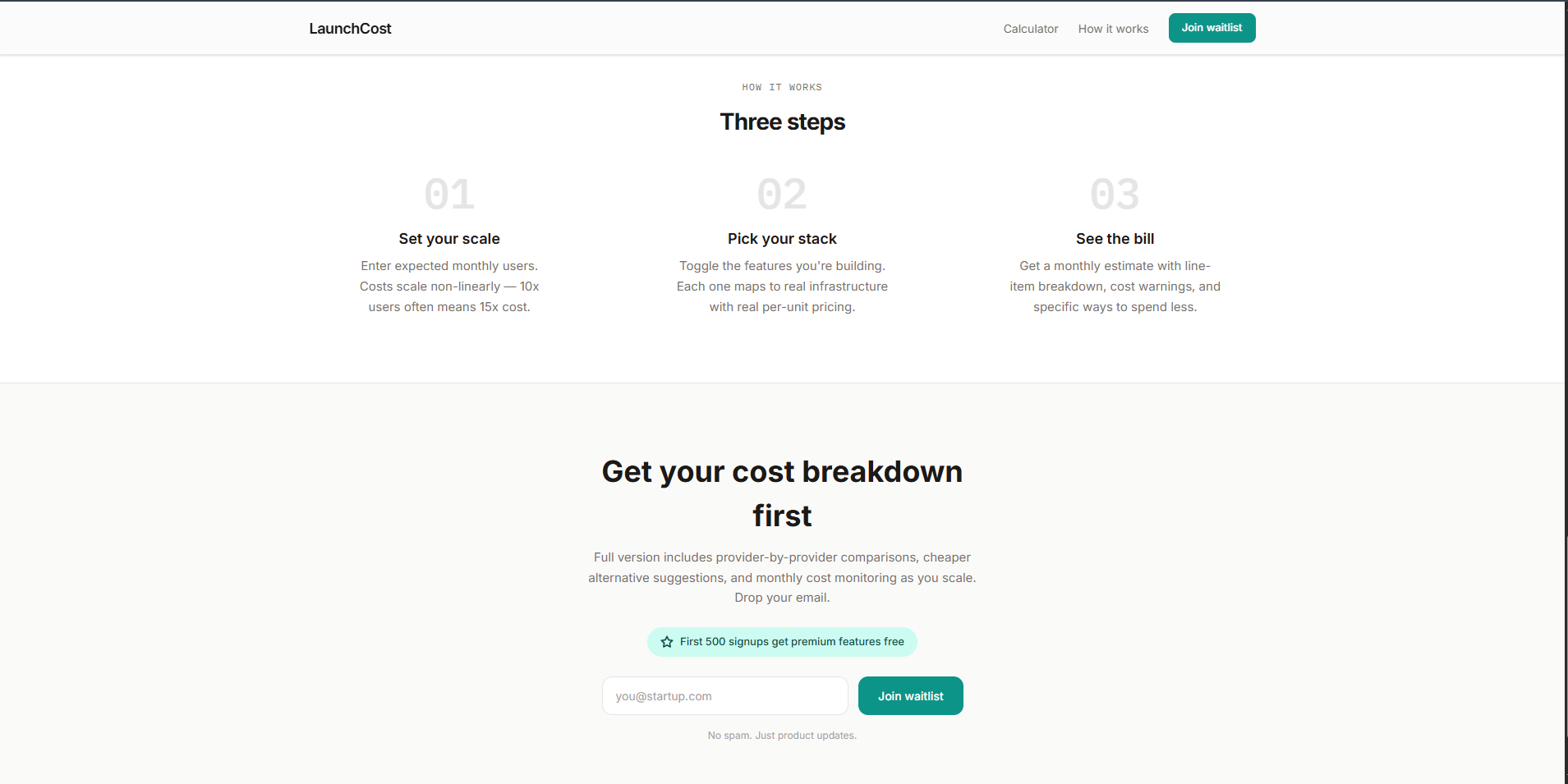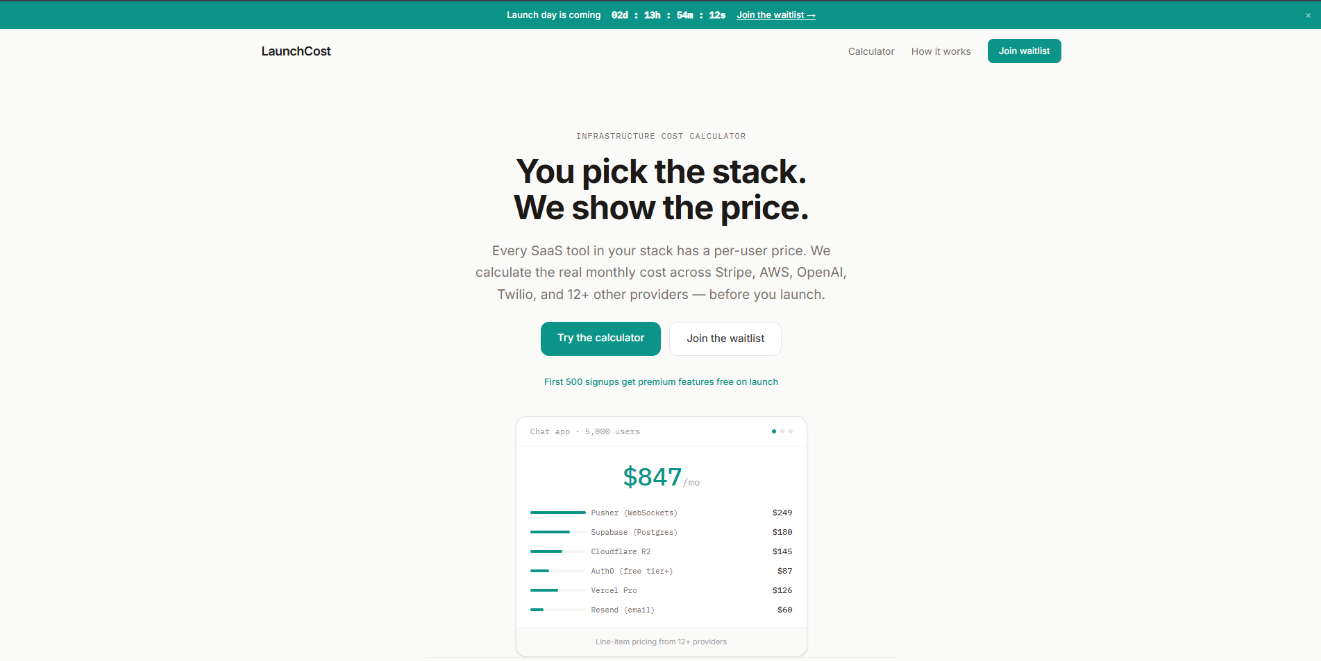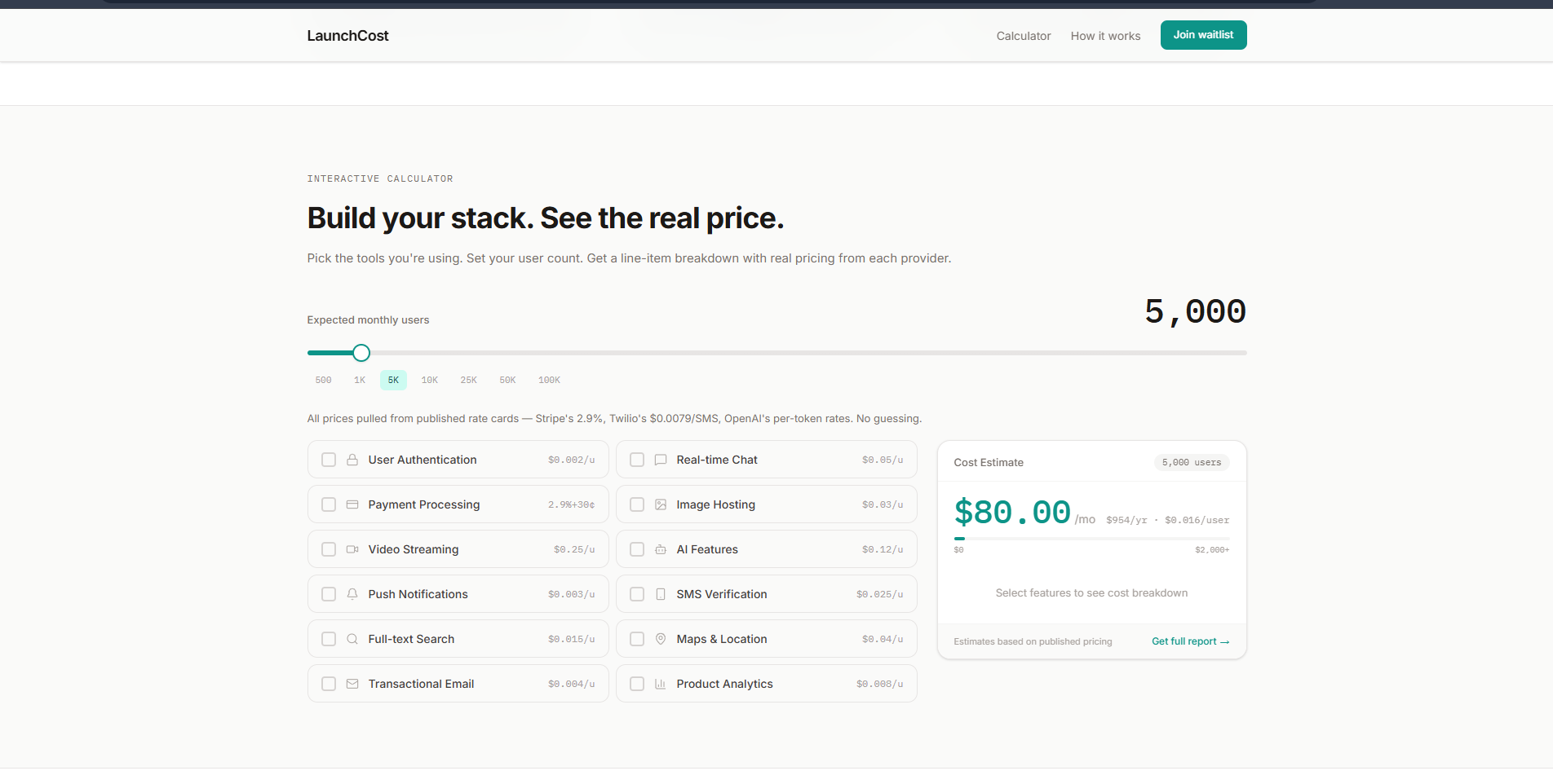 Built a free tool that shows your real monthly costs based on your actual stack Stripe, AWS, OpenAI, Twilio, etc, all with real constantly updated pricing. launchcost.org First 500 signups get premium features free on launch.