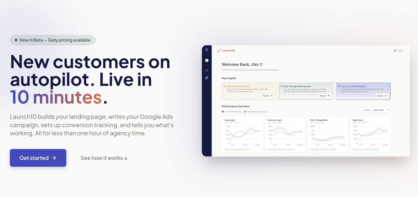 Launch10 is a full-funnel customer acquisition system for founders and their teams. Unlike landing page builders that stop at the page, Launch10 handles everything: landing page creation, ads campaign setup, conversion tracking, and performance analytics, all connected automatically. Describe your business. We build your funnel. Go live in 10 minutes. Then see exactly which ads bring customers and which waste money, so you can get back to building your product. Core features: - Landing page + Google Ads campaign built in 10 minutes - Conversion tracking configured automatically - Every lead traced back to the ad that brought them - Plain-English performance dashboard - Pages optimized for Google, ChatGPT, and Perplexity - Lead capture with CRM export - Unlimited team members included Starting at $59/month.