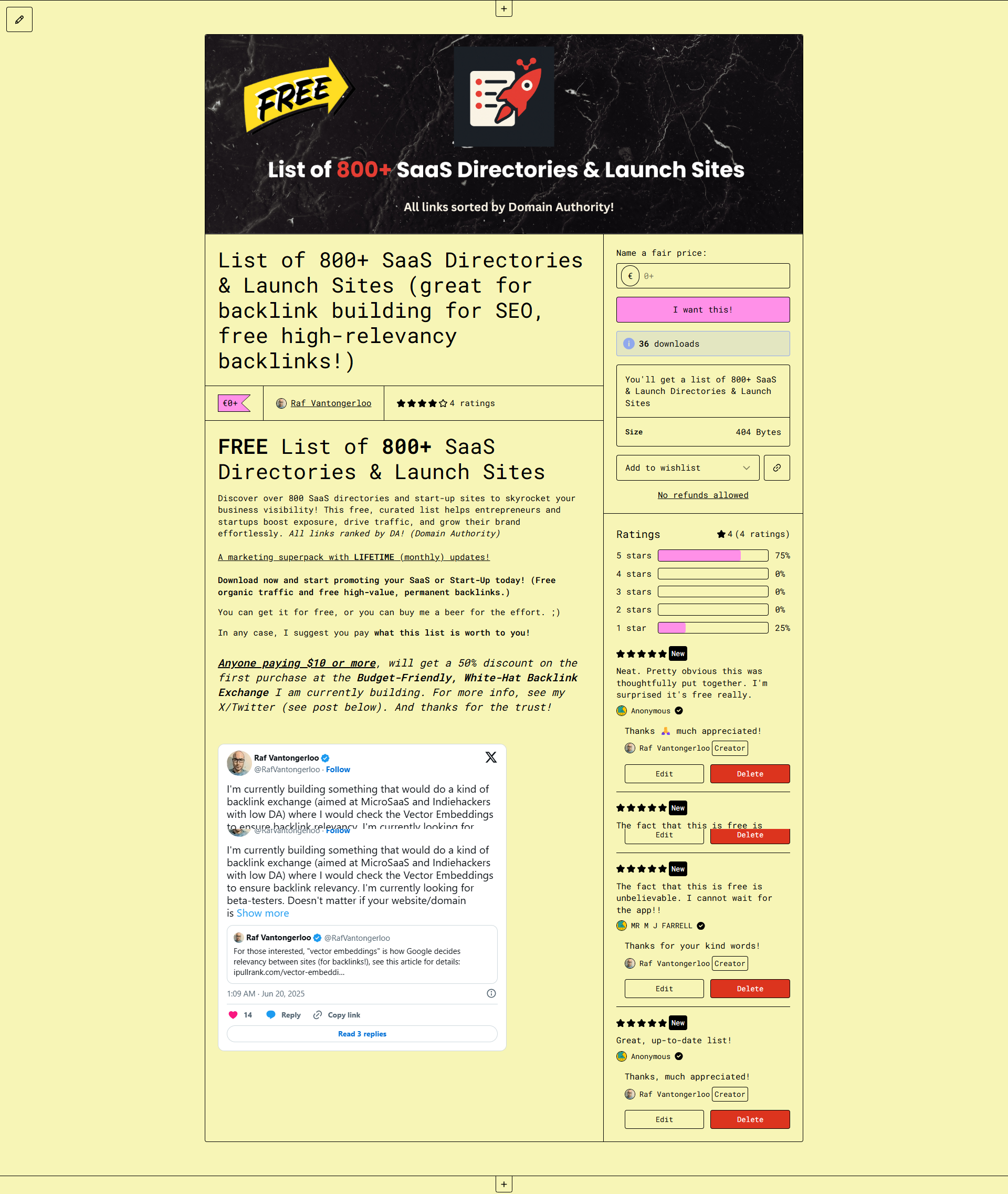 Discover 800+ SaaS directories and 50+ launch sites to skyrocket your SEO! (free traffic and backlinks) All links ranked by DA! Download now and start promoting your SaaS today! Best part? Pay whatever it's worth to you!
