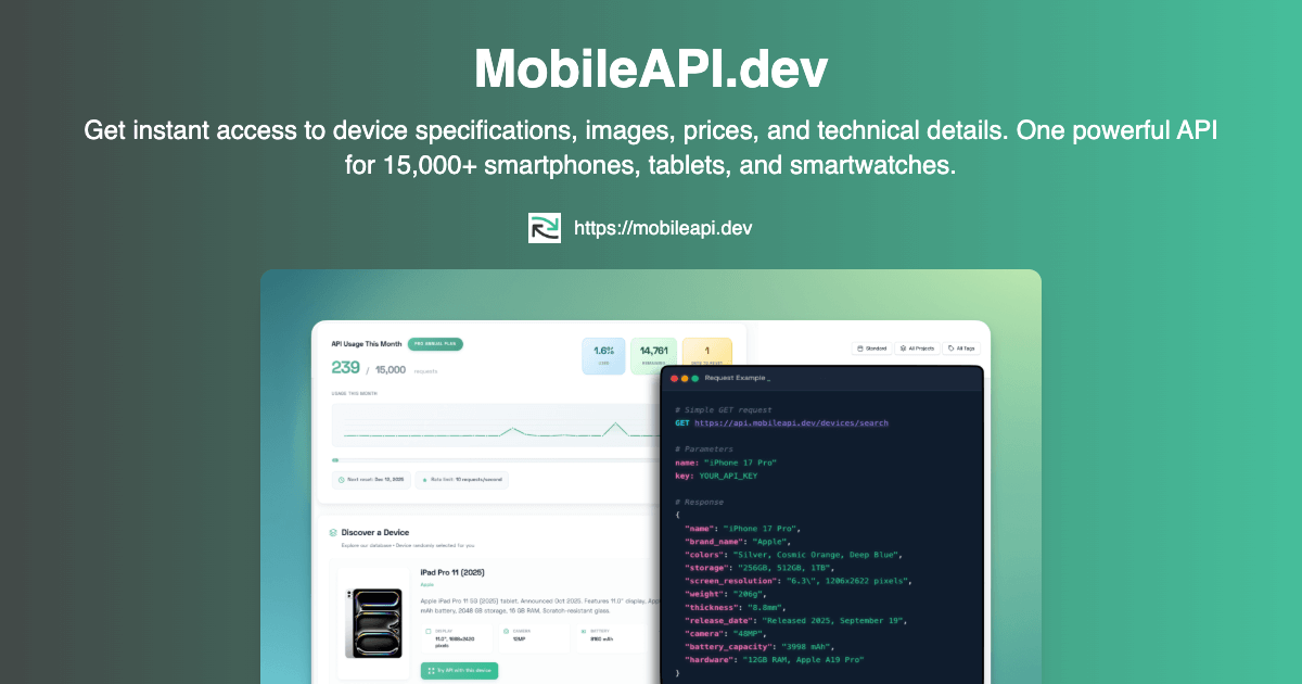 Integrate 31,000+ device specs and images into your apps. Access reliable hardware data for developers and startups with freemium plans starting at $15.