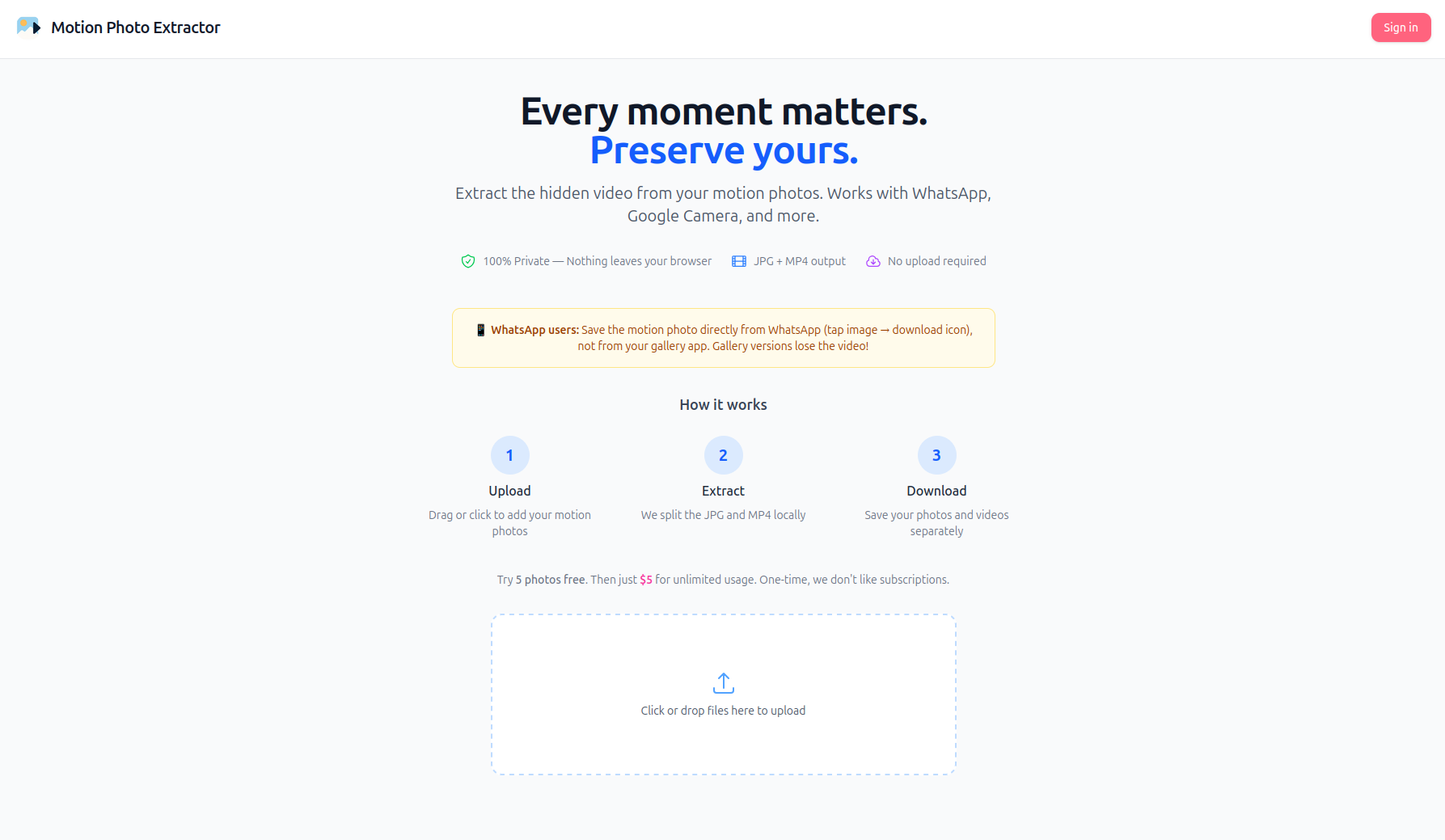 Motion Photo Extractor is a private, browser-based tool designed to help you separate the static and video components of your motion photos. You can easily extract both JPG and MP4 files from images captured using WhatsApp motion photos or Google Top Shot. Because the extraction process happens entirely within your web browser, your files remain private and are not uploaded to a remote server.