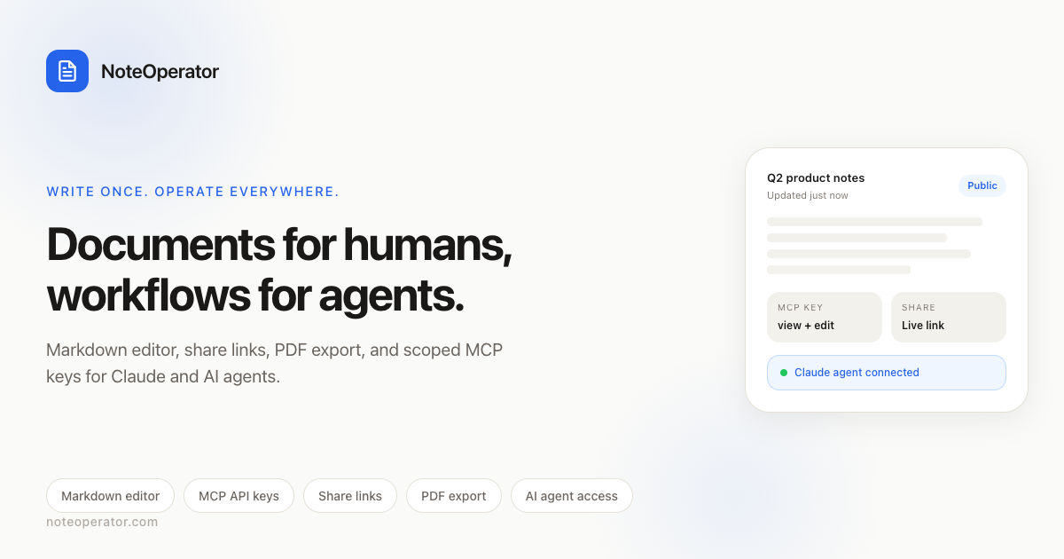 Connect AI agents to your workflow via MCP API keys. Write Markdown, share links, and export PDFs for free. Perfect for developers and technical writers.