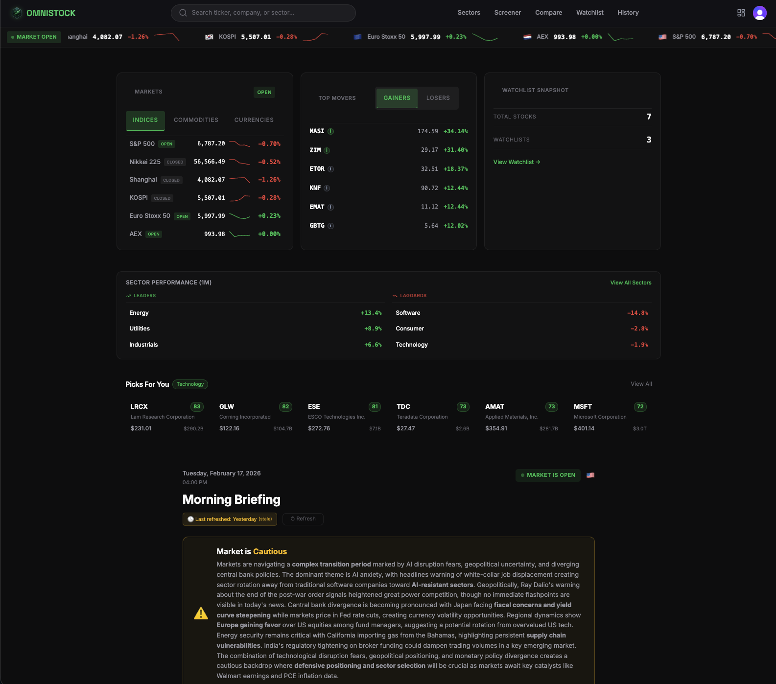 Research over 1,500 stocks with a free screener and AI analysis. Perfect for founders and solopreneurs seeking professional market briefings and watchlists.