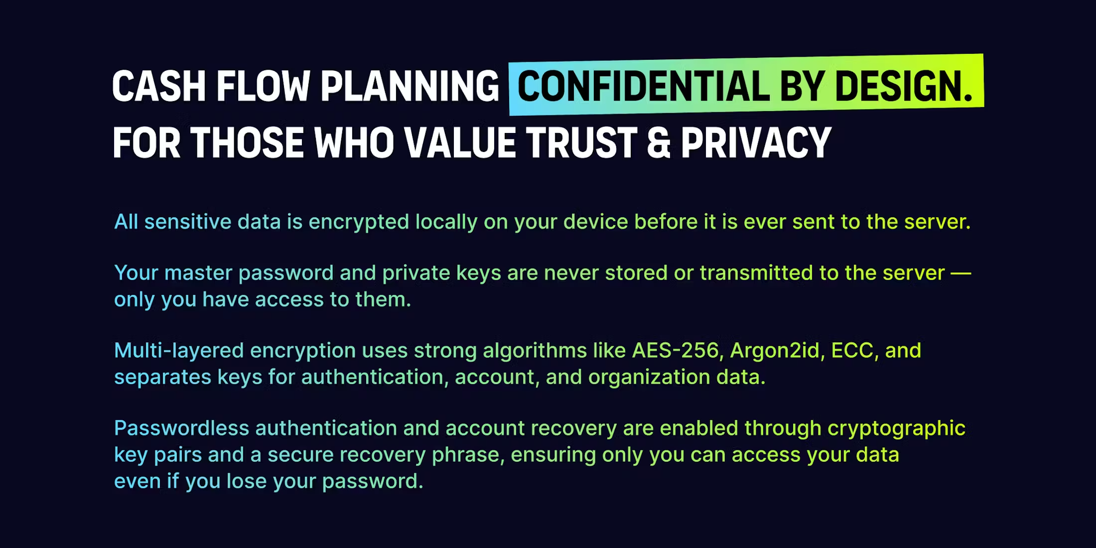 Secure your financial future with and end-to-end encrypted cash flow planning app. Manage multiple currencies offline for solopreneurs and freelancers.