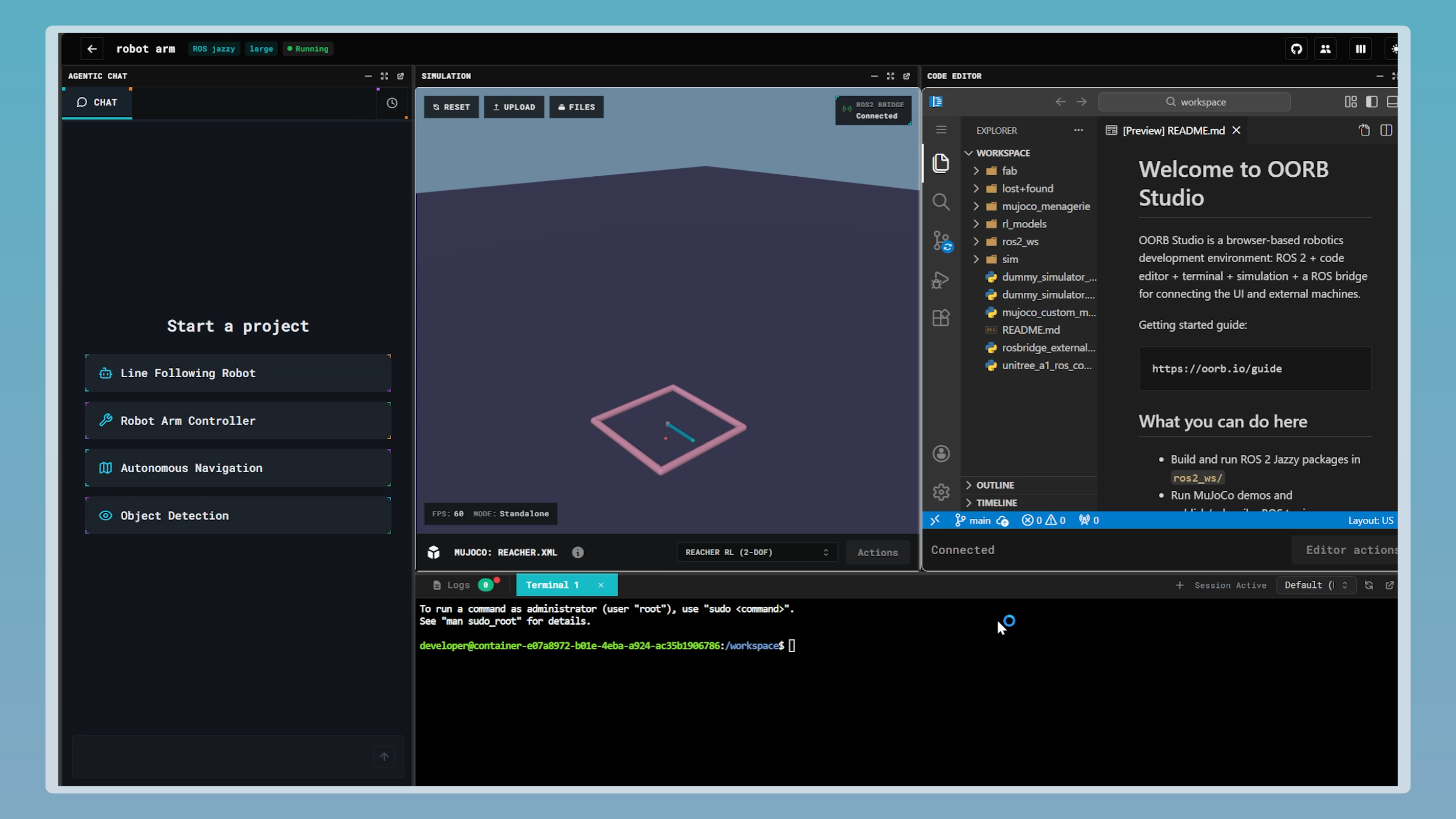 OORB Studio is an agentic, browser-based workspace for ROS 2 robotics. Describe the robot in plain English → get a plan → apply changes to the repo → run MuJoCo simulation → push to GitHub and collaborate with your team. Built for the messy reality of robotics dev: reproducible environments, fast iteration, and a tight feedback loop with builders