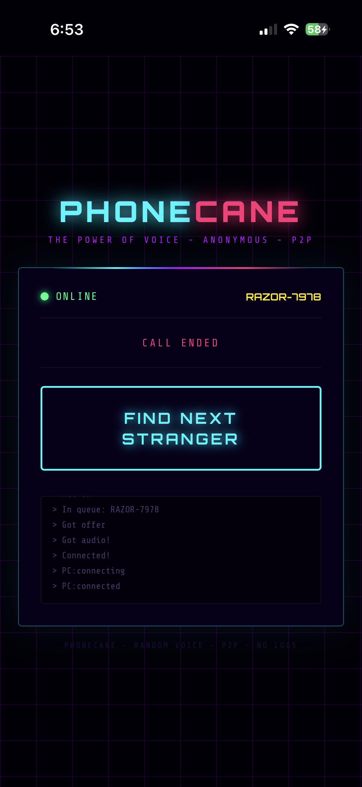 PhoneCane connects you instantly with a random stranger for an anonymous voice call. No signup. No name. No history. Just press the button and talk. Built with WebRTC for true peer-to-peer audio and Firebase for real-time matchmaking. Works in Safari on iPhone and Chrome on Android. No app download required. The antidote to silent scrolling.