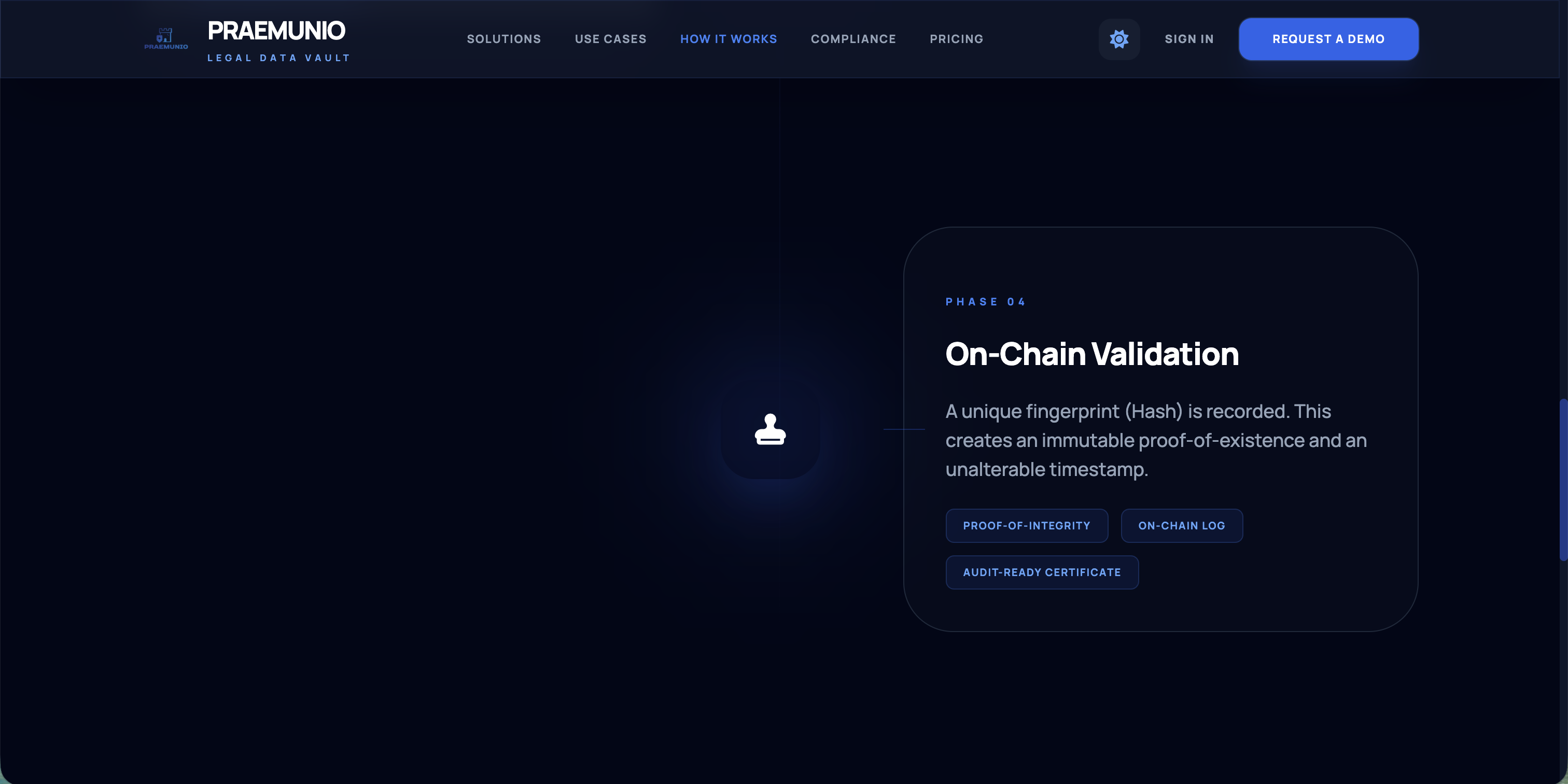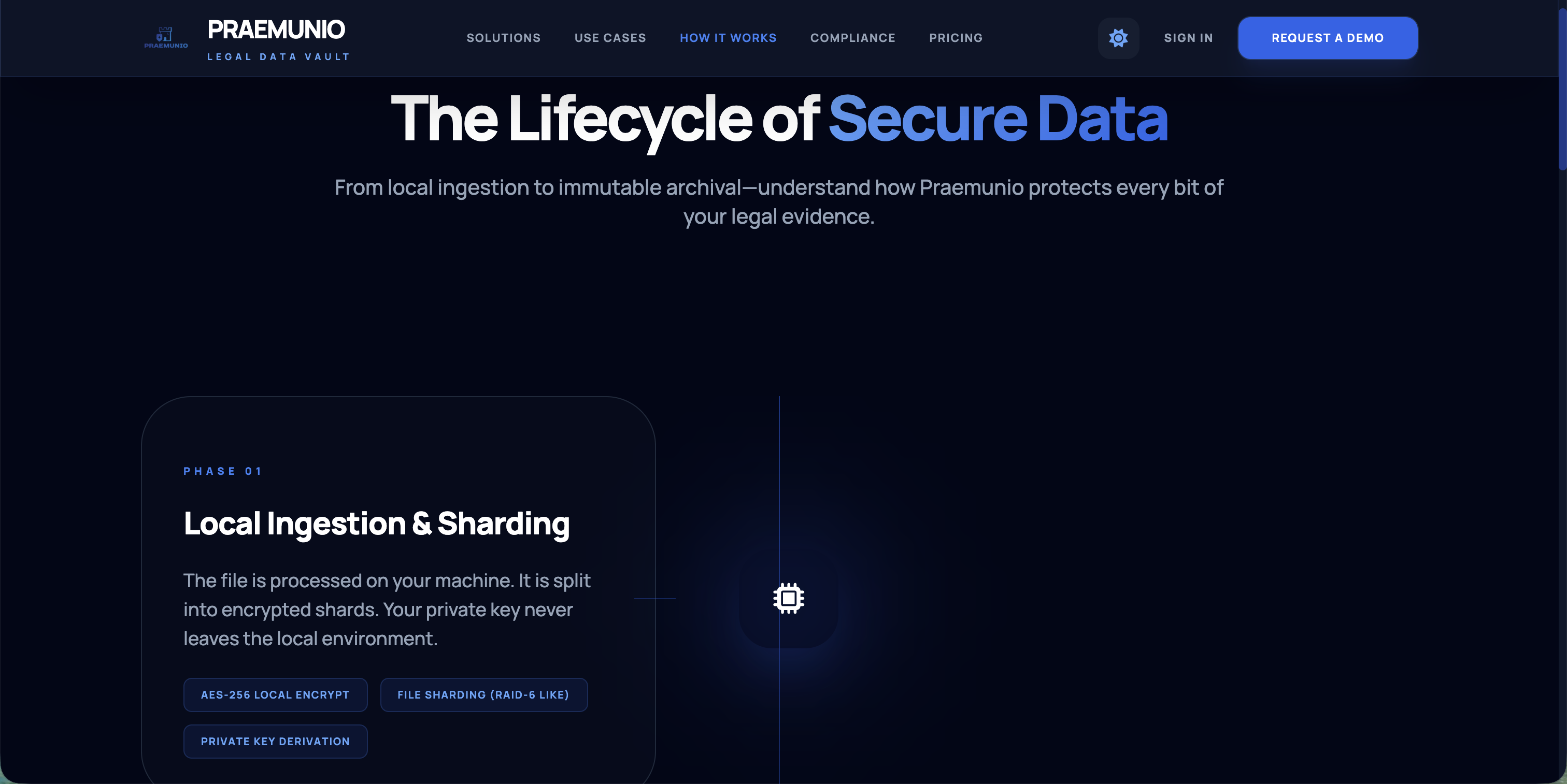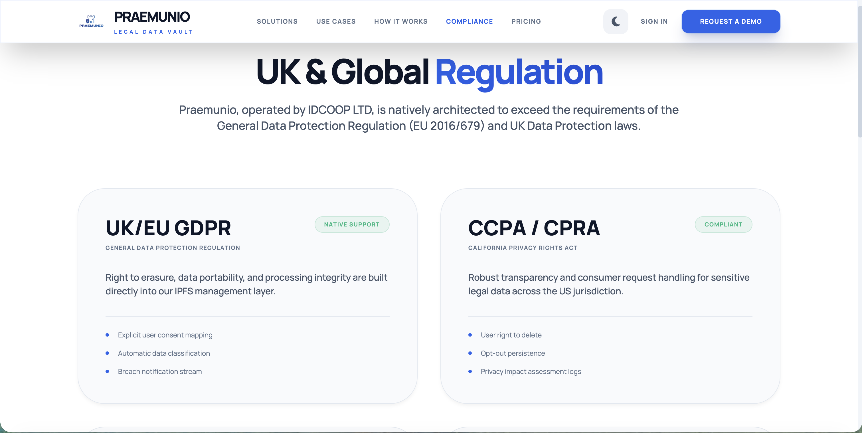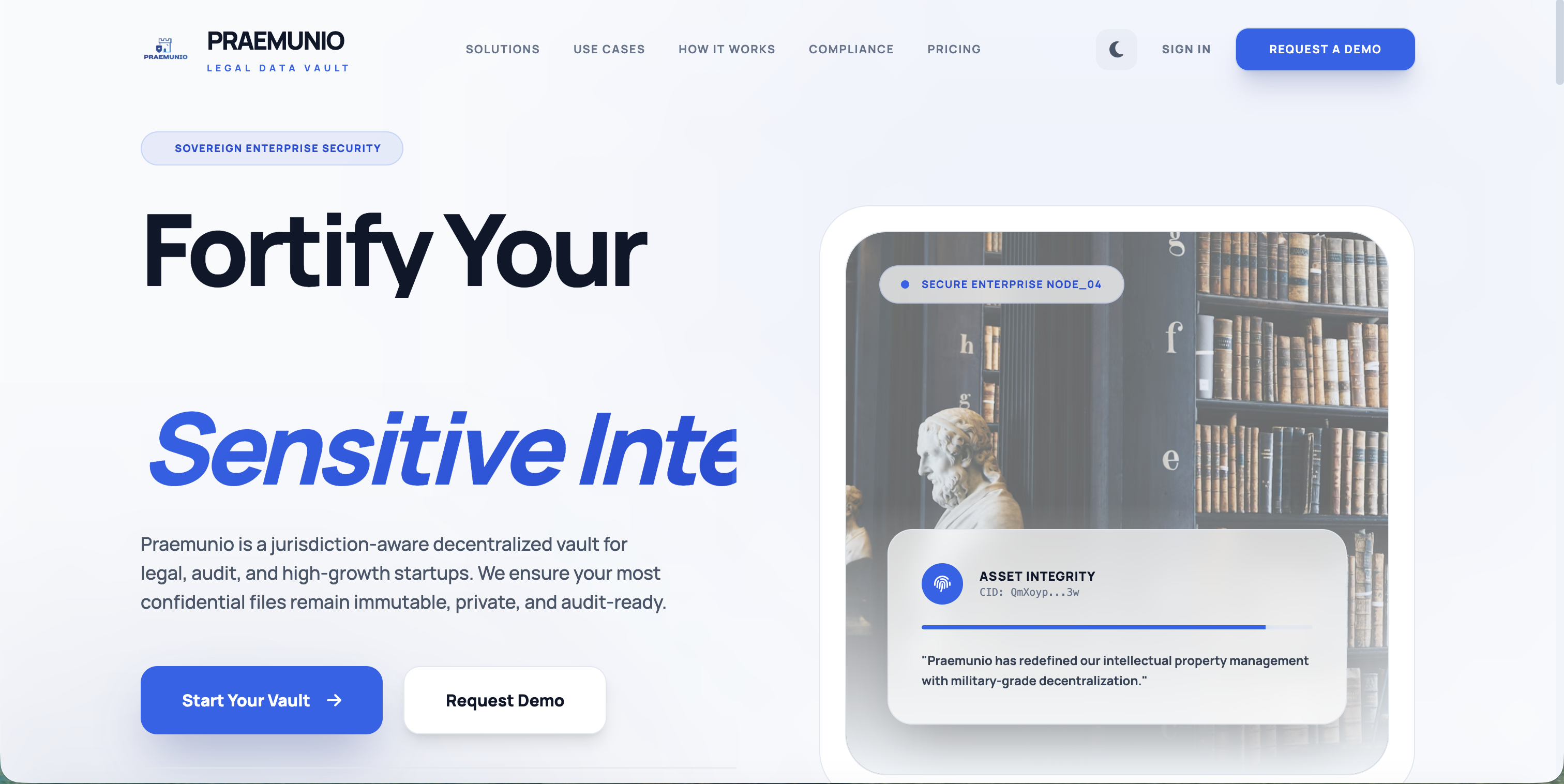 What We Do: We provide a secure haven for your most confidential files—contracts, audit trails, IP, and board materials—ensuring they remain: 🔐 Immutable by Design: Leveraging decentralized technology to create tamper-proof records you can trust implicitly. Once stored, files cannot be altered without leaving a permanent, verifiable trail. 🌍 Jurisdiction-Aware: Our intelligent infrastructure understands and respects data residency requirements. Whether it's GDPR, CCPA, or other regional frameworks, Praemunio helps ensure your data storage and access patterns align with legal obligations. 📋 Always Audit-Ready: We know that for legal and audit professionals, preparation is everything. Our vault is built to make compliance checks seamless, with clear, verifiable logs and controlled access.