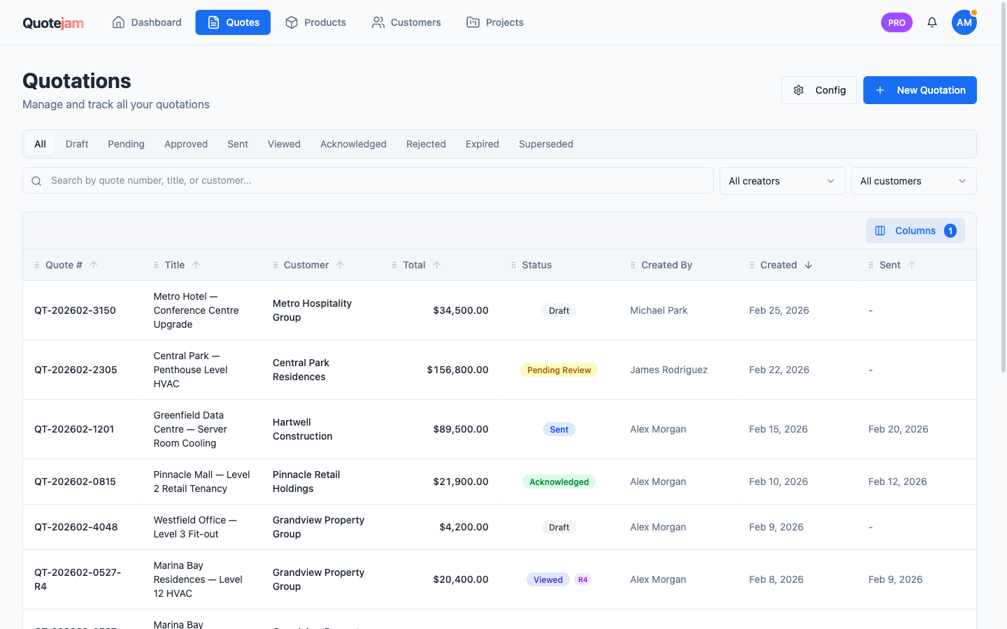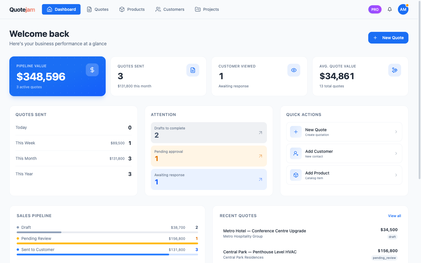 Quotejam helps B2B product businesses create professional quotes in minutes. You can manage a real product catalog with full specifications, implement approval workflows, and provide customers with a dedicated portal. The platform allows you to generate branded PDFs and streamline your entire quoting process to win more deals efficiently.
