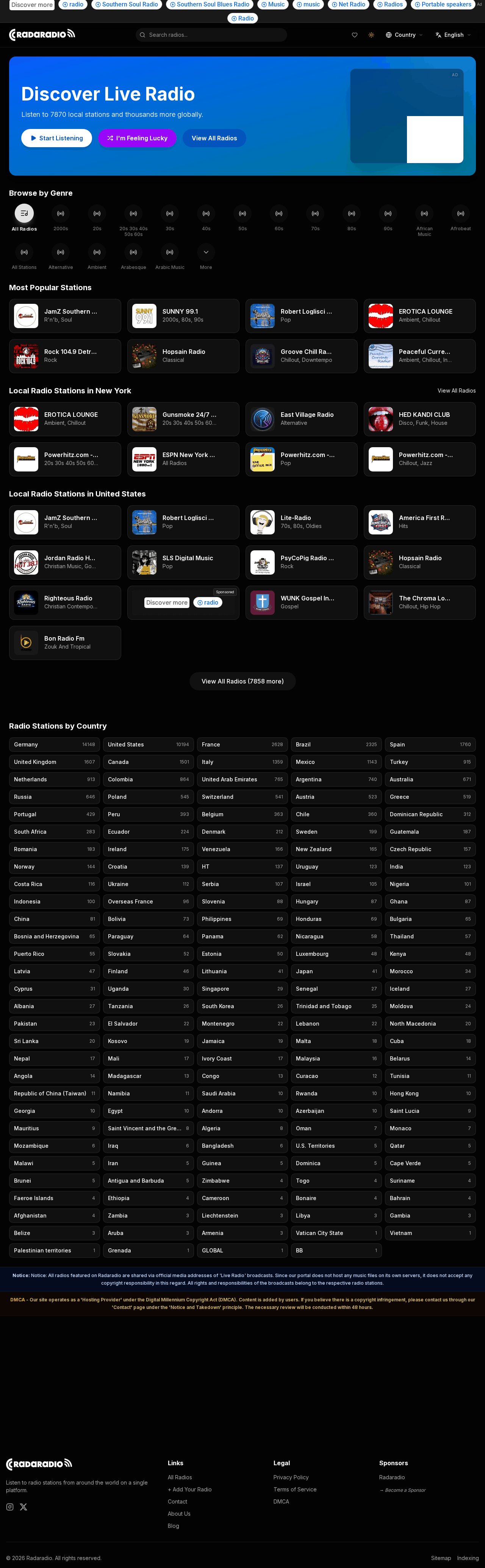 Radaradio allows you to access thousands of live radio stations from across the globe in one convenient location. You can enjoy free, high-quality audio streaming from your favorite stations regardless of your location. This platform helps you discover new music, news, and talk shows through an intuitive interface designed for seamless online listening.