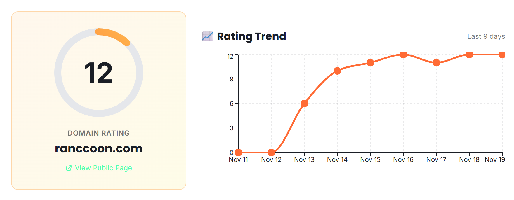 Ranccoon is a free DR monitoring tool for website owners. You can track your Domain Rating (DR) automatically every day. This tool allows you to monitor multiple domains, set goals for your DR, and receive notifications when your Domain Rating changes. It helps you stay informed about the performance of your websites without manual checking.