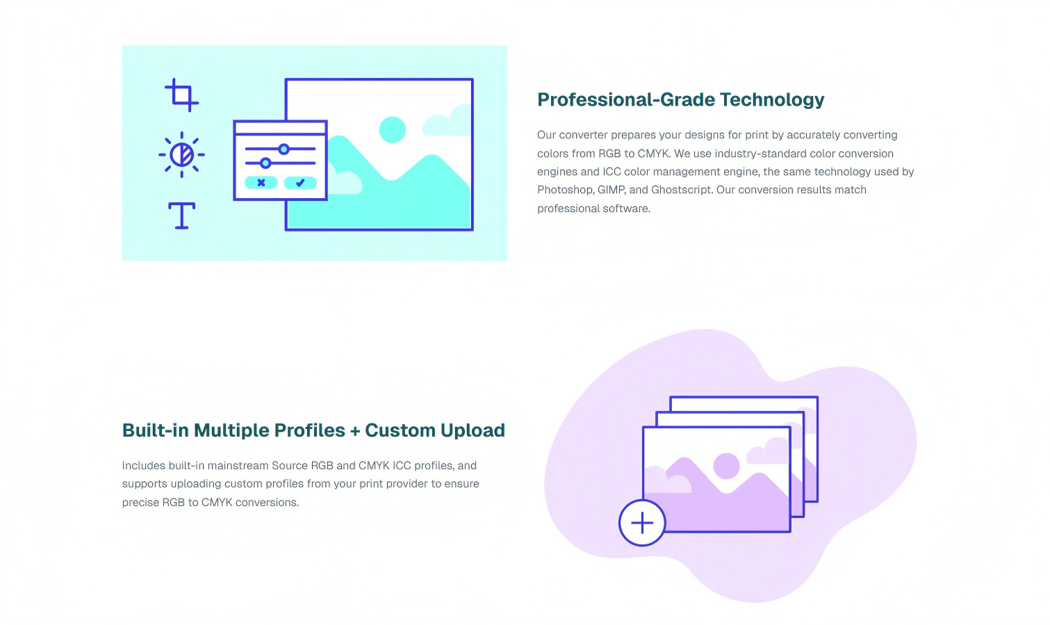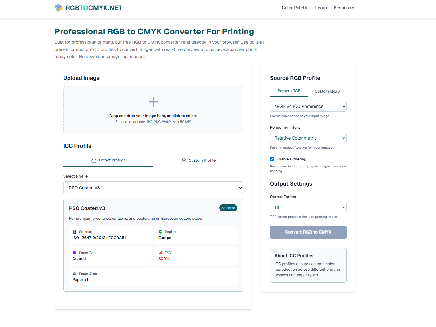 You can transform your digital images for professional print production using this reliable online converter. This tool allows you to convert RGB colors to CMYK accurately, ensuring your final prints match your digital vision. You have the flexibility to use built-in industry-standard settings or upload your own custom ICC profiles for specialized requirements. With the real-time preview feature, you can monitor color adjustments instantly to achieve perfect color matching for all your design projects.