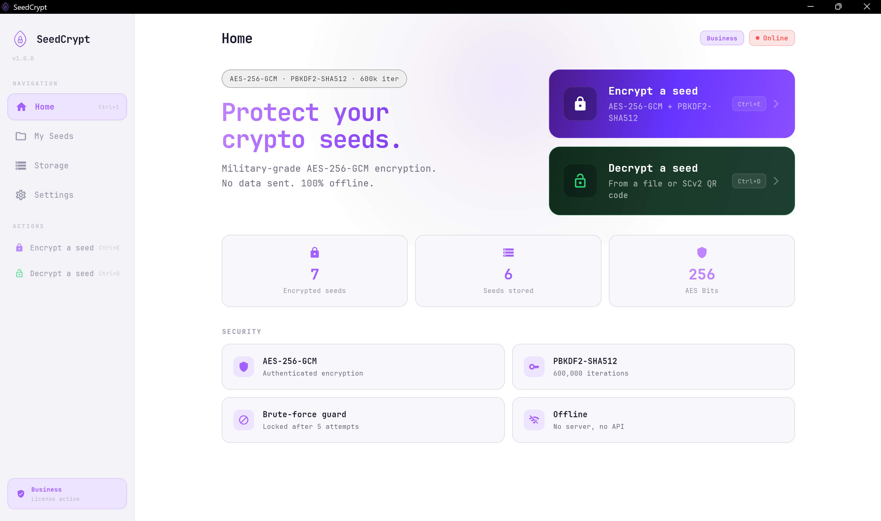 Secure your seed phrases with AES-256 encryption on USB or external disks. One-time payment for agencies and developers. No cloud or network required.