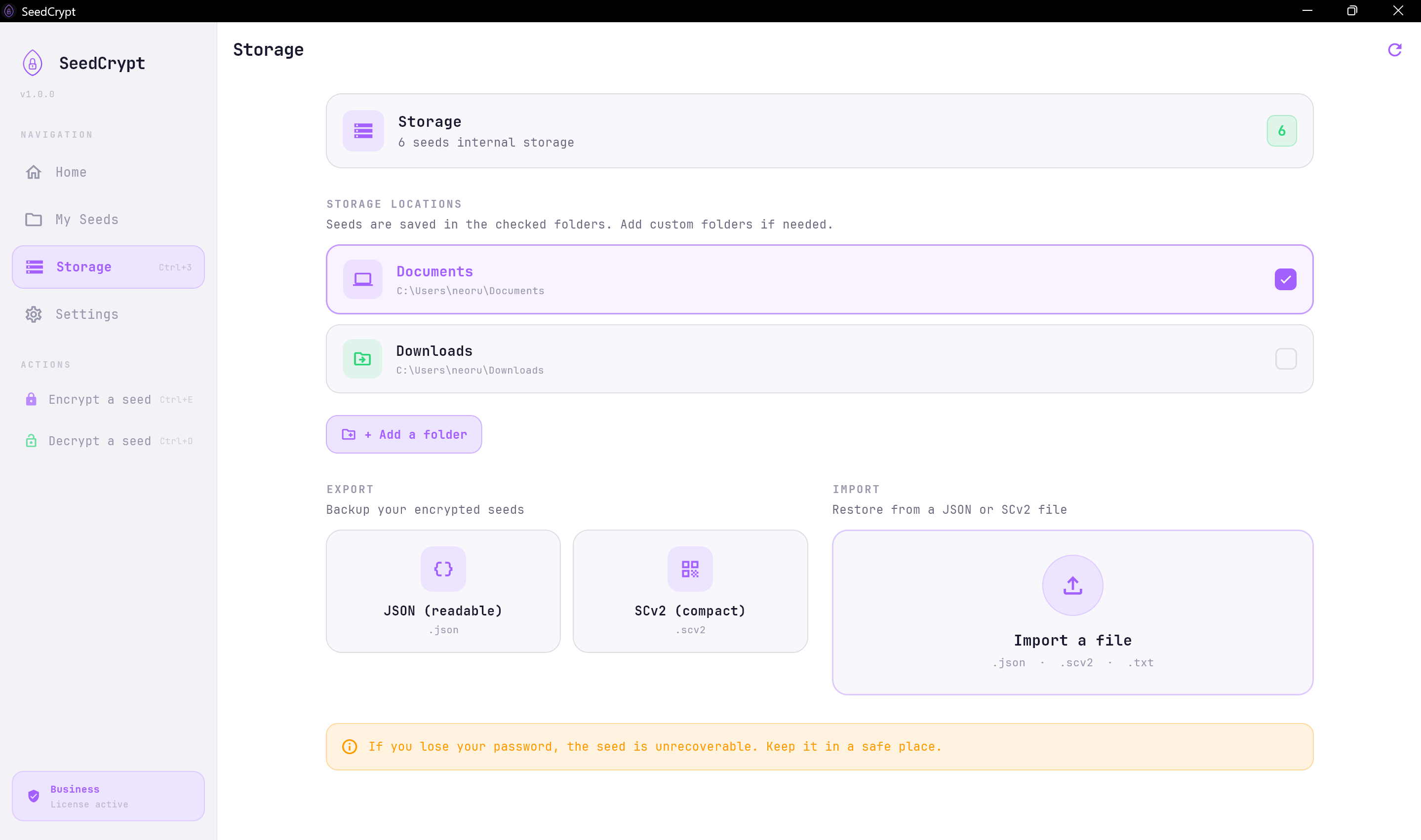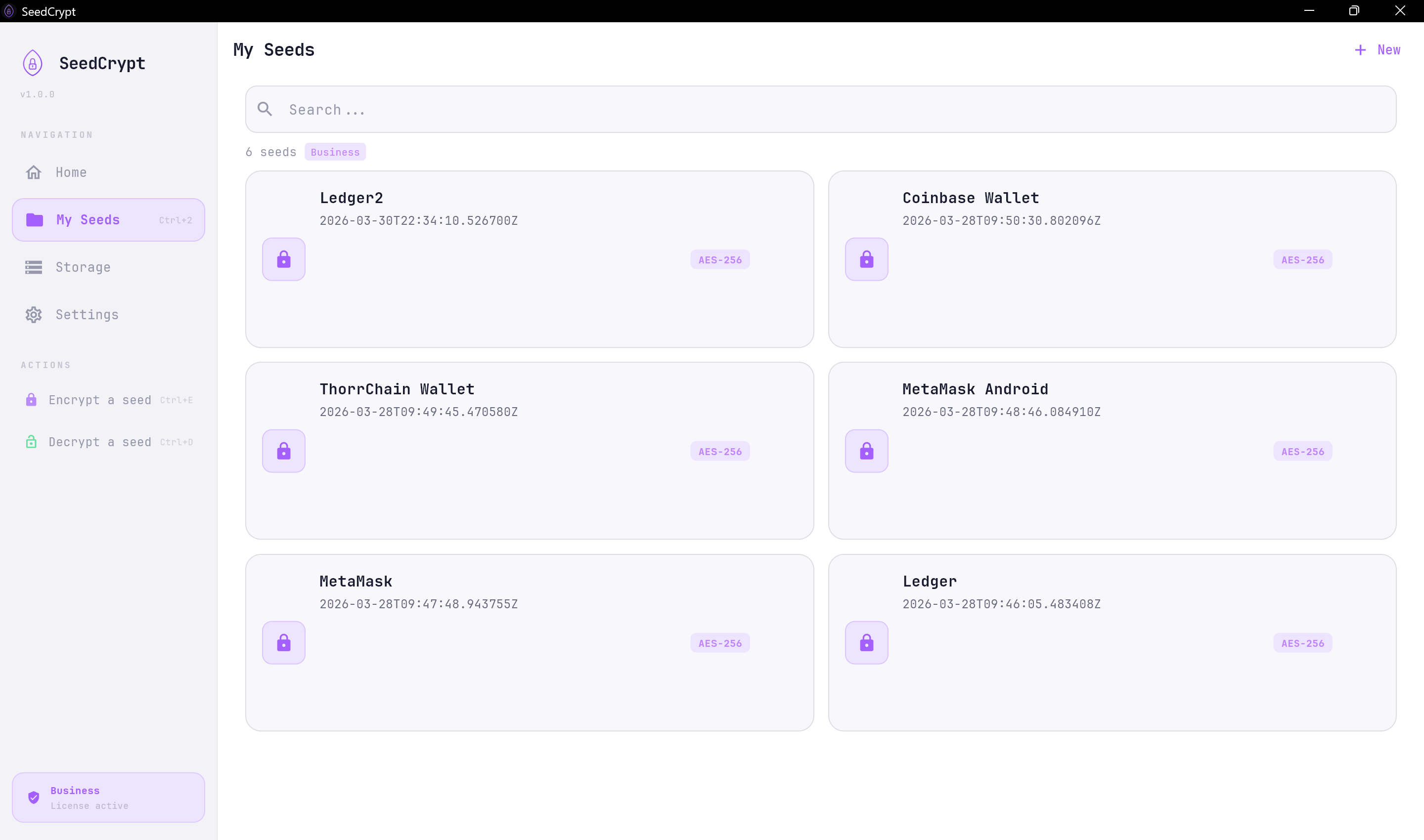 Encryption algorithm : AES-256-GCM + PBKDF2-SHA512. Store and manage your seed phrases offline on USB or external disk. Zero cloud. Zero network. Windows & Android.