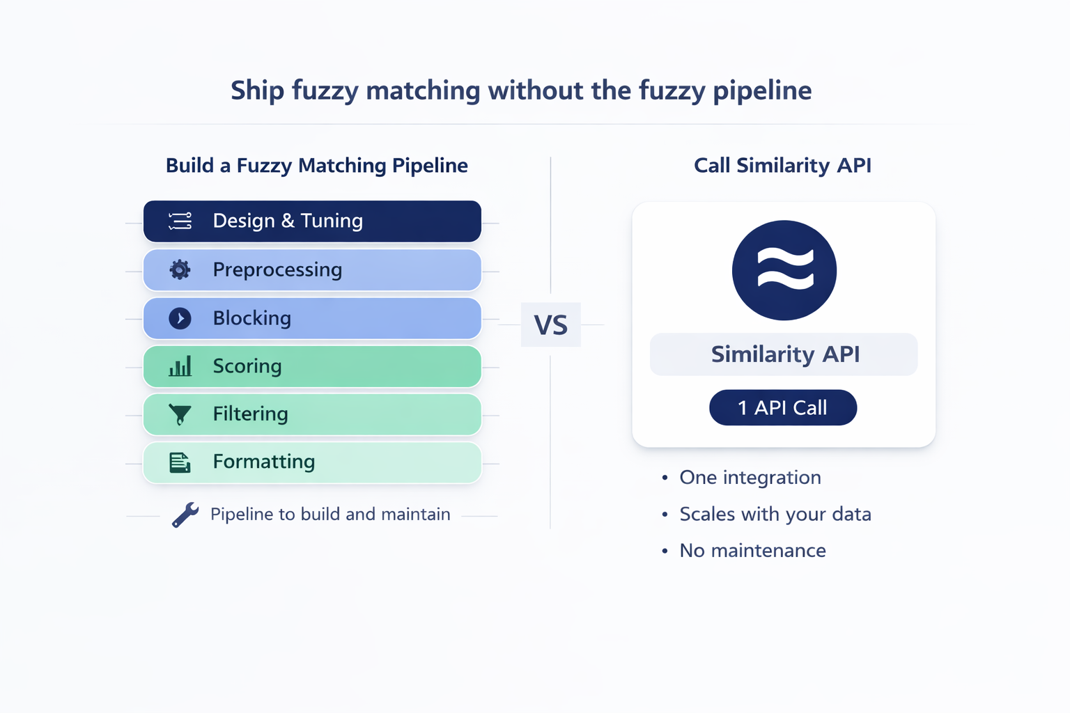 Similarity API helps teams ship scalable fuzzy matching, deduplication, and record reconciliation for messy data workflows without building and maintaining their own pipeline. It handles preprocessing, candidate generation, scoring, and output formatting for use cases like CRM cleanup, cross-system matching, and large-scale deduplication.