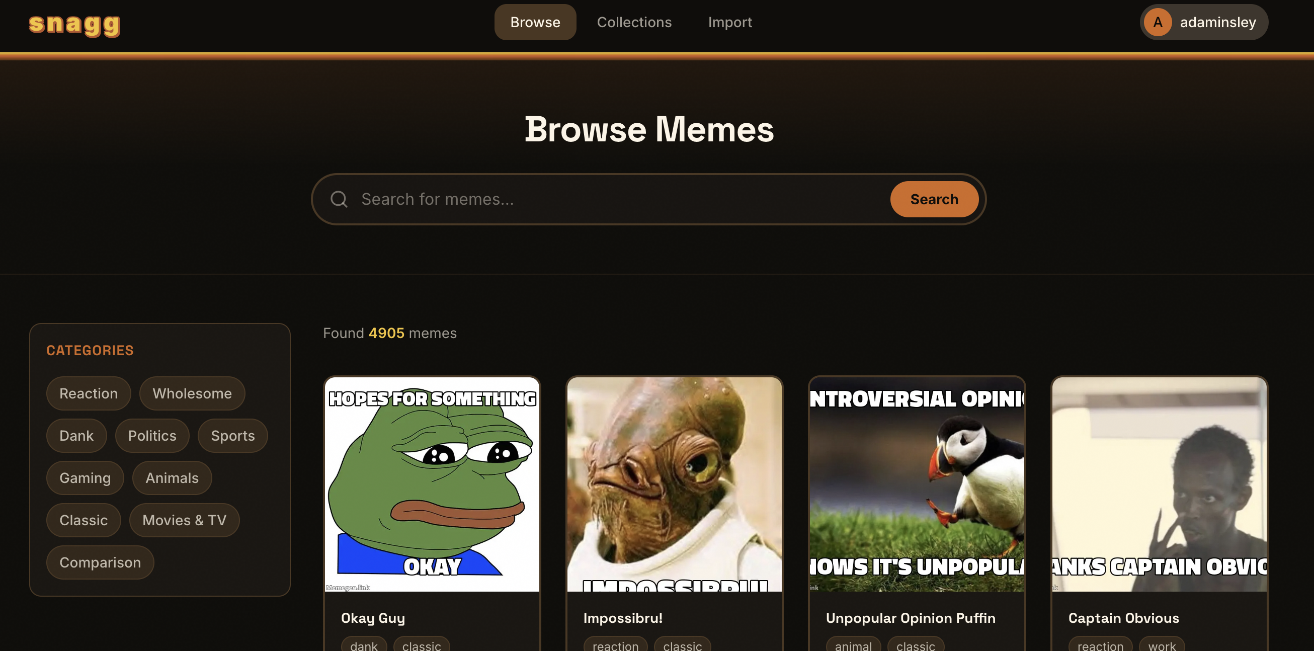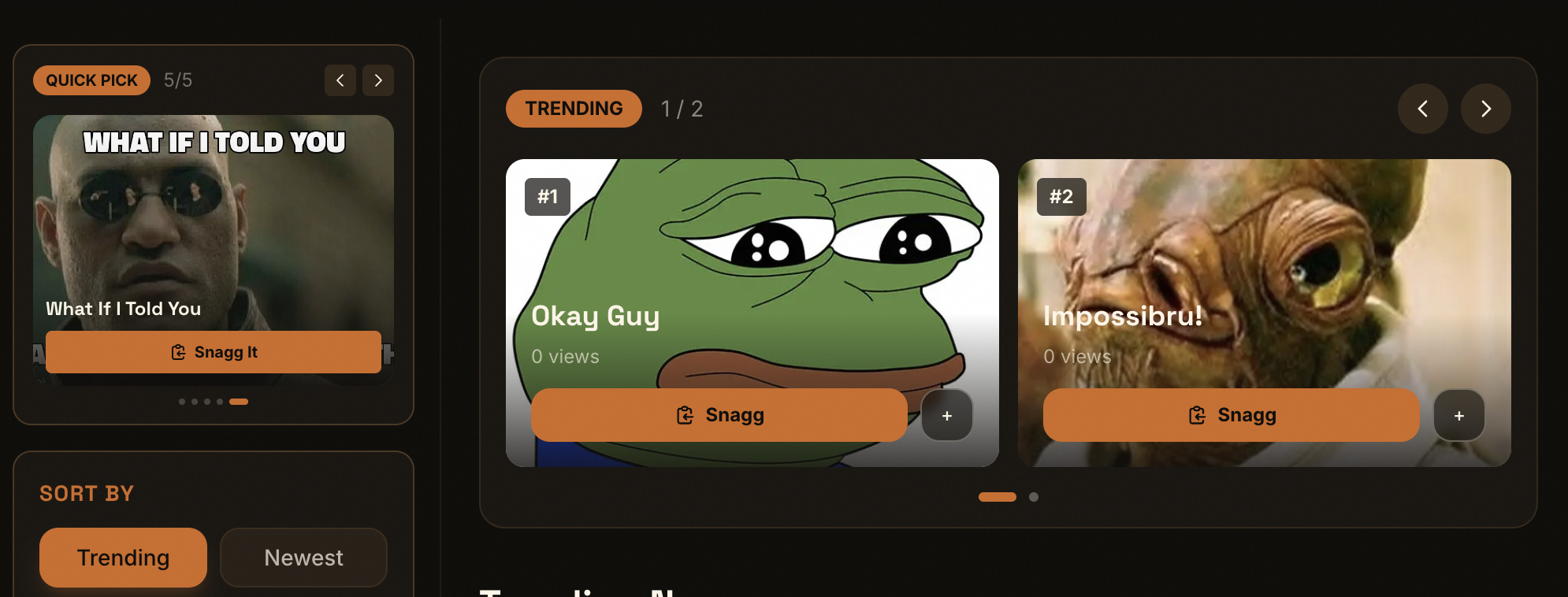 Whether you're reacting in a group chat, posting on social media, or just need the right meme for the moment, Snagg gets you there faster than scrolling through your camera roll.